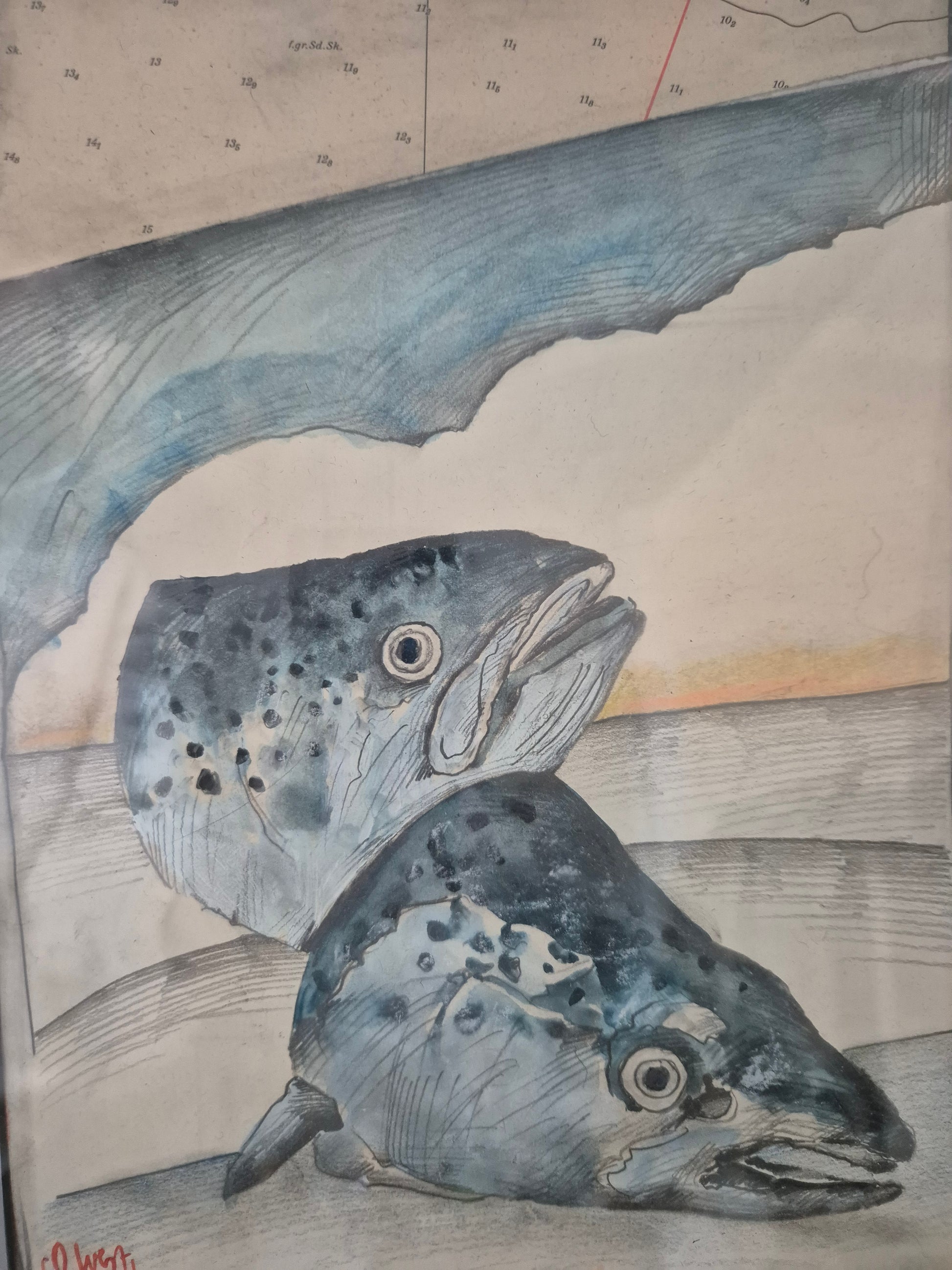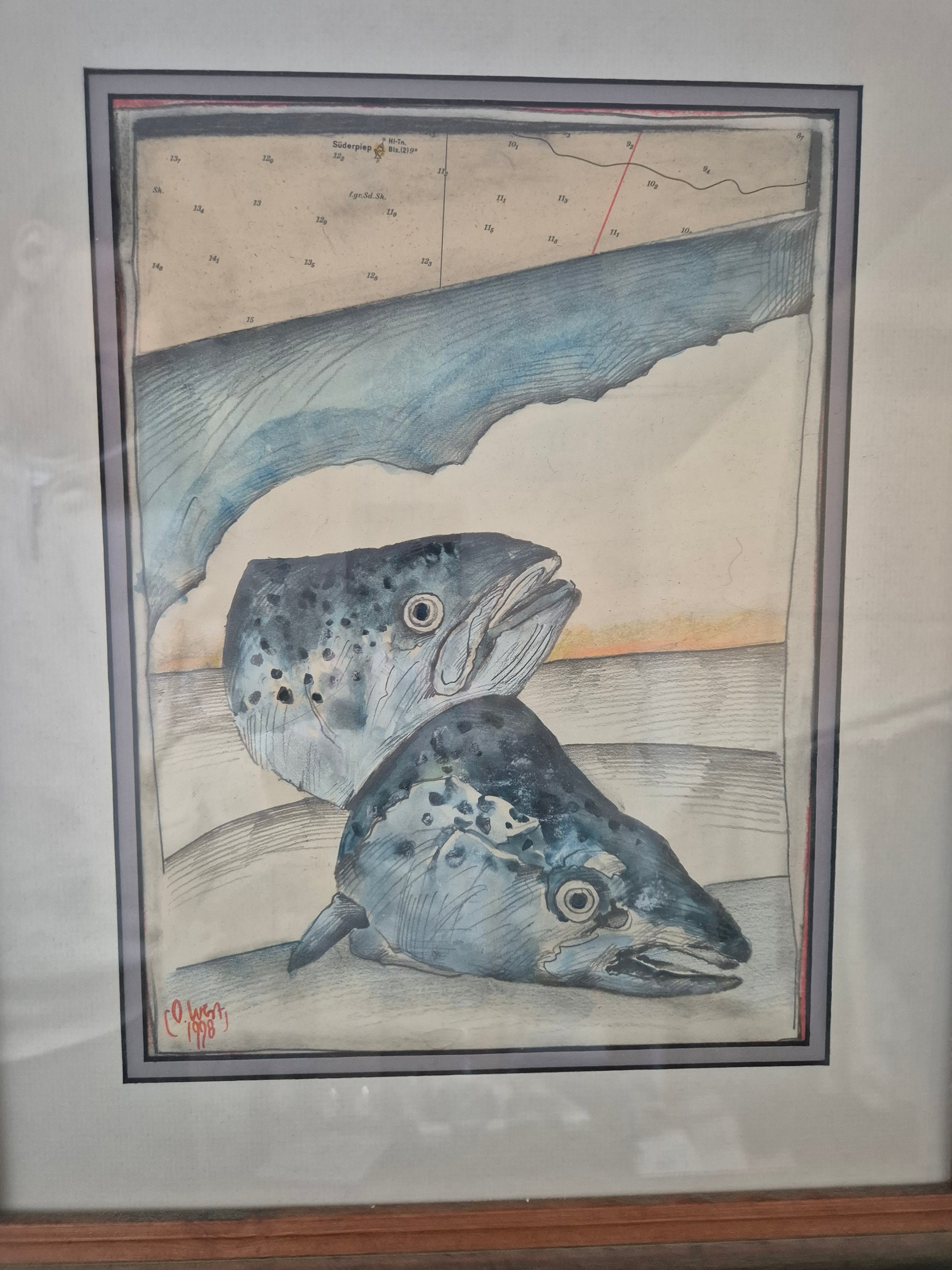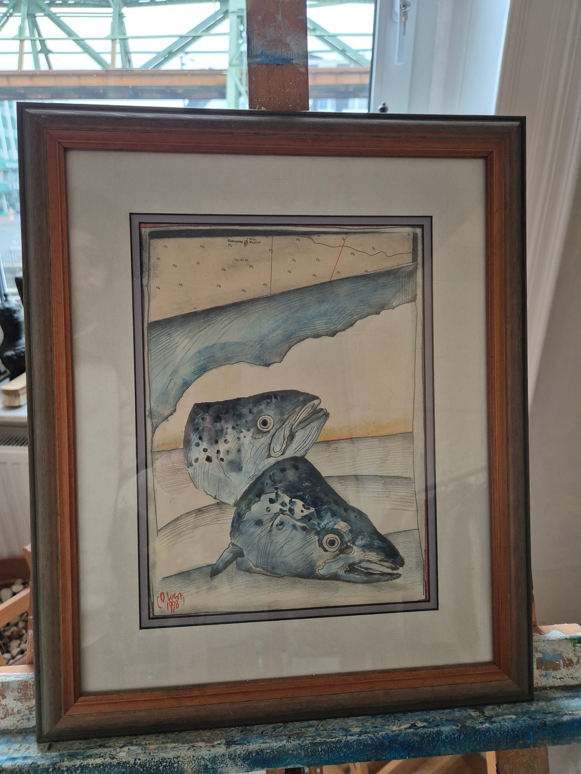 Ole West (1998) Aquarell Malerei zwei Fischköpfe