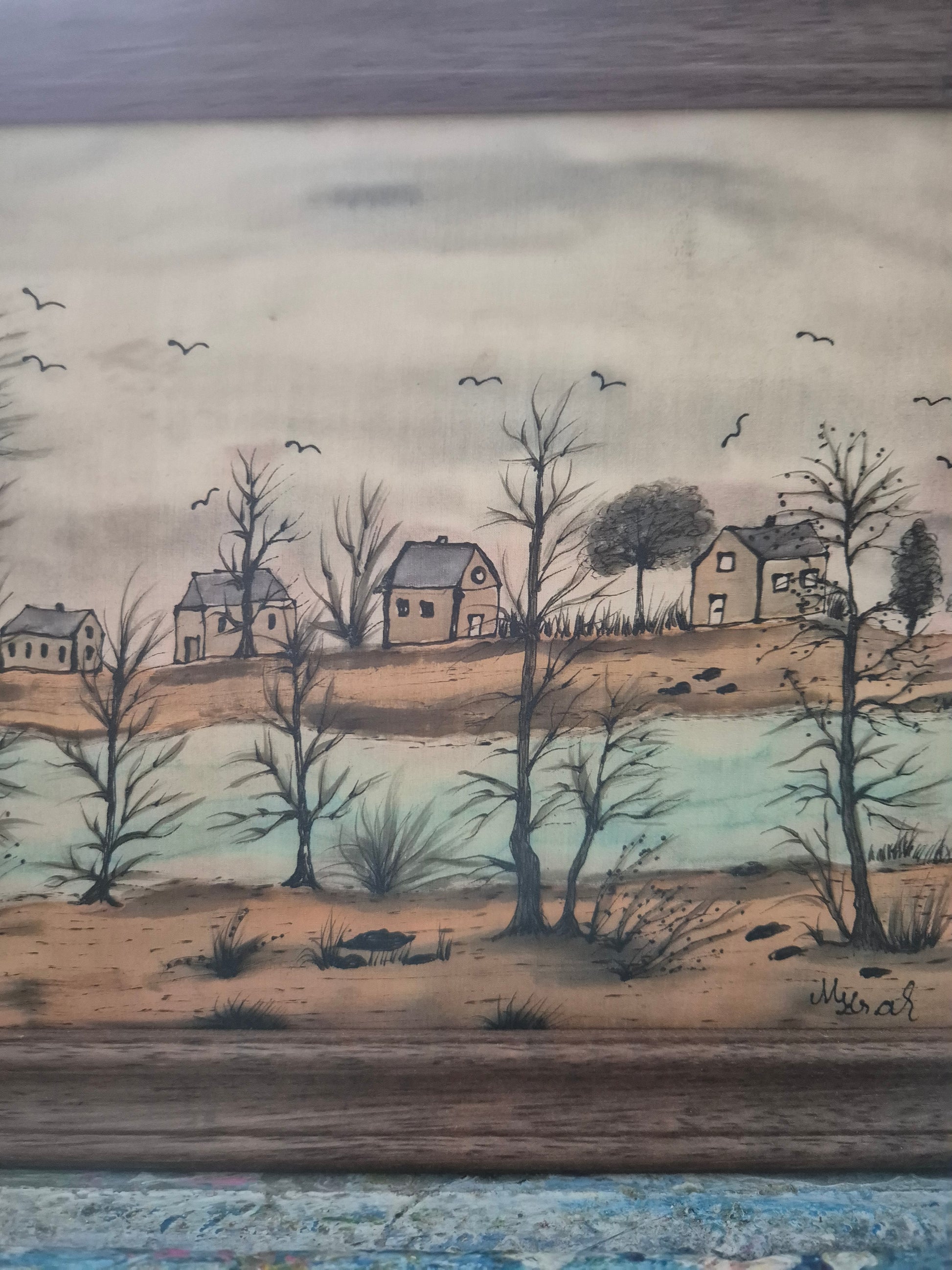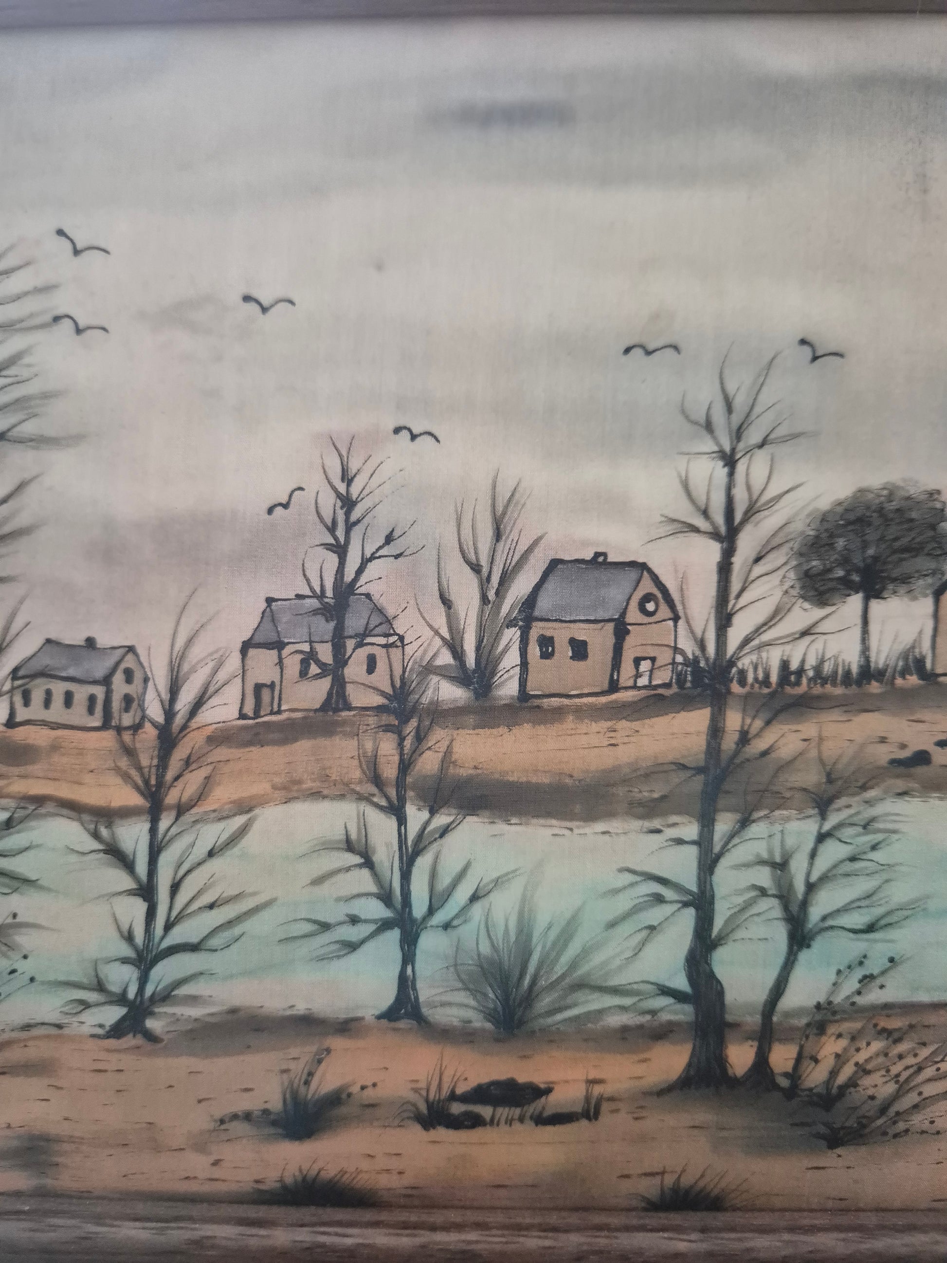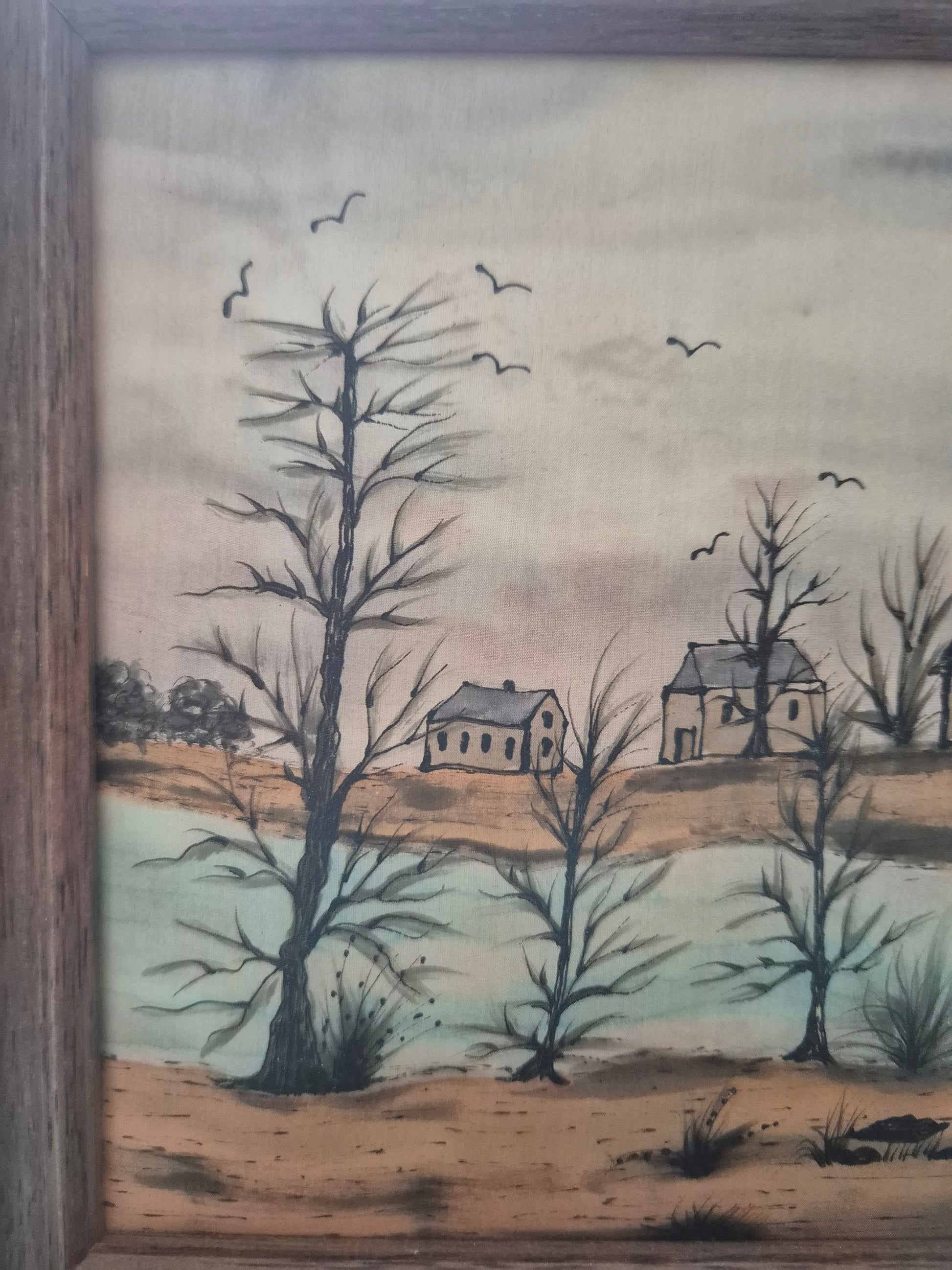 Maria Krah (XX) Seidenmalerei Naive Landschaft mit Häusern 19x24cm