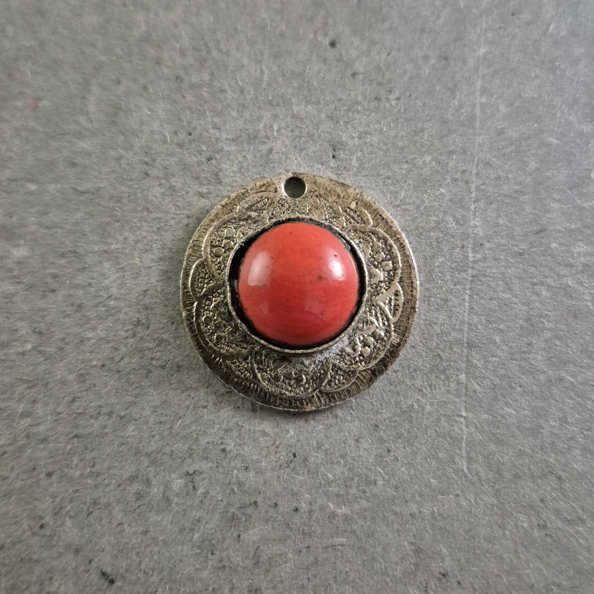 Dieser runde Anhänger mit einem auffälligen roten Cabochon ist ein echter Blickfang. Das fein verzierte Metall mit orientalischen Gravuren verleiht dem Stück einen Hauch von Exotik und Geschichte. Ideal für Ethno-Schmuckliebhaber oder als besonderes Detail an einer Halskette oder einem Armband.