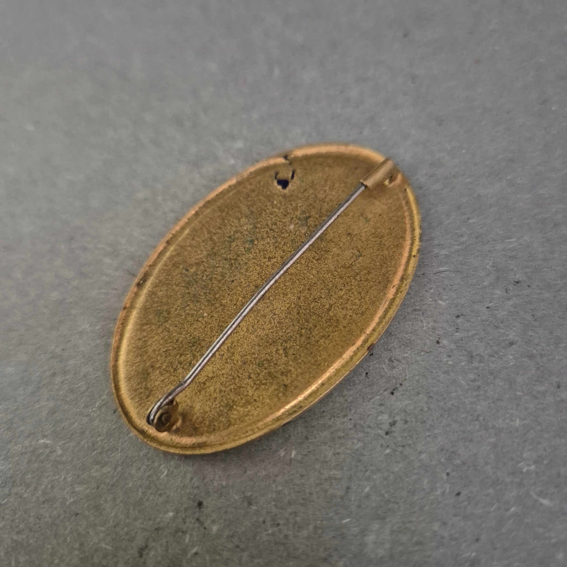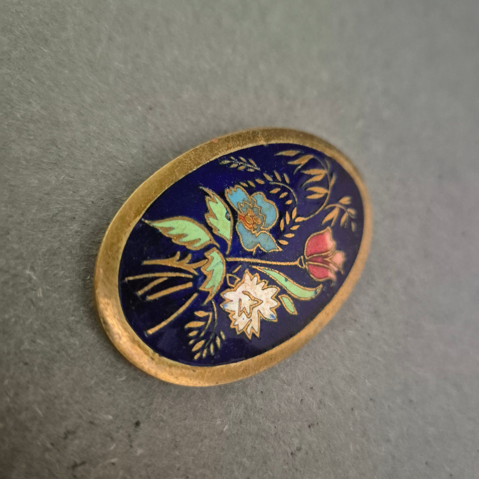 Diese ovale Emaille-Brosche besticht durch ihr kunstvoll gestaltetes florales Motiv auf tiefblauem Hintergrund. Der goldfarbene Rahmen verleiht dem Stück eine elegante Note und betont das orientalisch inspirierte Design. Die detailreiche Emaillearbeit mit bunten Blüten macht diese Brosche zu einem besonderen Vintage-Schmuckstück für Kenner.