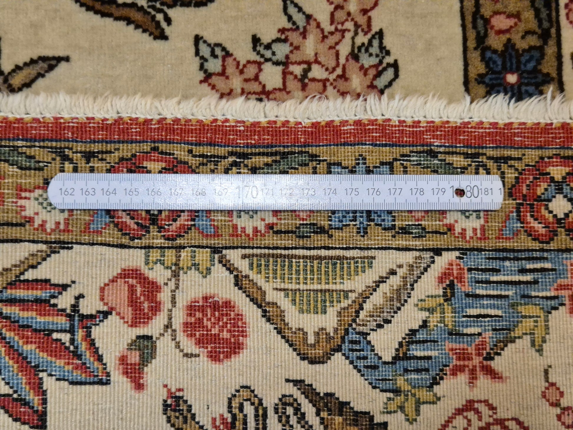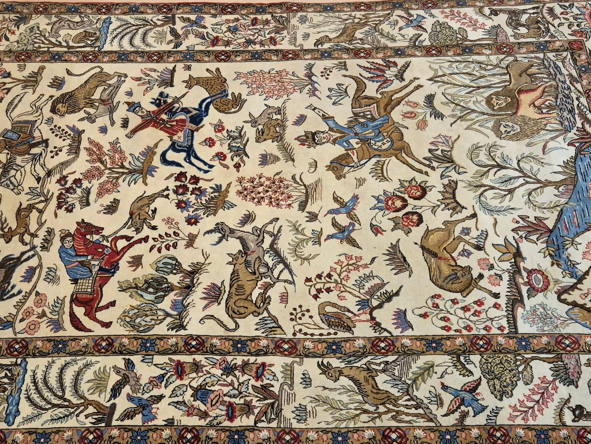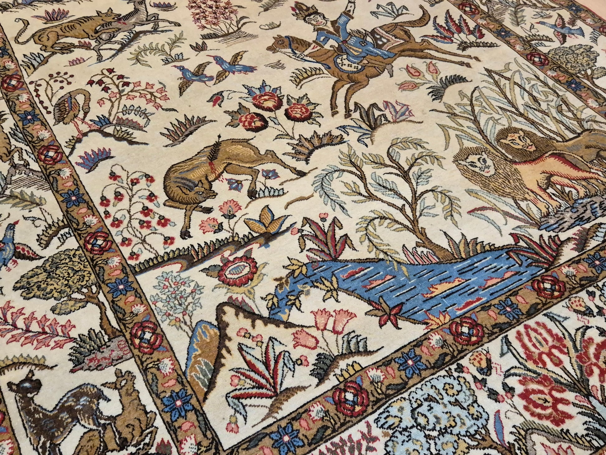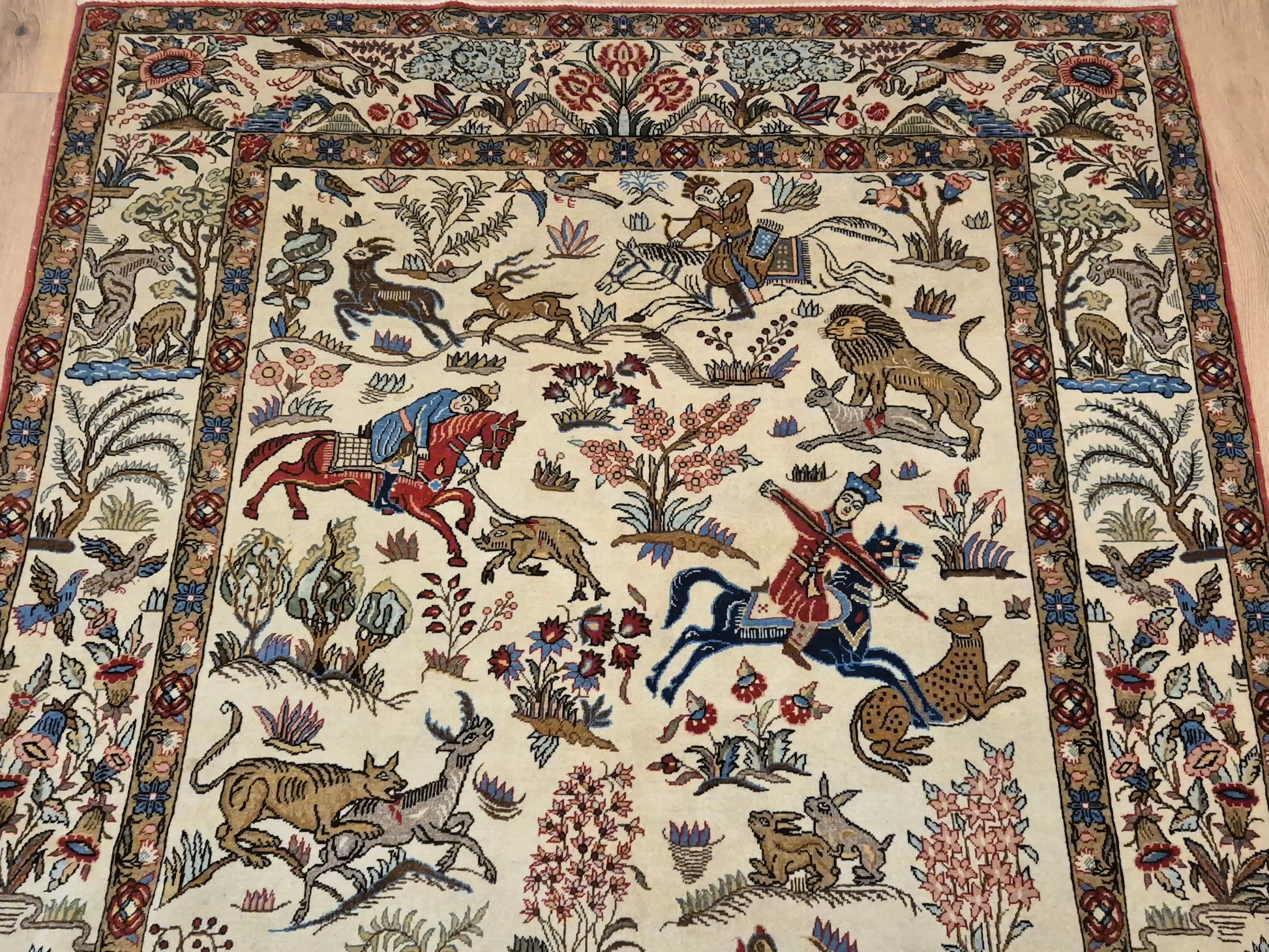 angeboten wird ein besonders dekorativer Ghom Teppich aus feiner Korkwolle, semi-antik und handgeknüpft. Das Stück zeigt ein reich gestaltetes Jagdmotiv mit Reitern, wilden Tieren und Vögeln, eingebettet in eine detailreiche Landschaftsdarstellung.