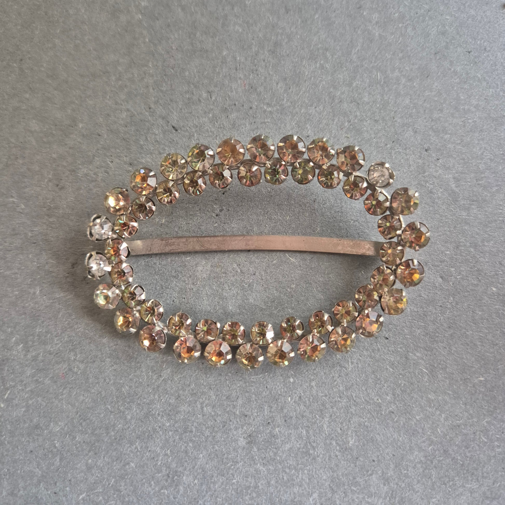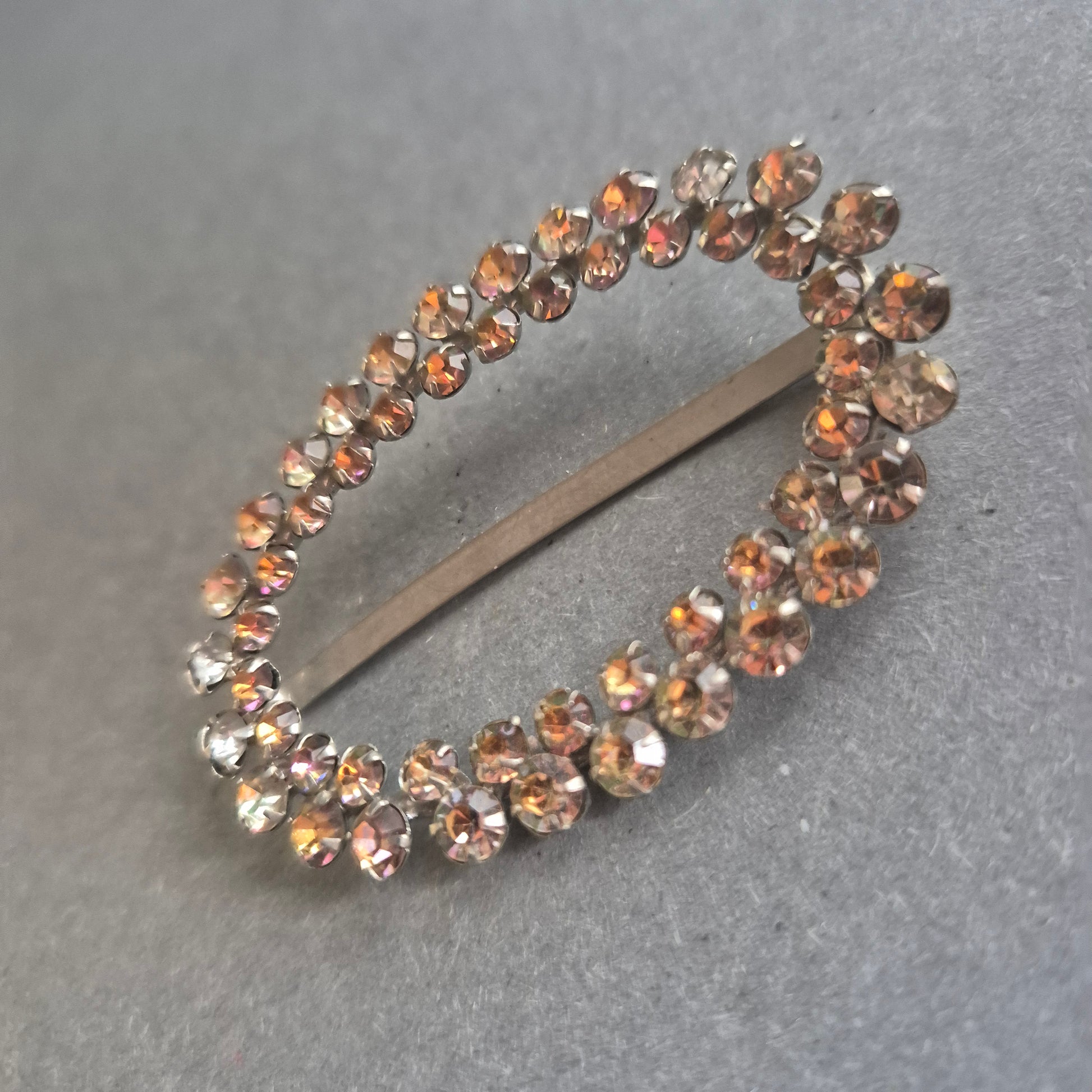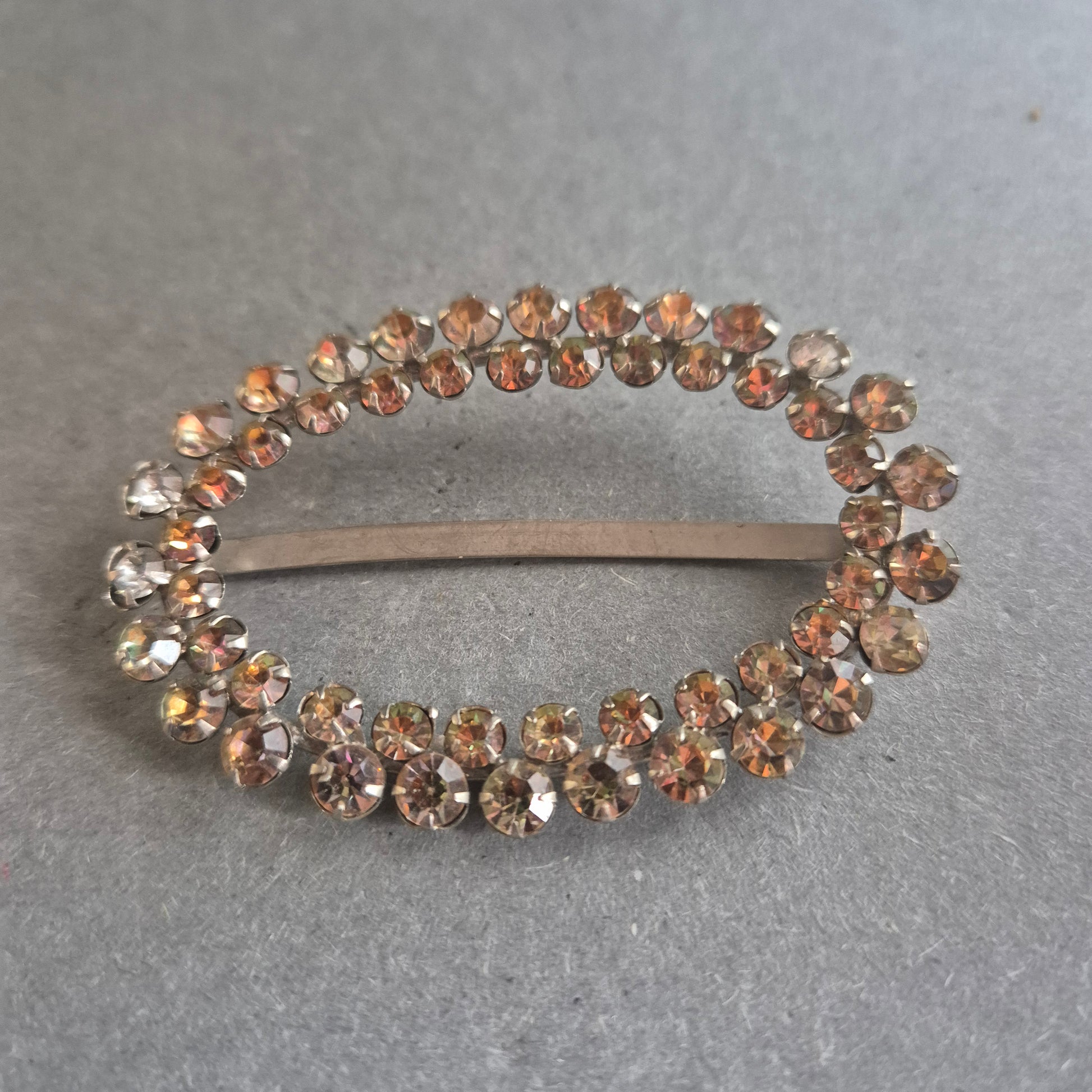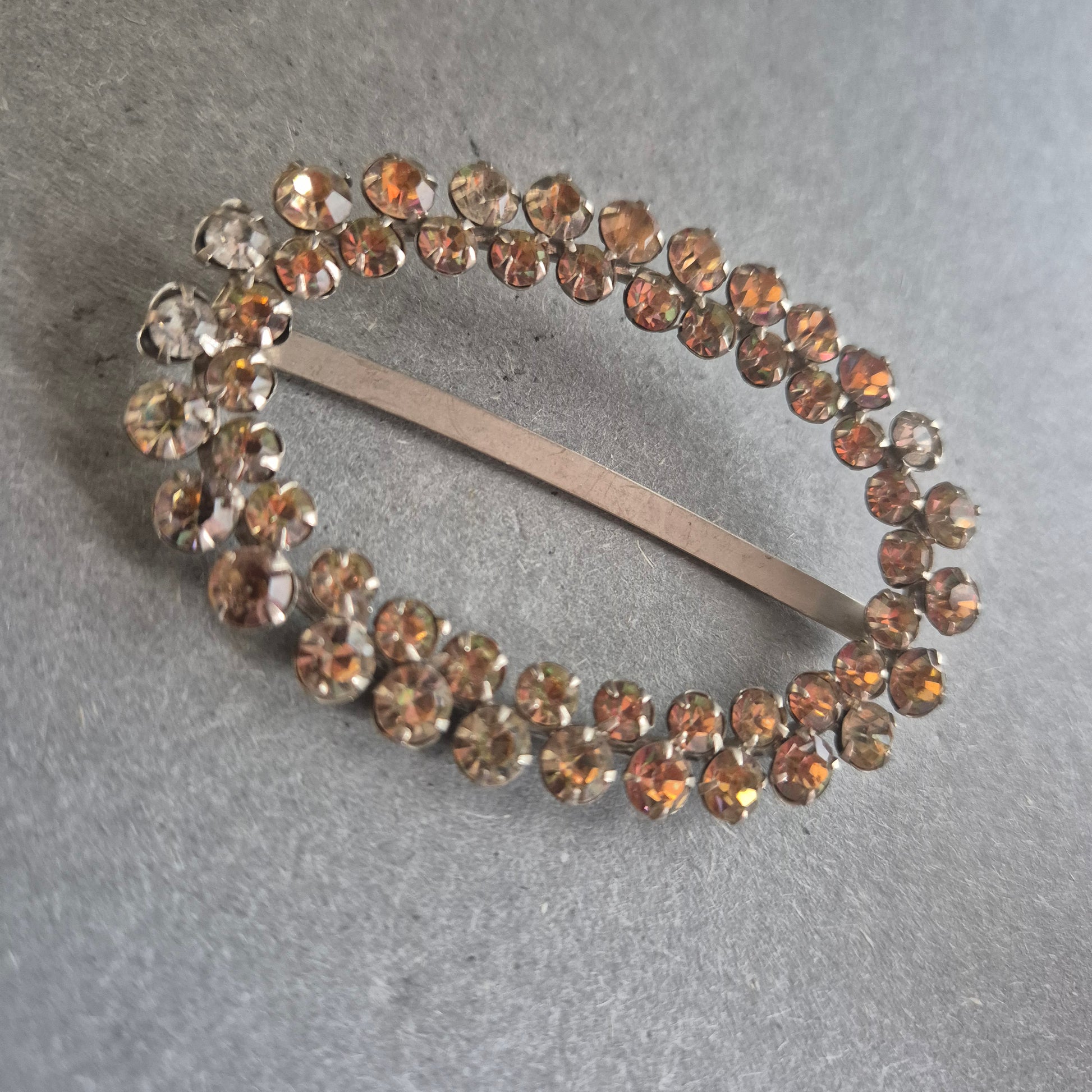 Diese ovale Vintage-Brosche beeindruckt mit einer dichten Besetzung aus funkelnden Strasssteinen in warmem Bernstein- und Kristallton. Das elegante Design erinnert an klassische Modeschmuckstücke der 1950er–70er Jahre und eignet sich perfekt als stilvolles Accessoire für festliche Outfits oder als Sammlerstück.