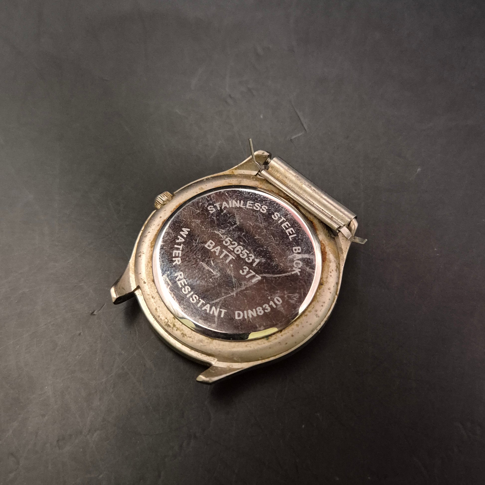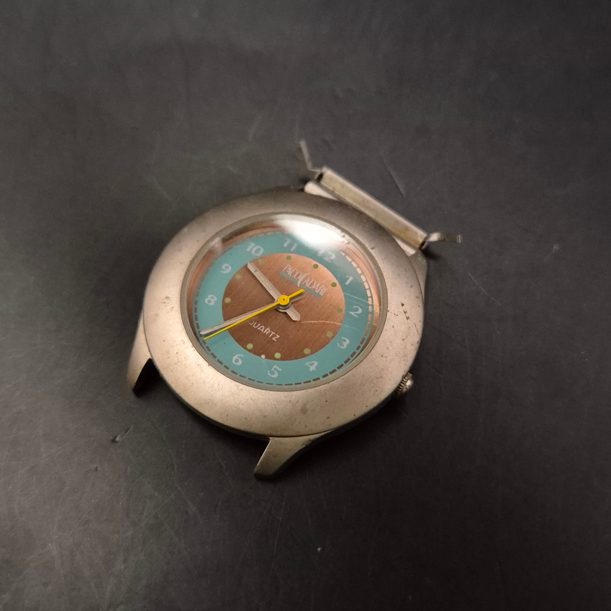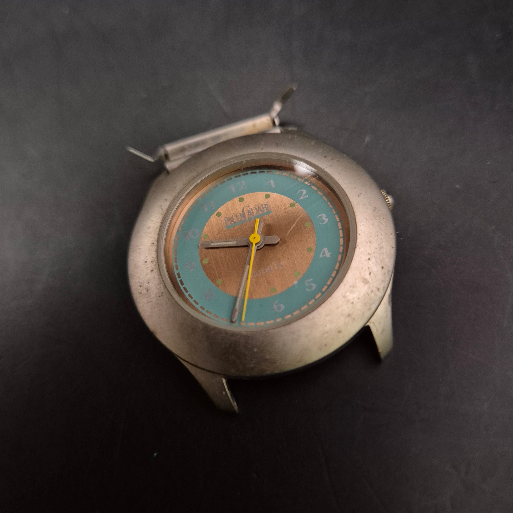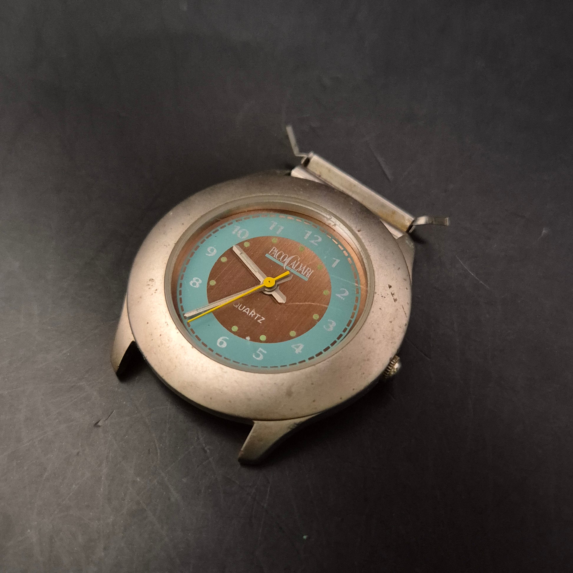 Dieser Uhrkopf von Paco Caldari Quarz ist ein auffälliges Accessoire im Stil der 90er Jahre. Er verfügt über ein markantes, buntes Zifferblatt in Blau-Türkis und Kupferfarben mit großen arabischen Ziffern. Das Gehäuse ist in mattierter Silber-Optik gehalten. Der Gehäuseboden ist aus Edelstahl ("Stainless Steel Back"). Achtung: Es handelt sich hierbei nur um den Uhrkopf – das Armband fehlt und muss ergänzt werden. Das Gehäuse weist deutliche Gebrauchs- und Abnutzungsspuren auf. Ideal für Liebhaber von Retro-Uhren oder zum Ergänzen eines individuellen Armbands.