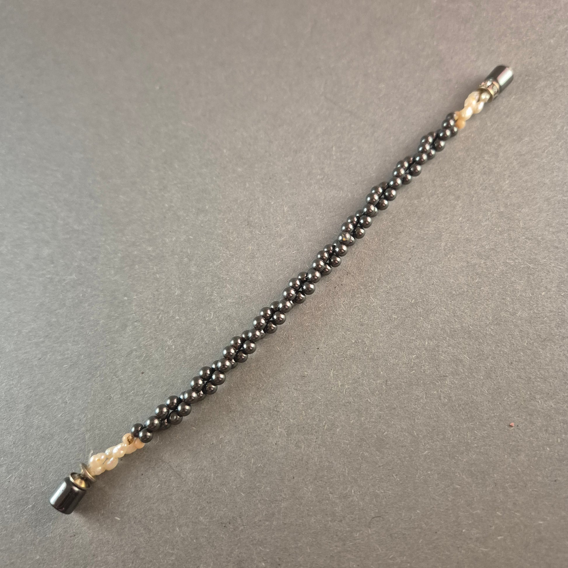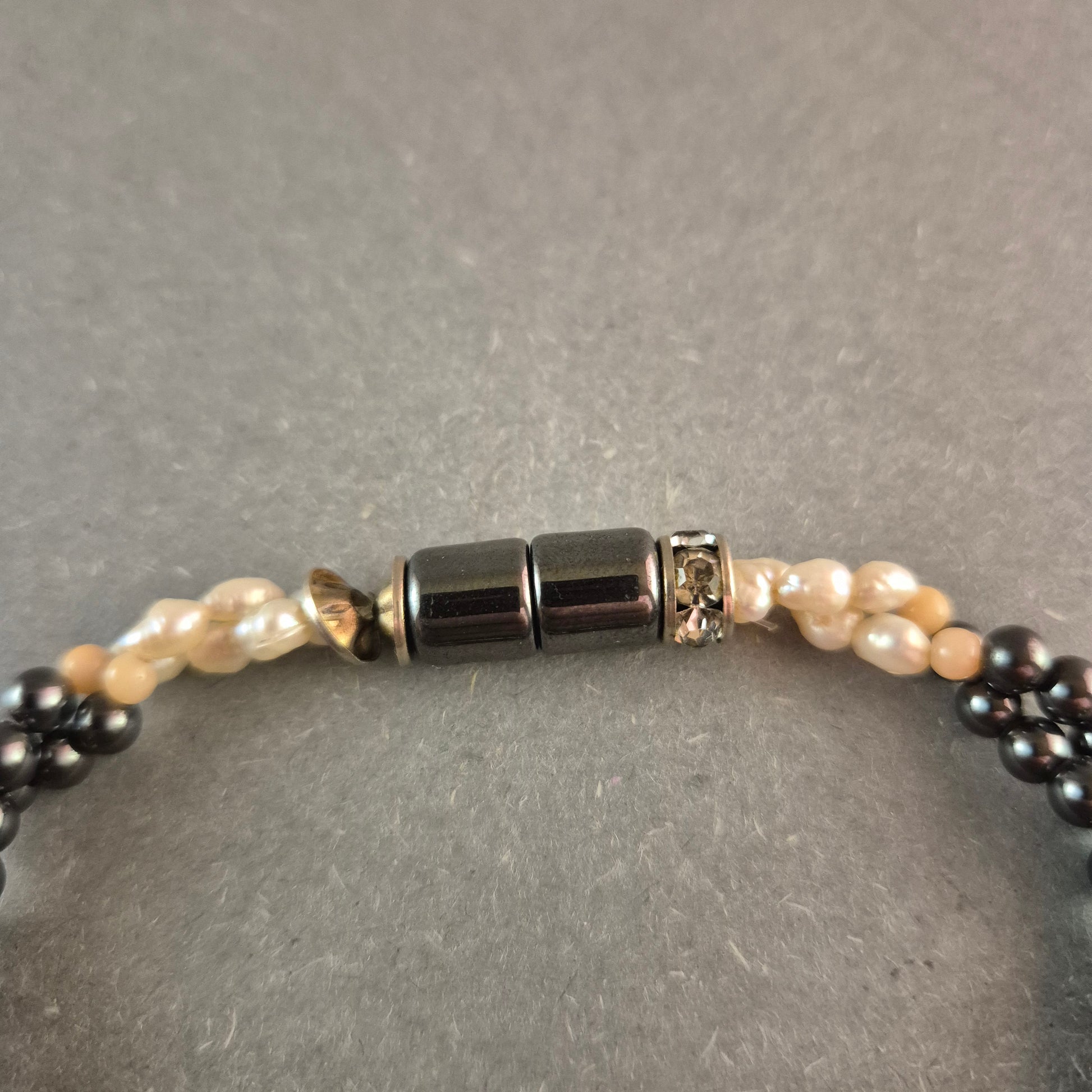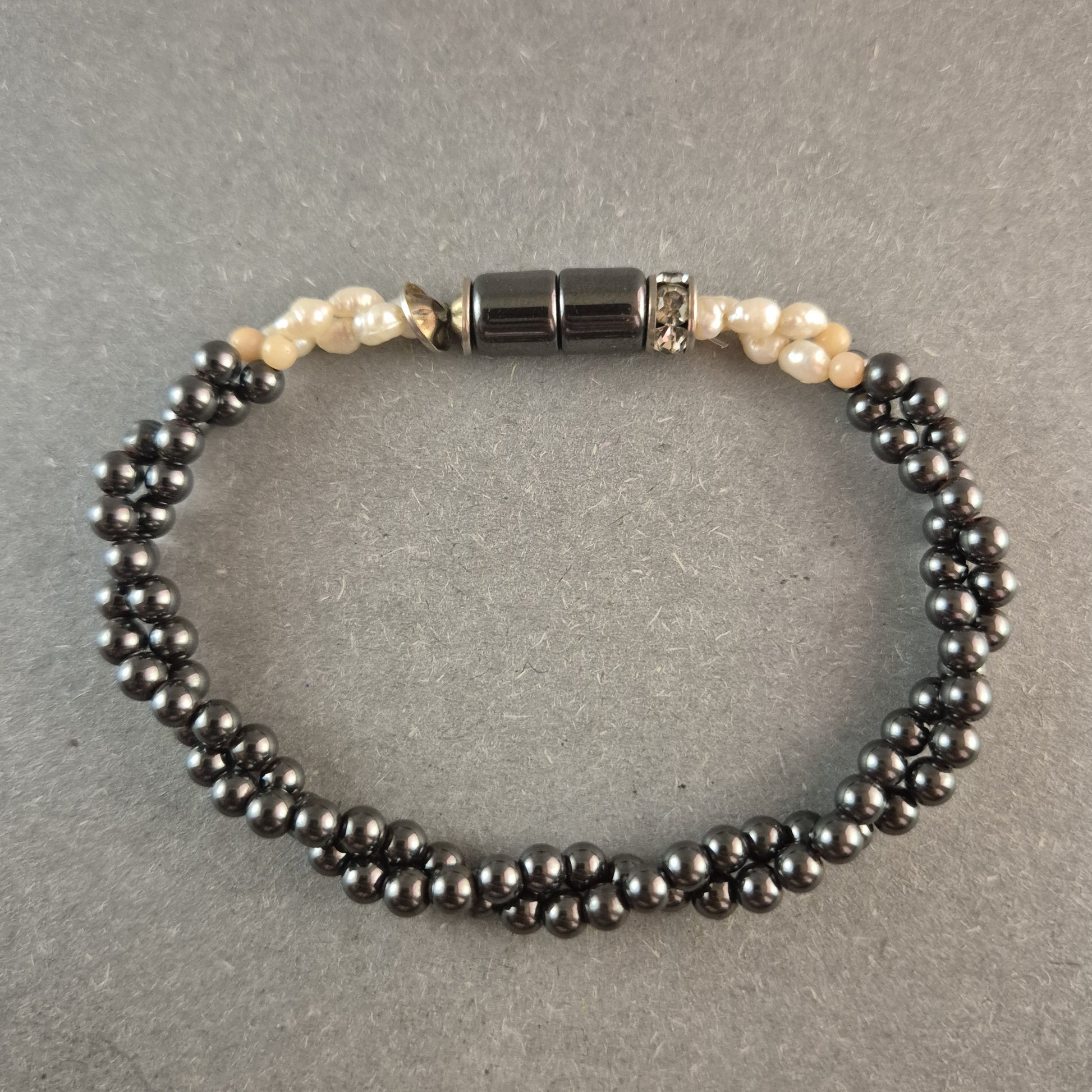 Dieses elegante Armband kombiniert glänzende schwarze Hämatitperlen mit zarten weißen Süßwasserperlen und schafft so einen stilvollen Kontrast. Das geflochtene Design verleiht dem Schmuckstück eine besondere Optik, während der Magnetverschluss für einfaches Anlegen und sicheren Halt sorgt. Ein zeitloses Accessoire für Damen und Herren.