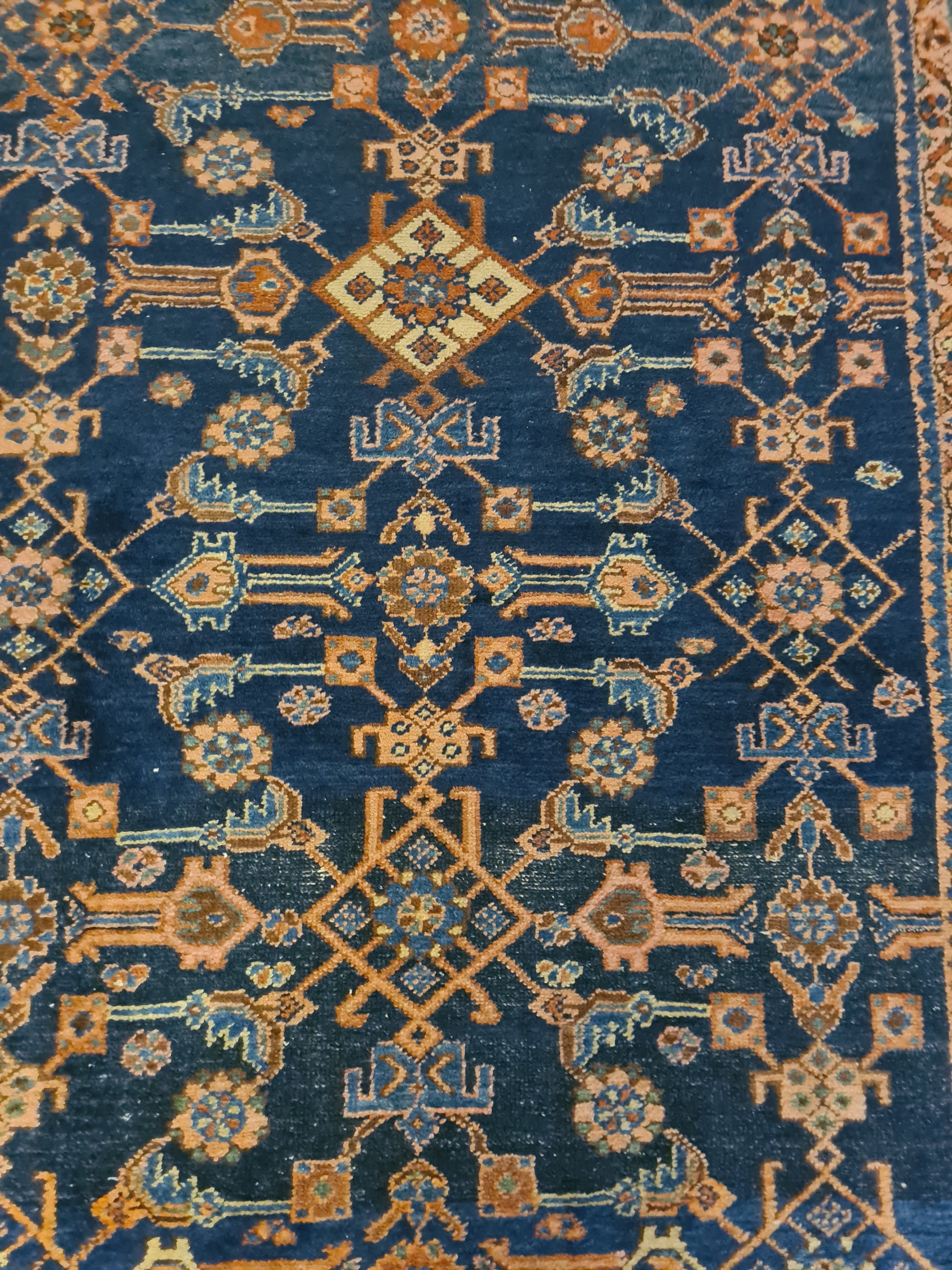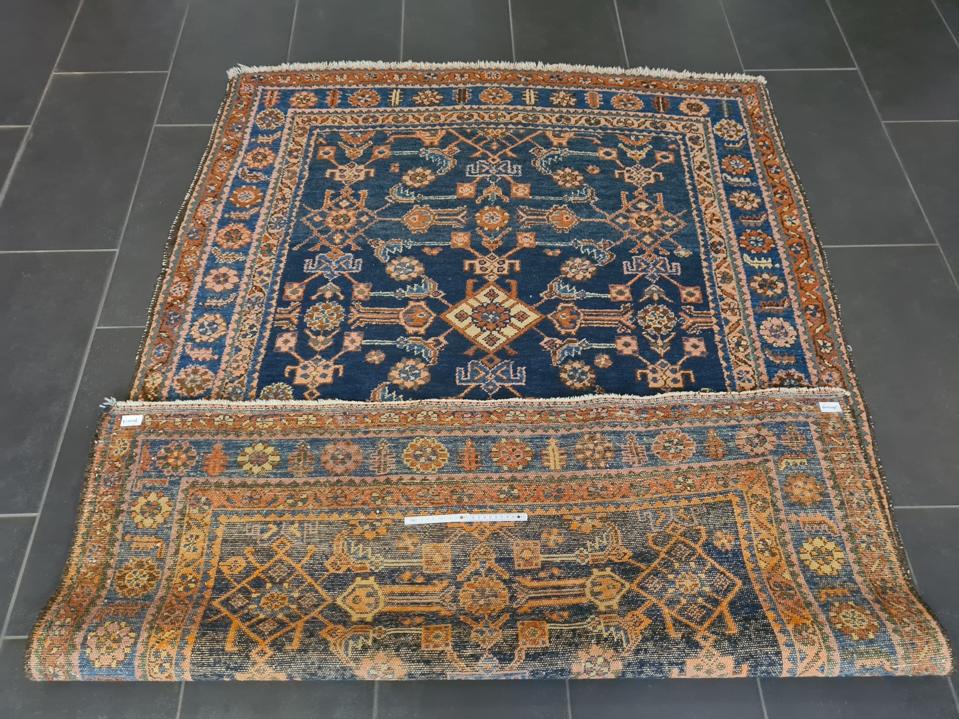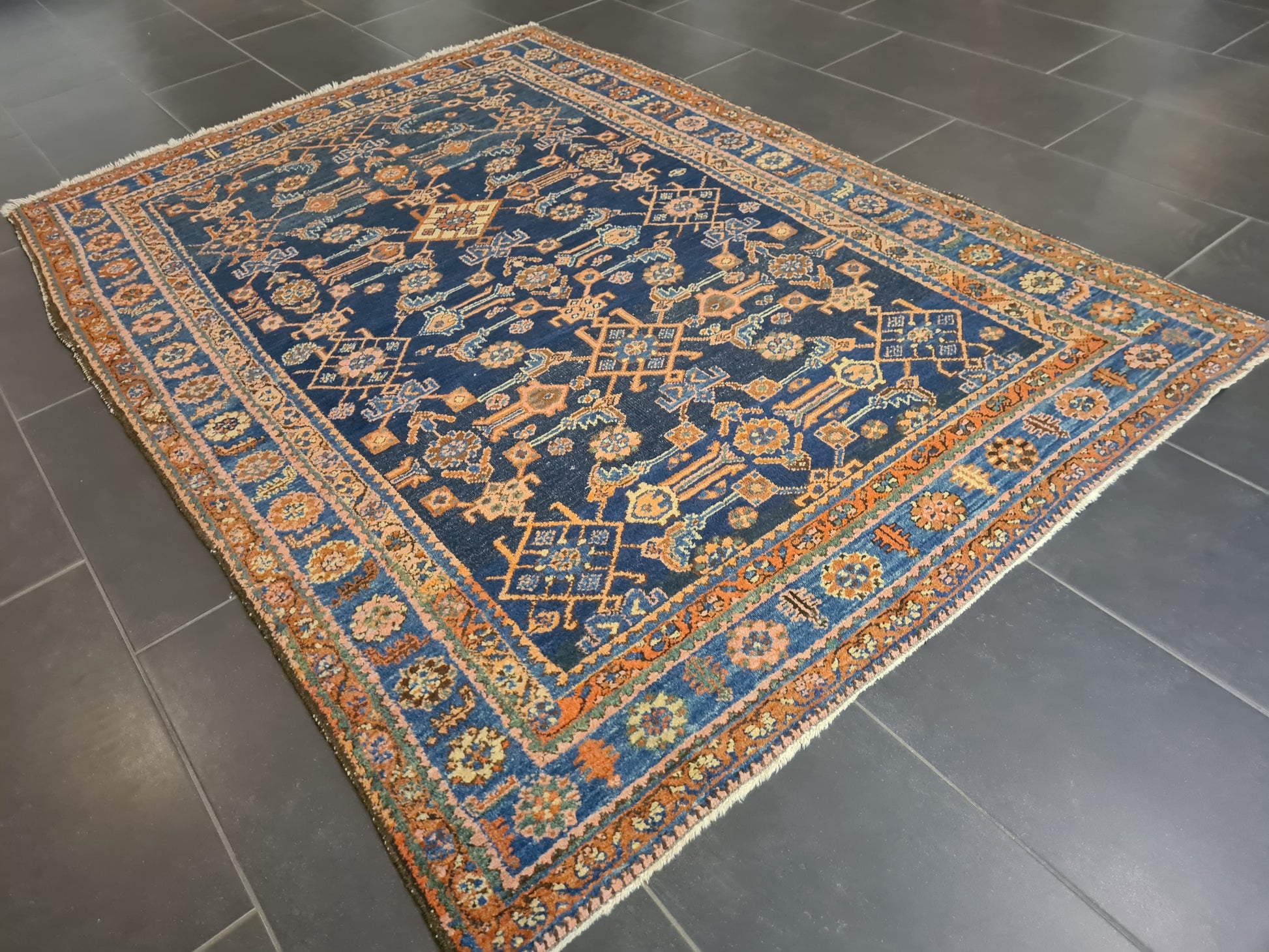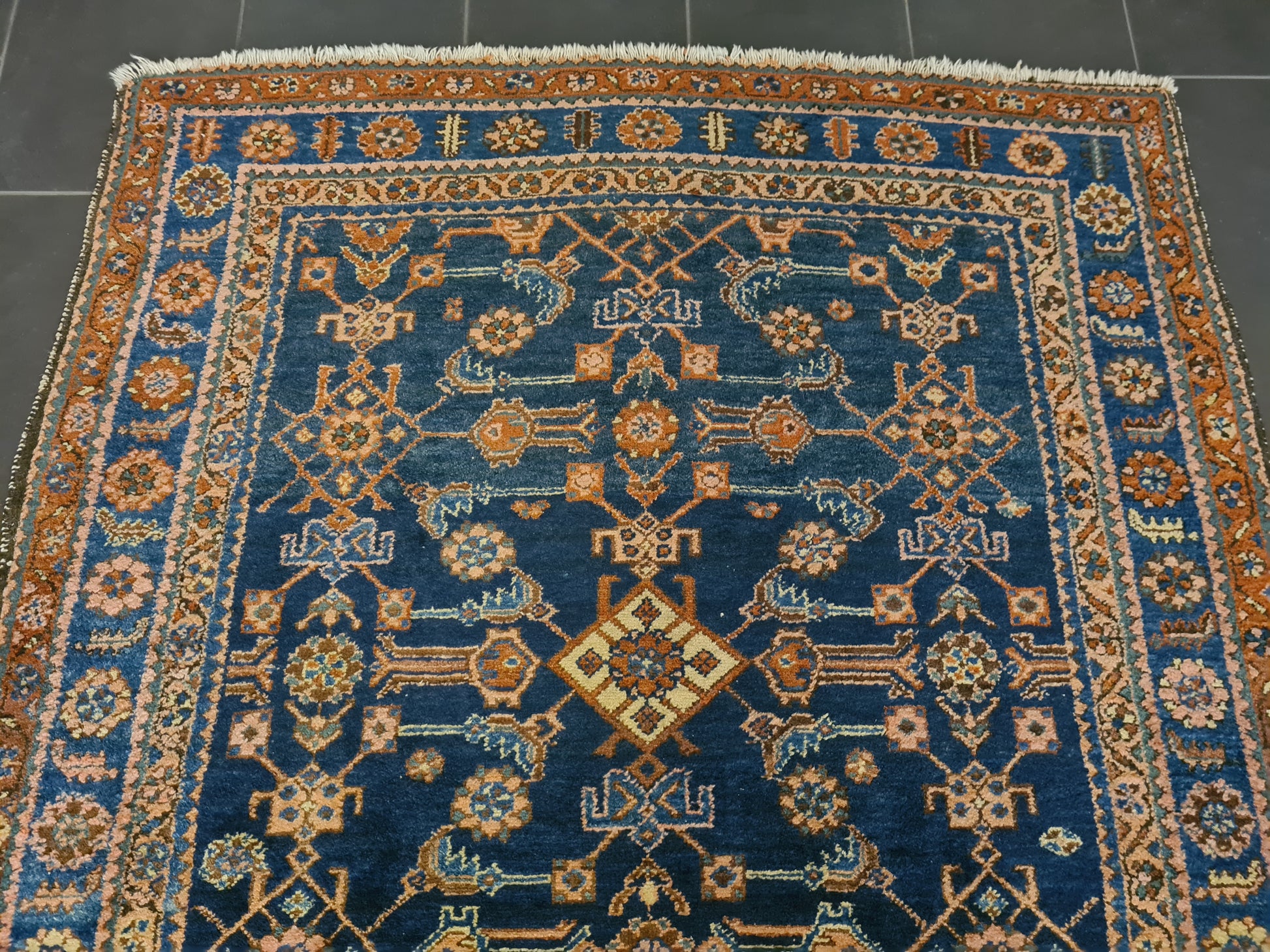 Guter, altersentsprechender Zustand mit Patina. Leichte Gebrauchsspuren sind vorhanden, die den authentischen Charakter des Teppichs unterstreichen. Die Bilder sind Teil der Zustandsbeschreibung.