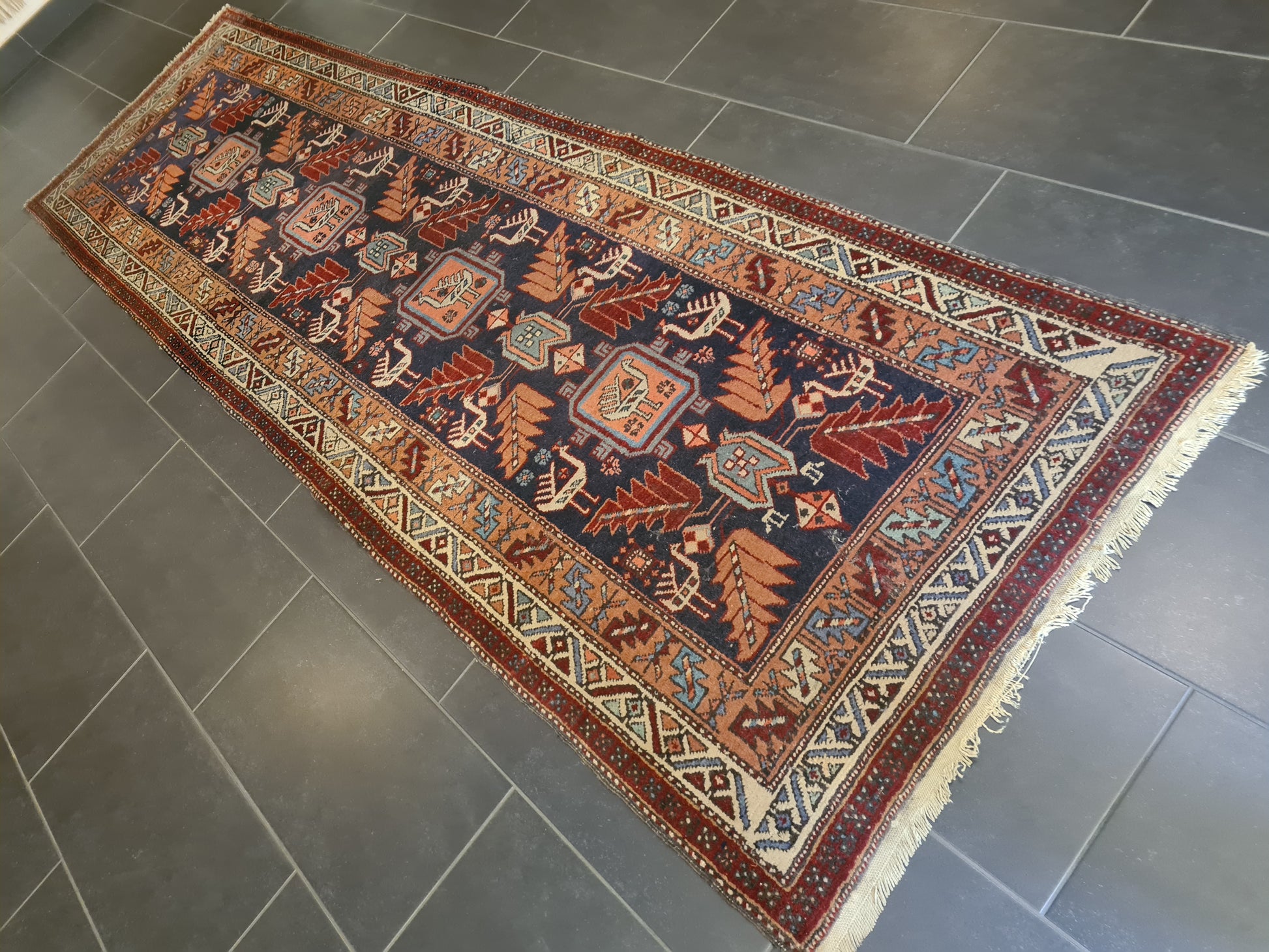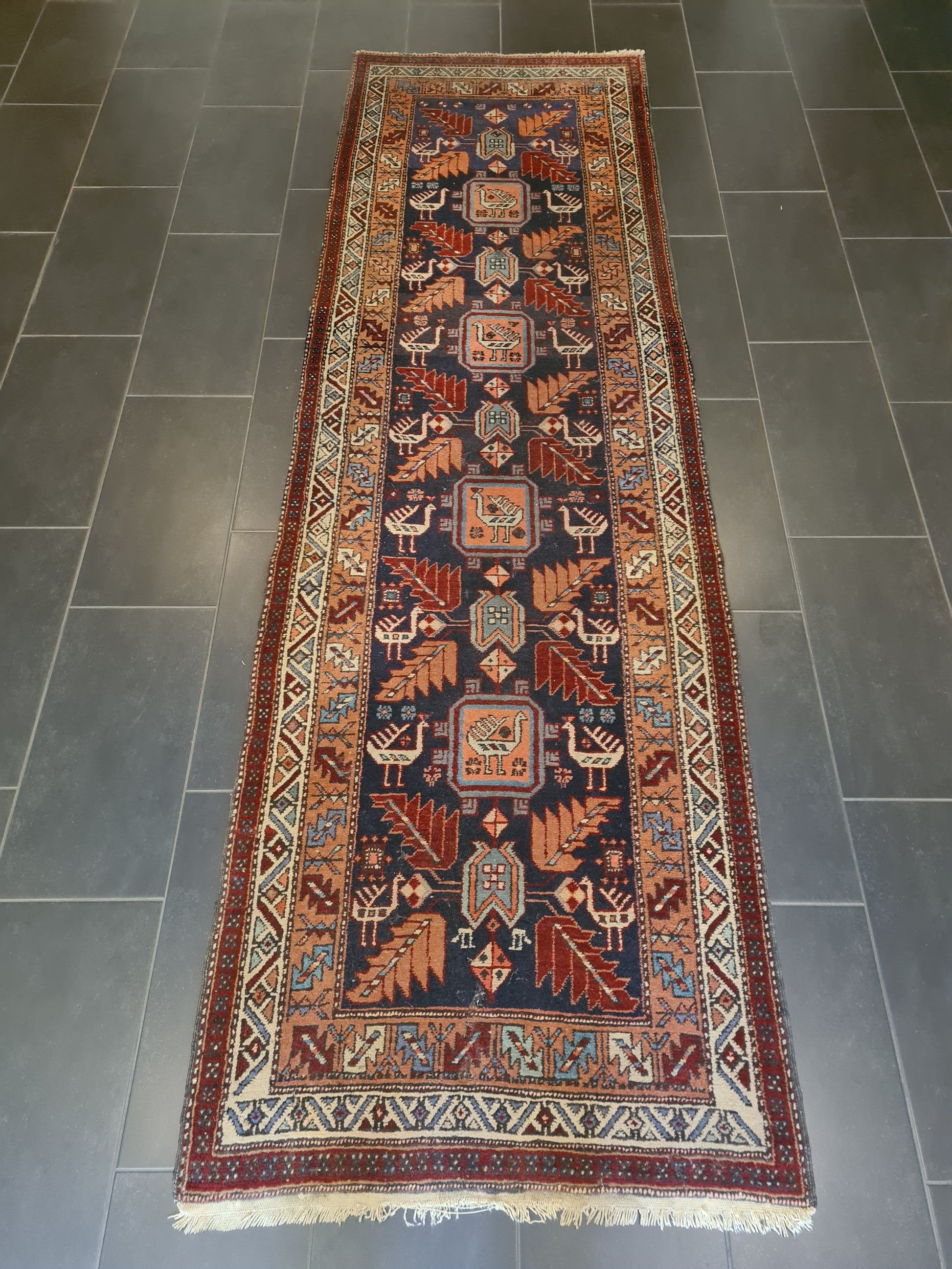 angeboten wird ein antiker, handgeknüpfter Perserteppich aus der Region Heris. Der Läufer überzeugt durch seine aufwendige Knüpfkunst, sein traditionelles Orientmuster und die leuchtenden Farben. Mit seinen großzügigen Maßen eignet er sich ideal als stilvoller Blickfang für Flure, Eingangsbereiche oder repräsentative Räume.