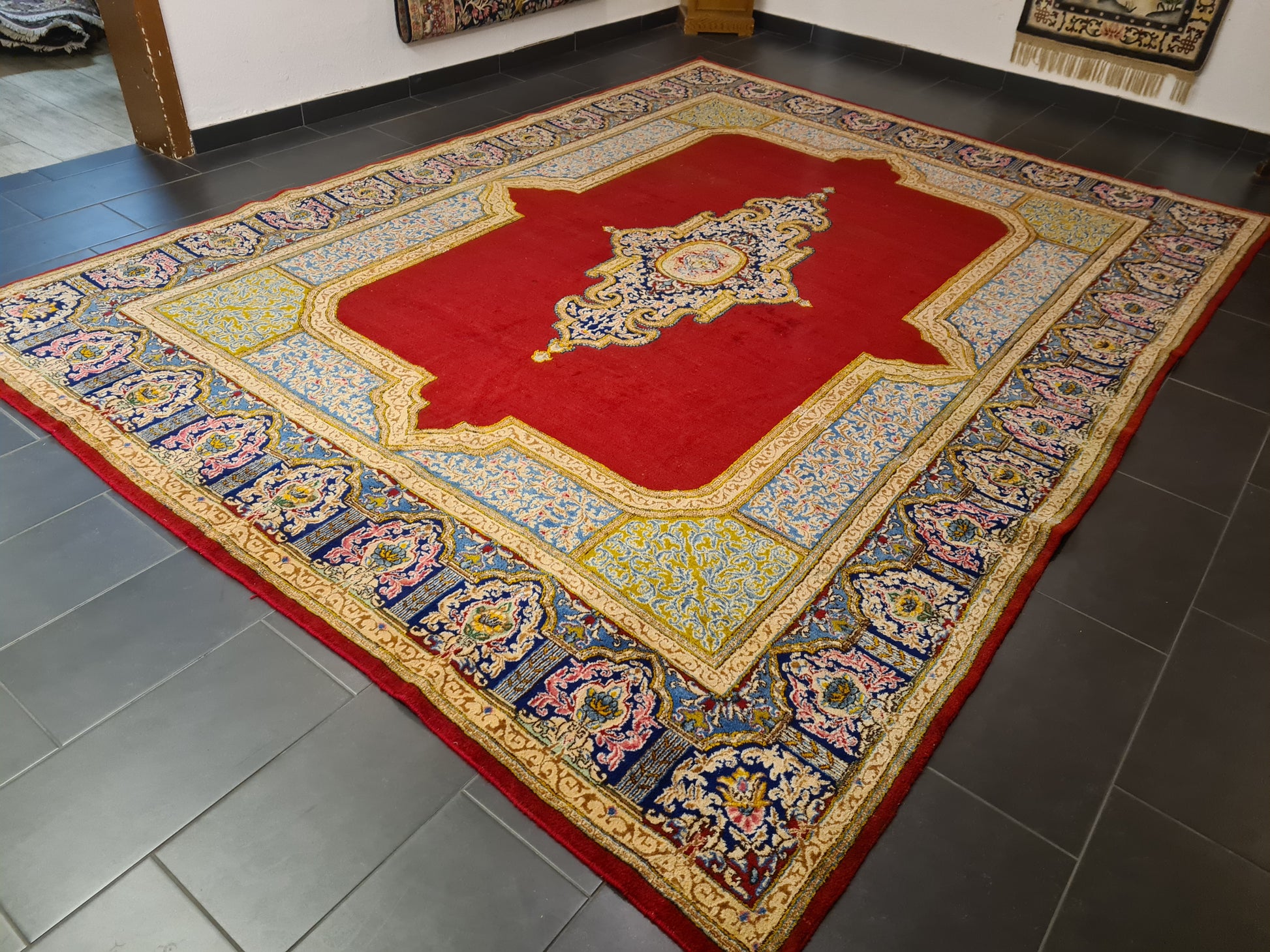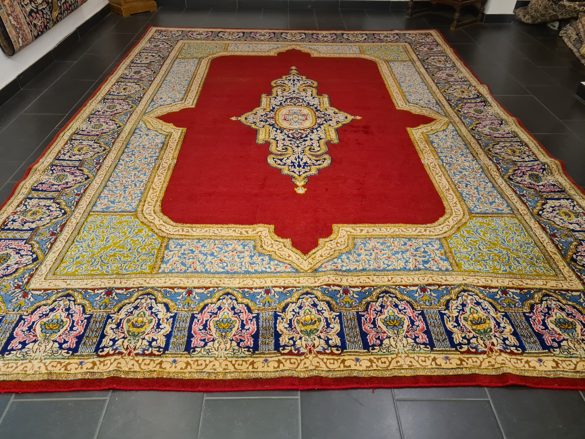 zum Verkauf steht ein prachtvoller, handgeknüpfter Perserteppich aus Kirman, der durch seine erlesene Qualität und sein fein ausgearbeitetes Ornament besticht. Mit seinen großzügigen Maßen eignet er sich hervorragend für repräsentative Räume oder große Wohnbereiche und verleiht jedem Ambiente eine elegante, klassische Note.