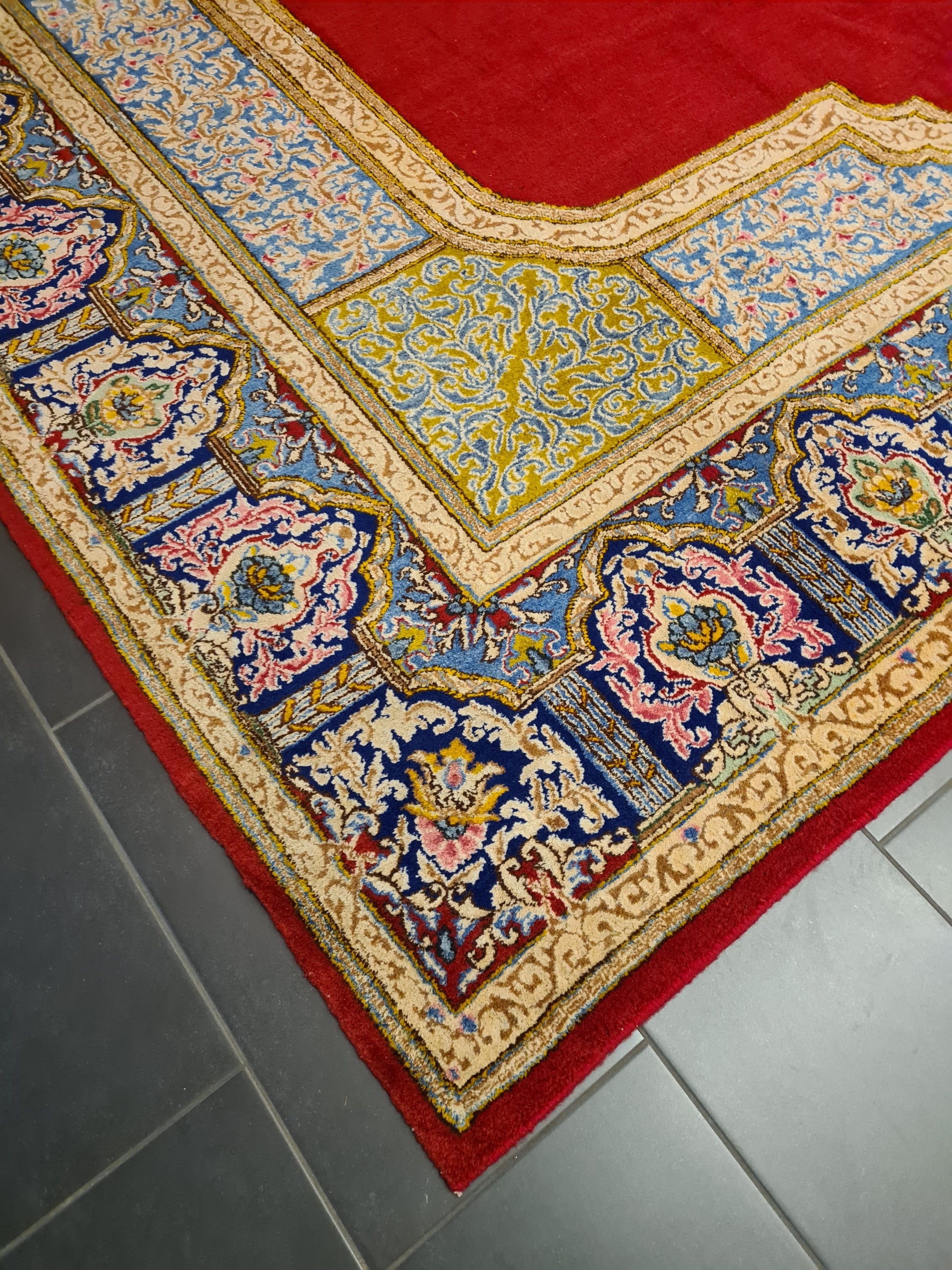 Farben: Rot-, Creme- und Blautöne mit floralen und Medaillonmustern