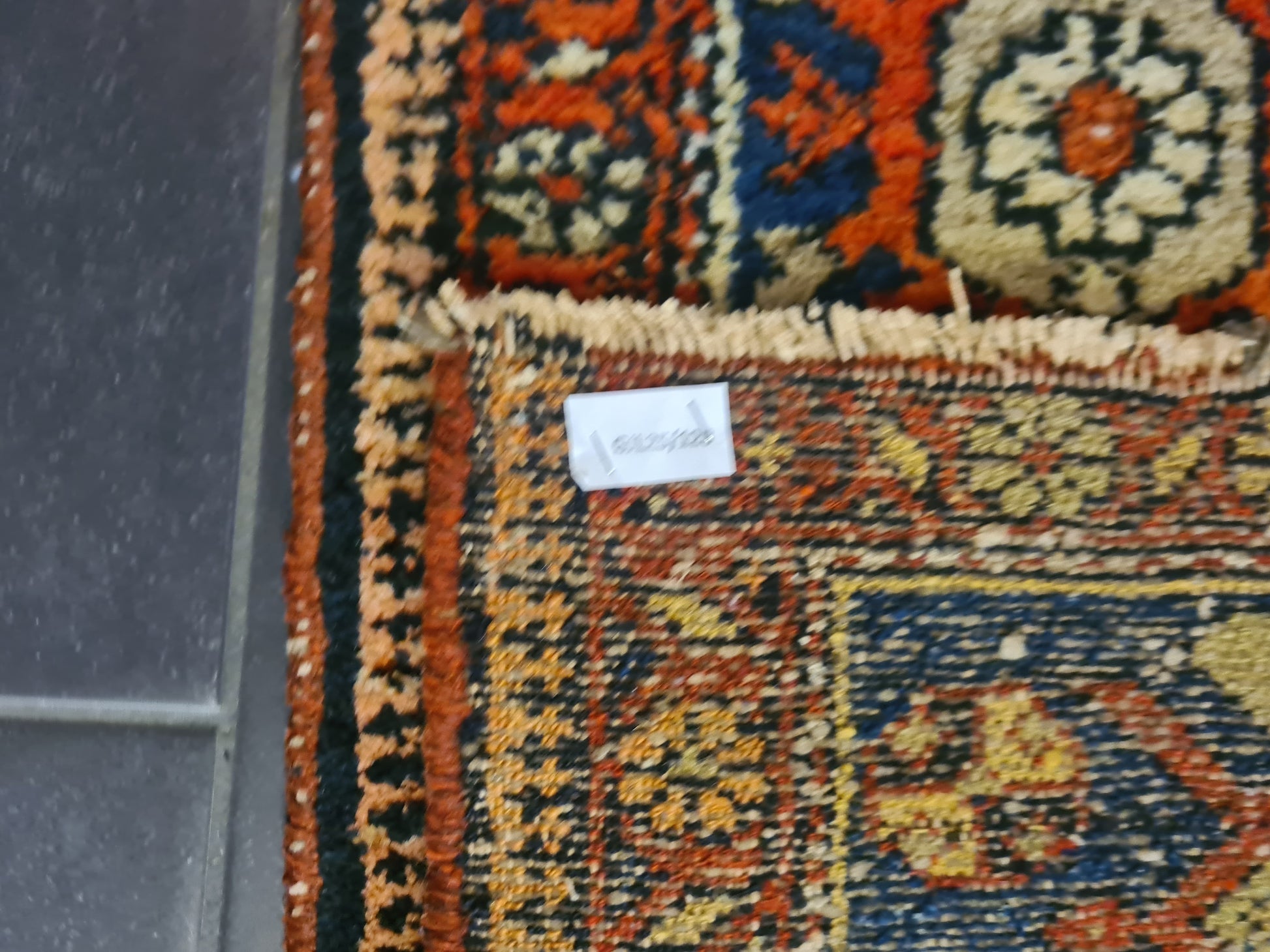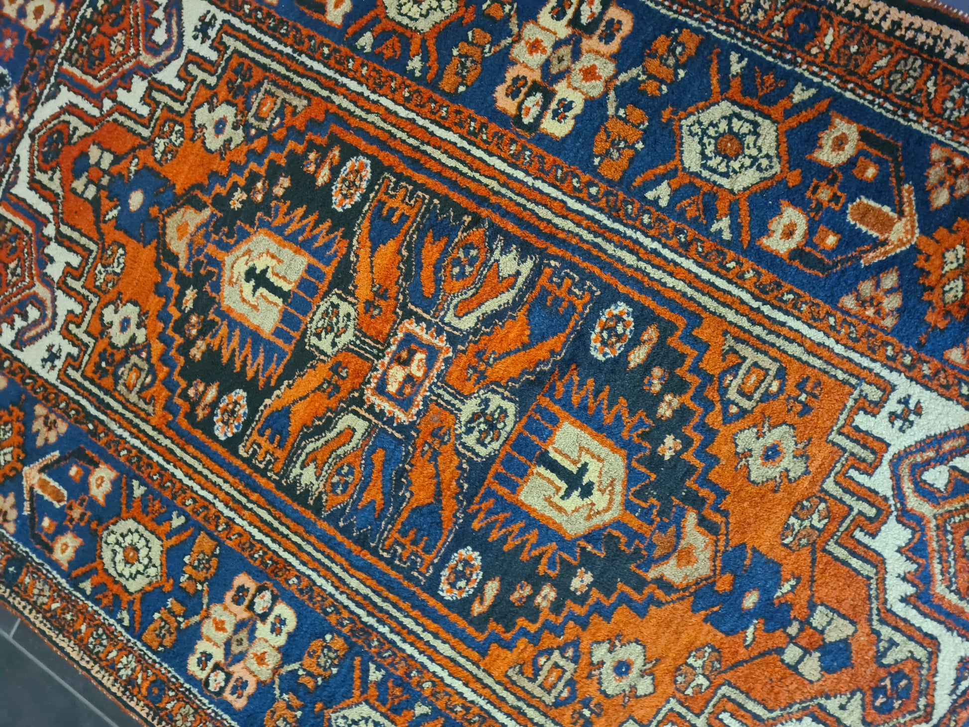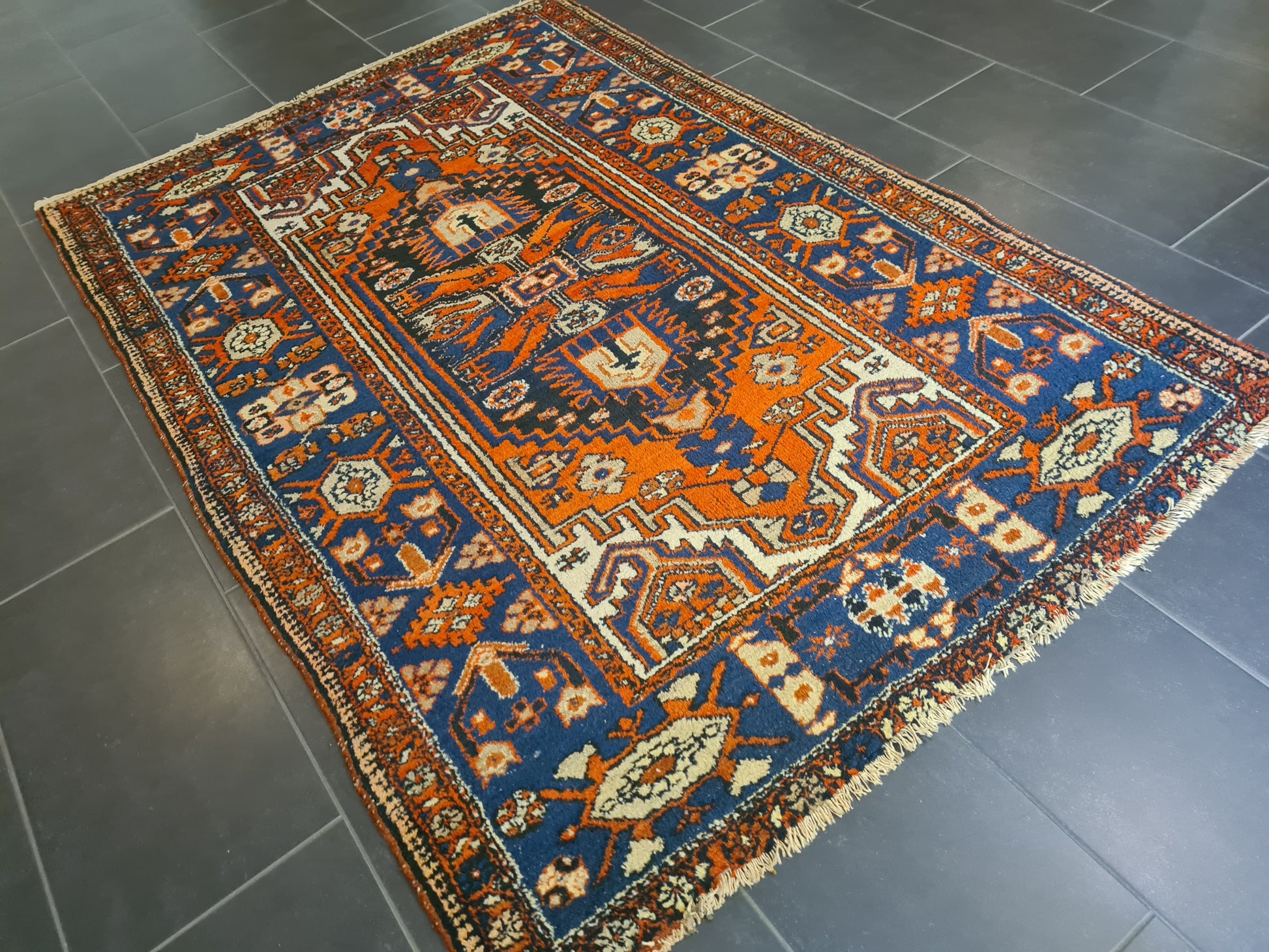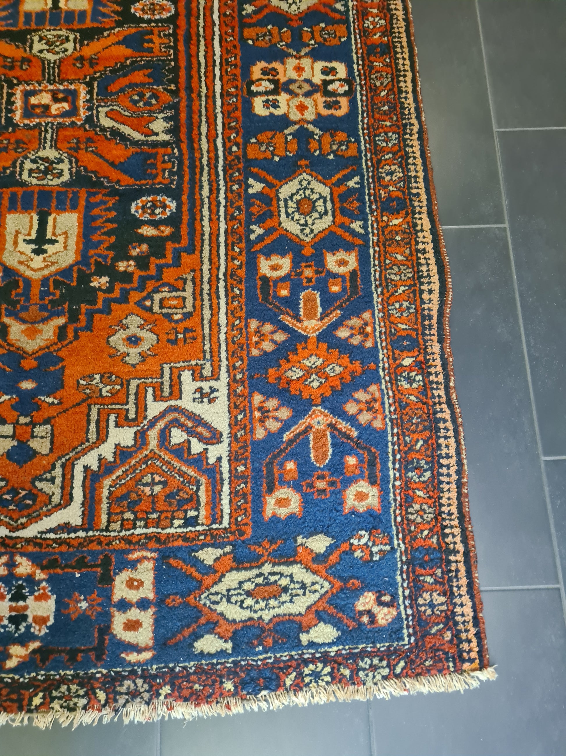 Guter, gepflegter Zustand mit schöner Patina. Der Teppich ist altersbedingt antik und zeigt leichte Gebrauchsspuren, die seinen authentischen Charakter unterstreichen. Die Bilder sind Teil der Zustandsbeschreibung.