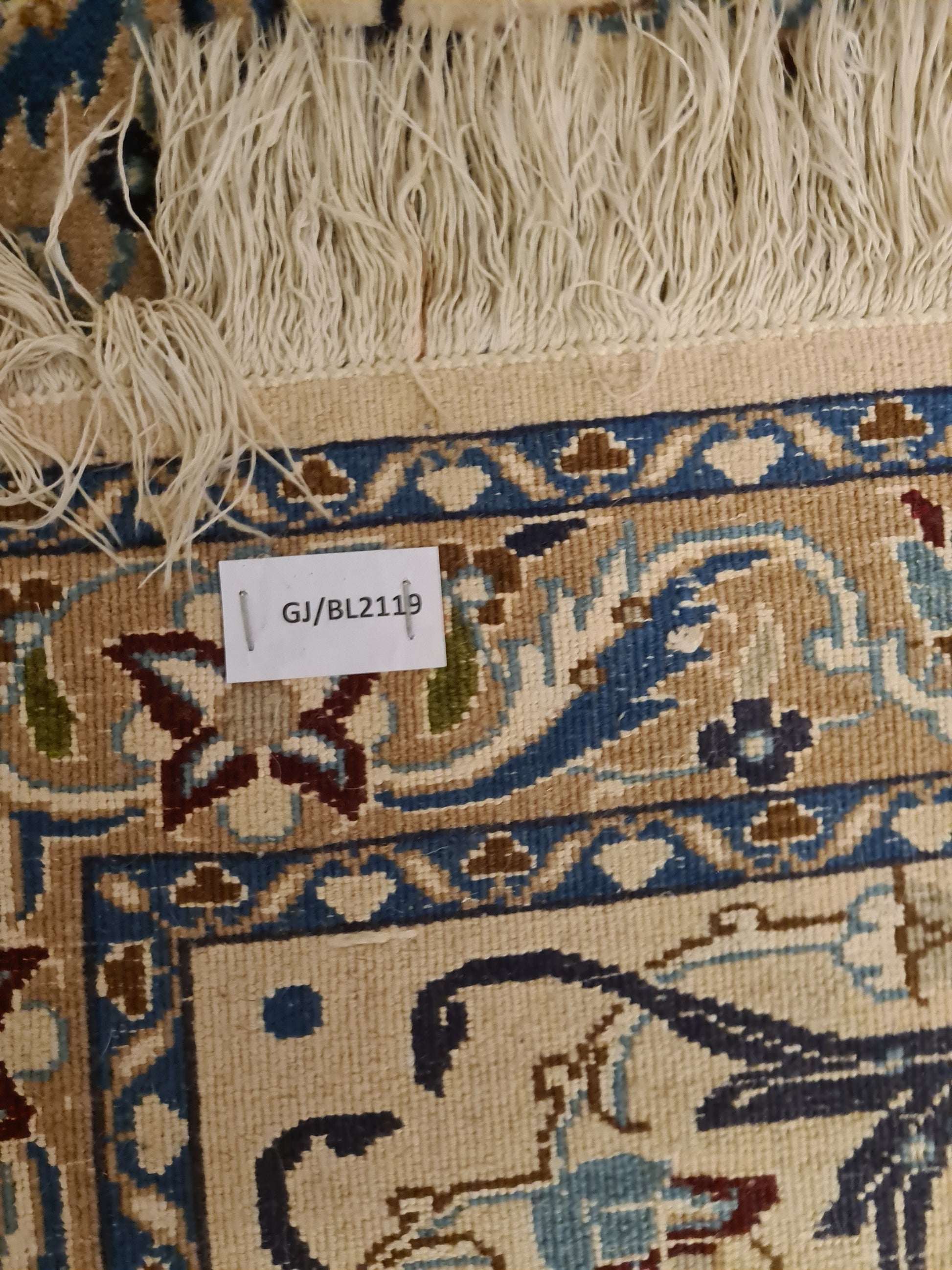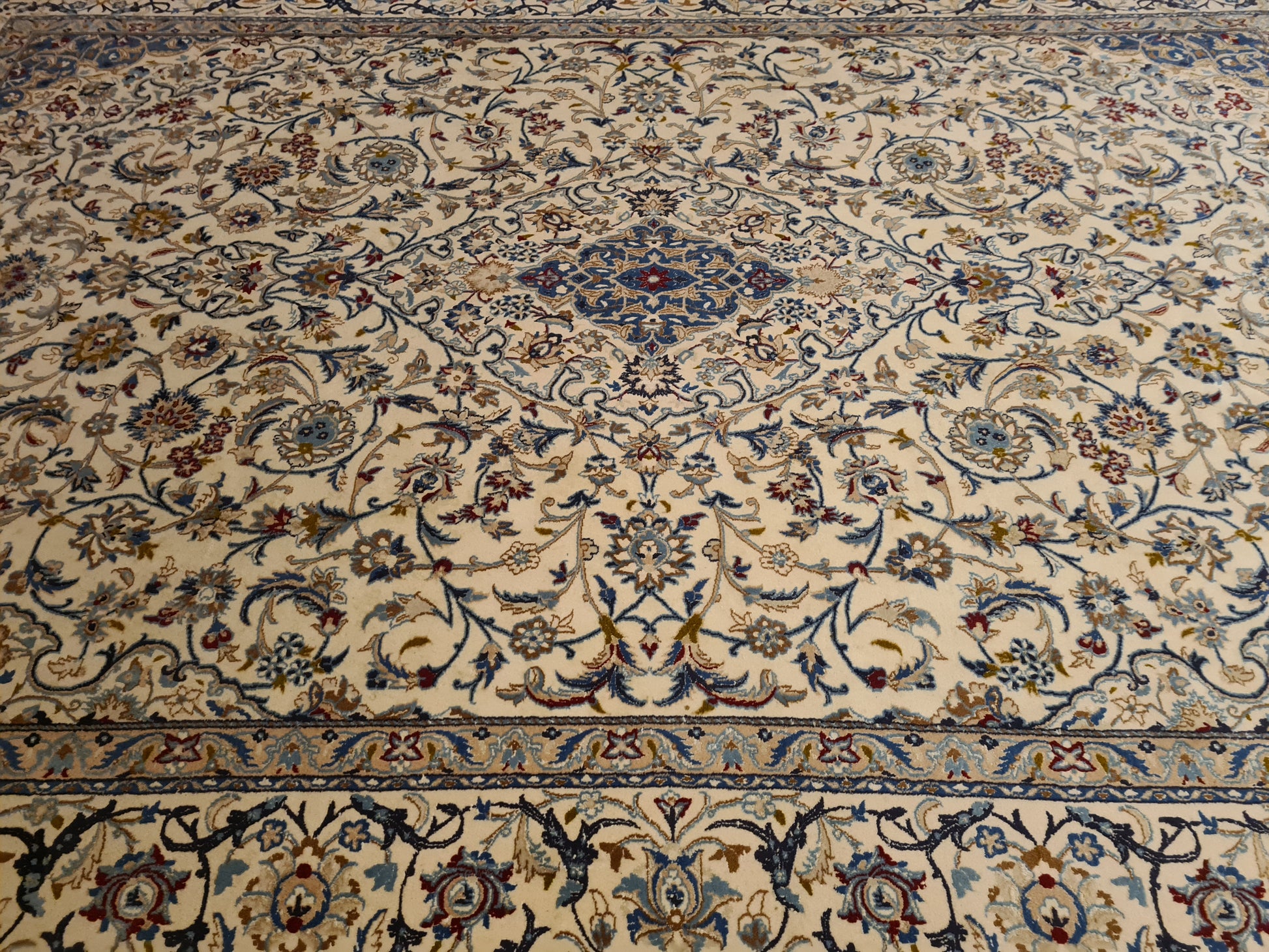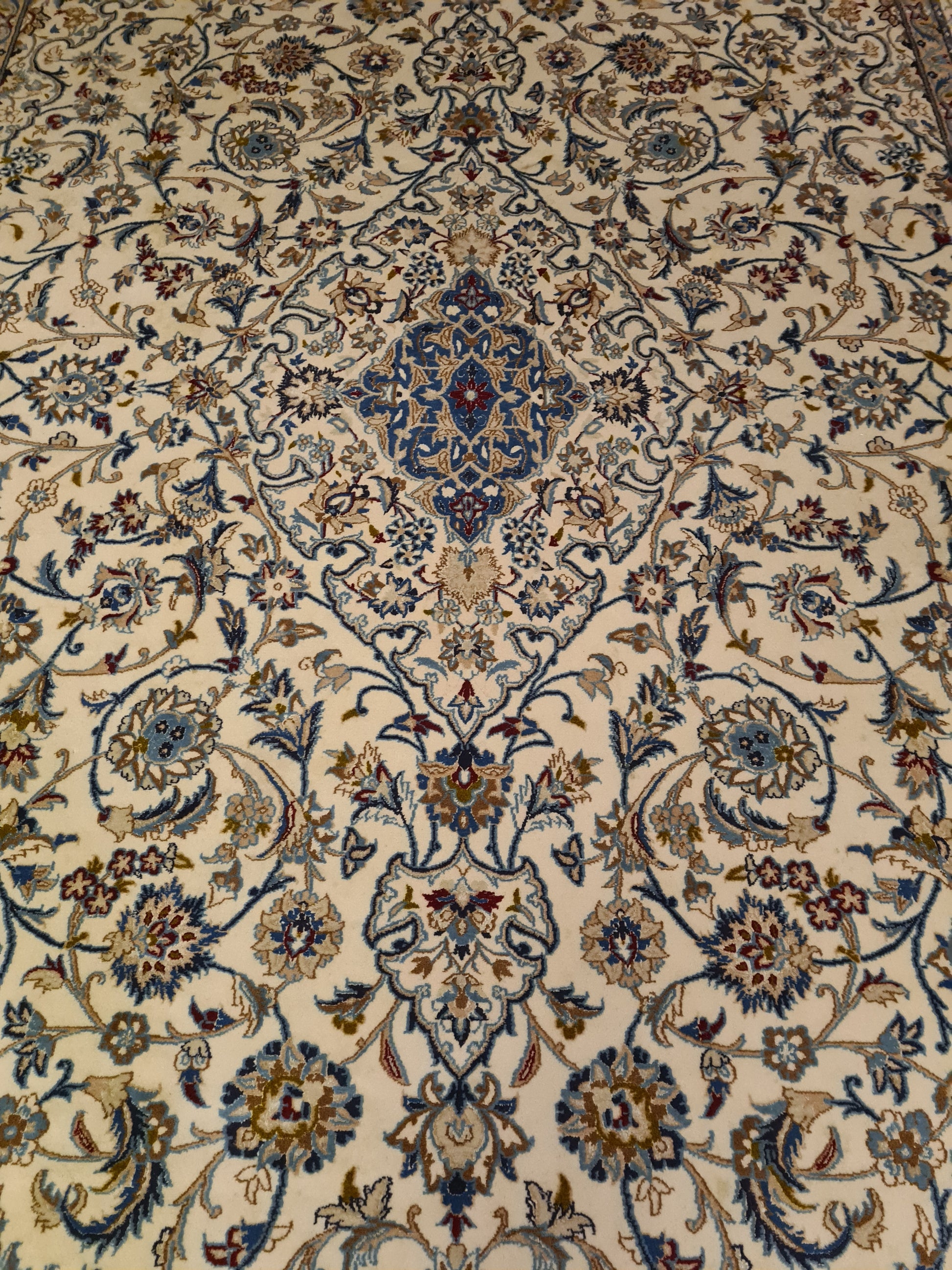 zum Verkauf steht ein prachtvoller handgeknüpfter Perserteppich aus Nain, ausgeführt in feiner 9 La-Knüpfung. Dieses edle Stück beeindruckt durch seine außergewöhnliche Detailtreue, harmonische Farbgebung und hochwertige Woll- und Seidenqualität – ein echtes Meisterwerk traditioneller persischer Knüpfkunst.