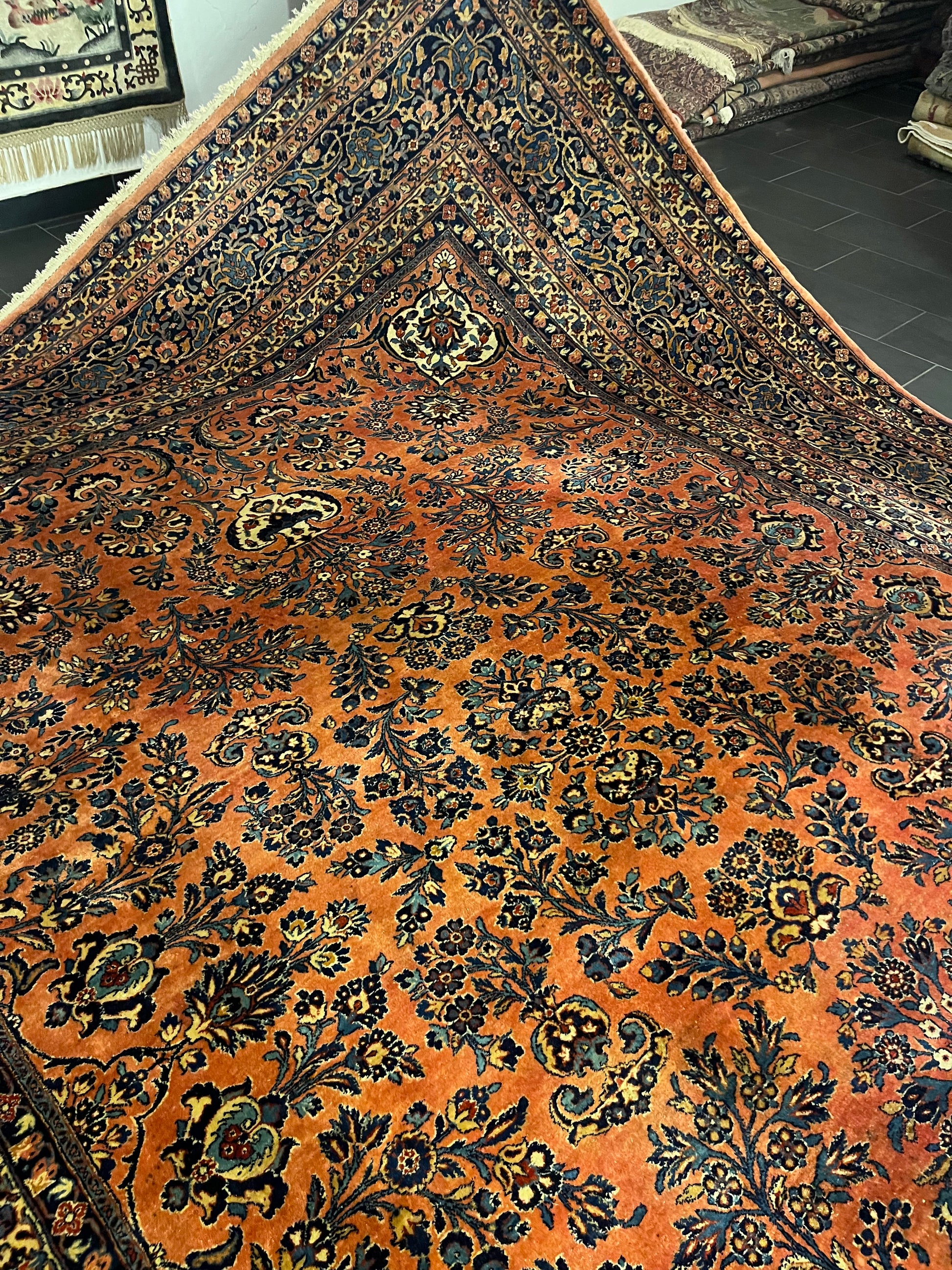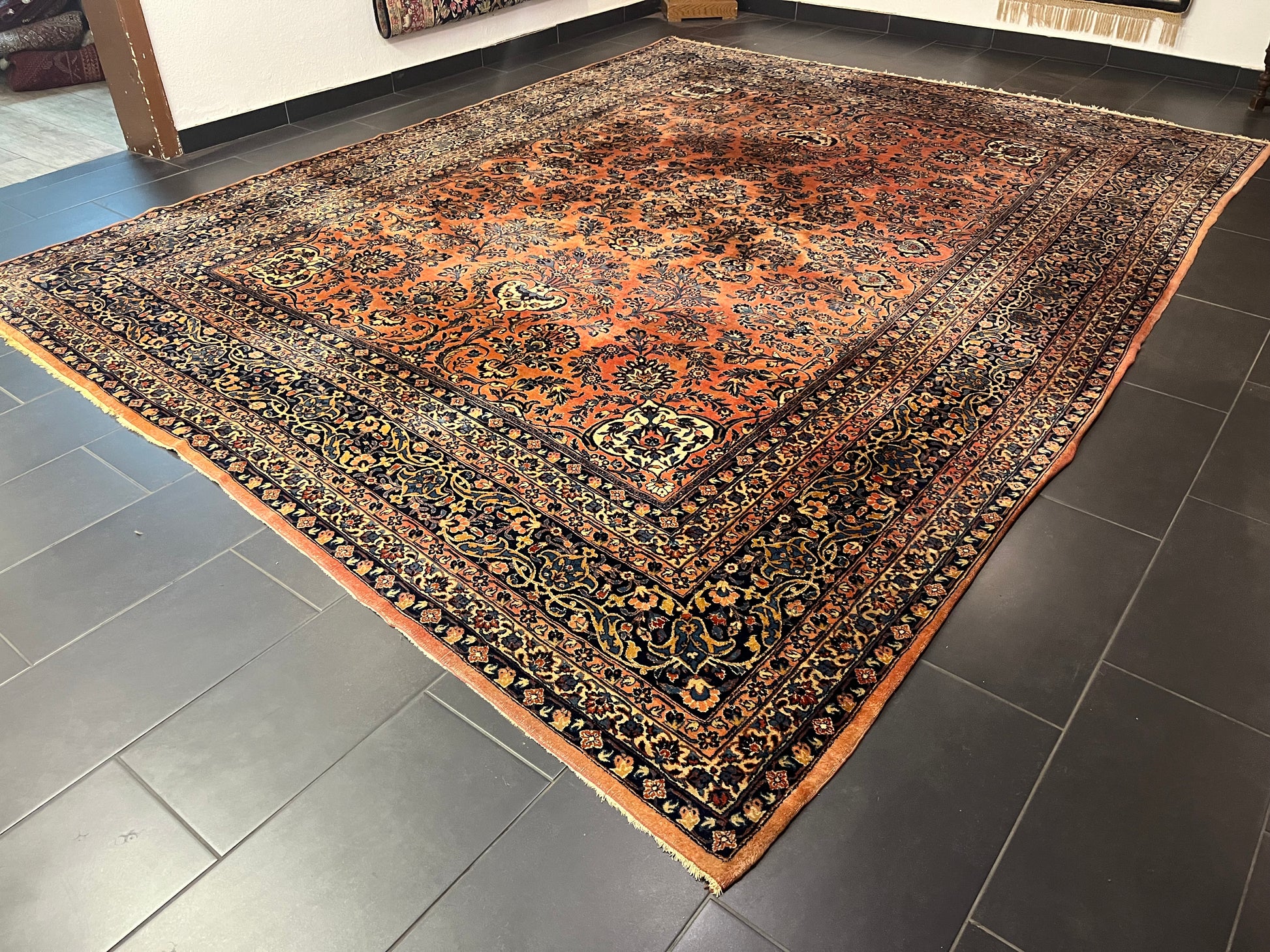 zum Verkauf steht ein prachtvoller, handgeknüpfter Perserteppich aus der traditionsreichen Sarough-Manufaktur. Dieses großformatige Stück ist ein echtes Sammlerobjekt und überzeugt durch seine detailreiche Knüpfkunst, harmonische Farbgestaltung und zeitlose Ausstrahlung.