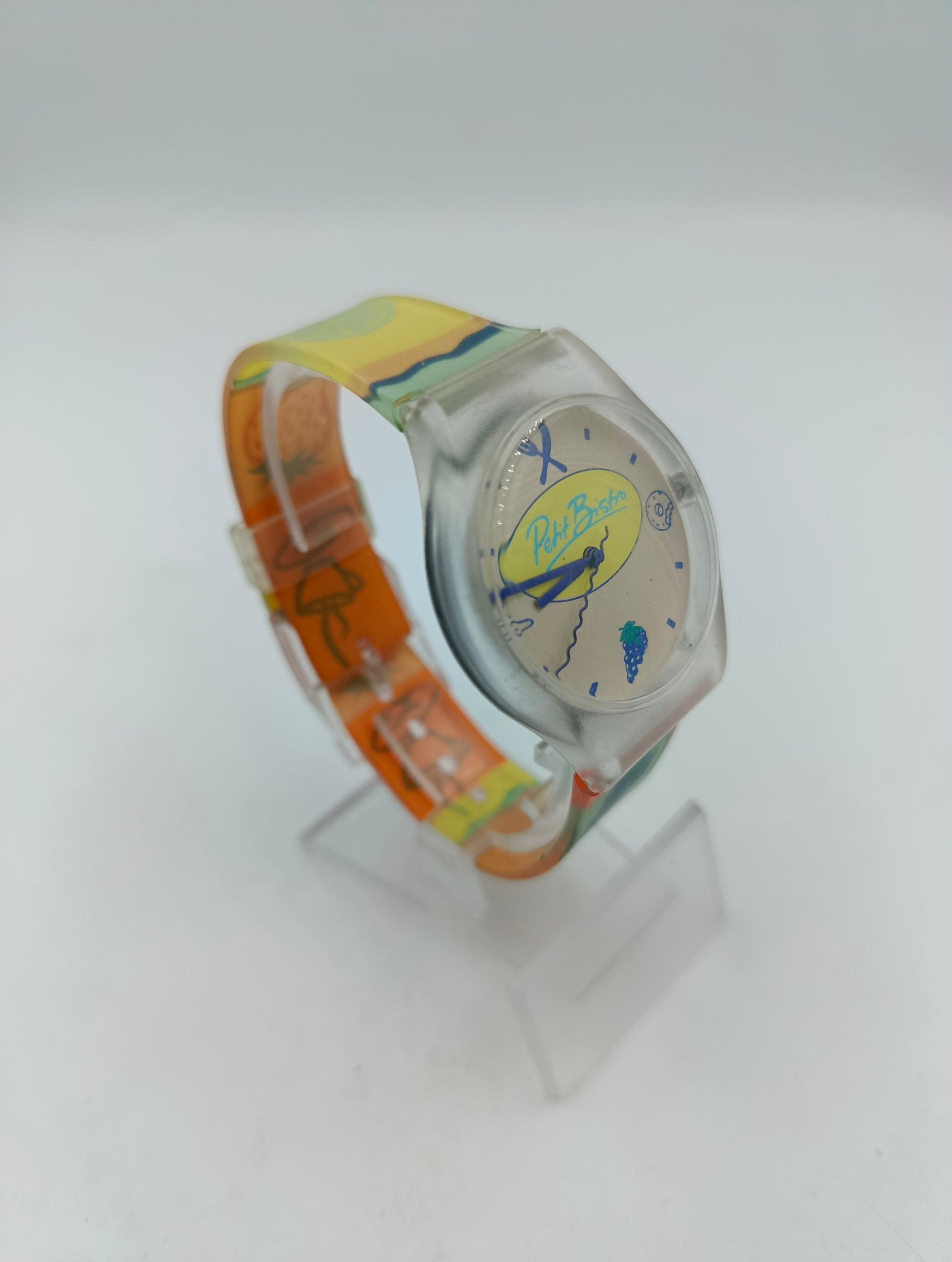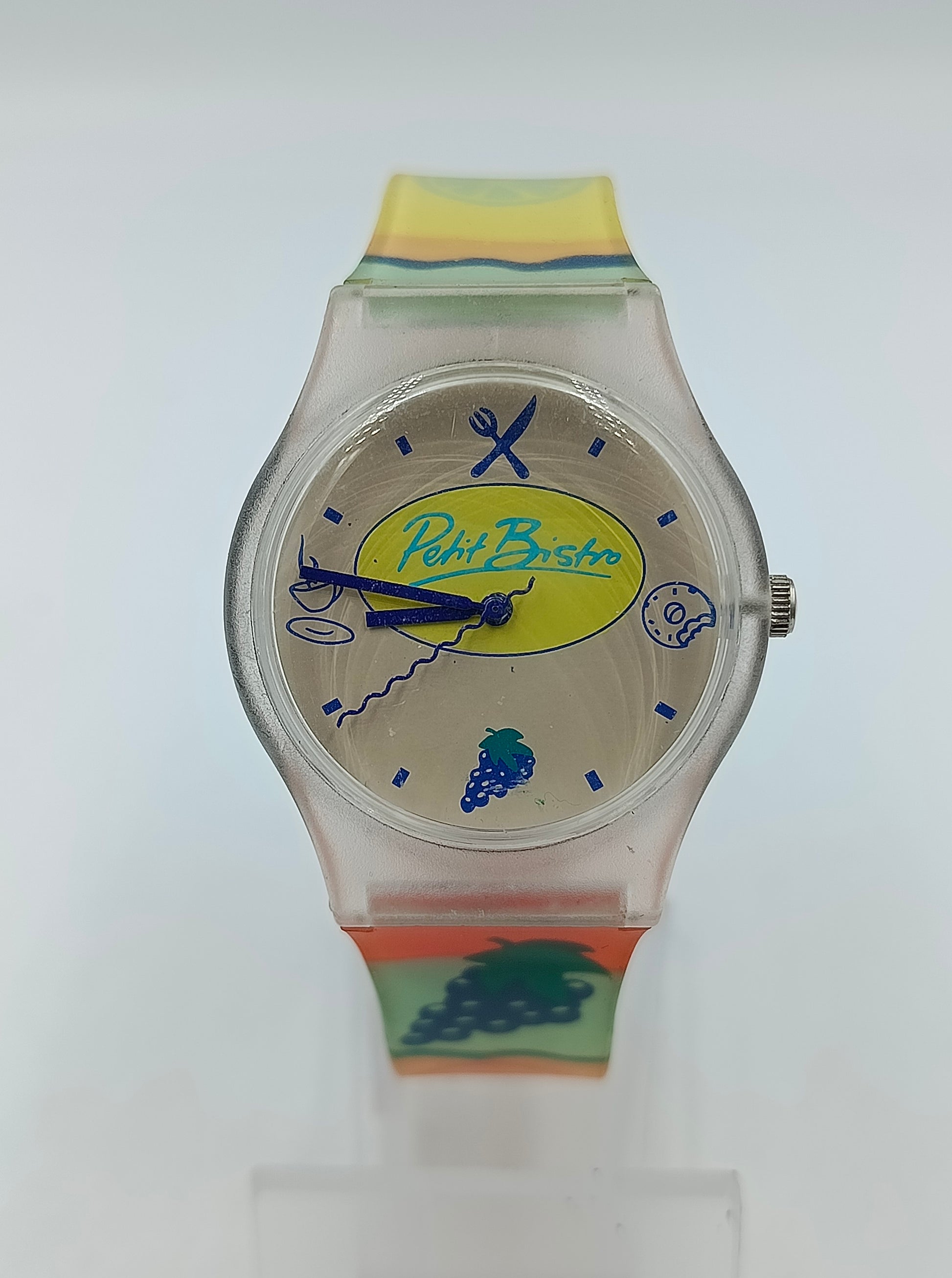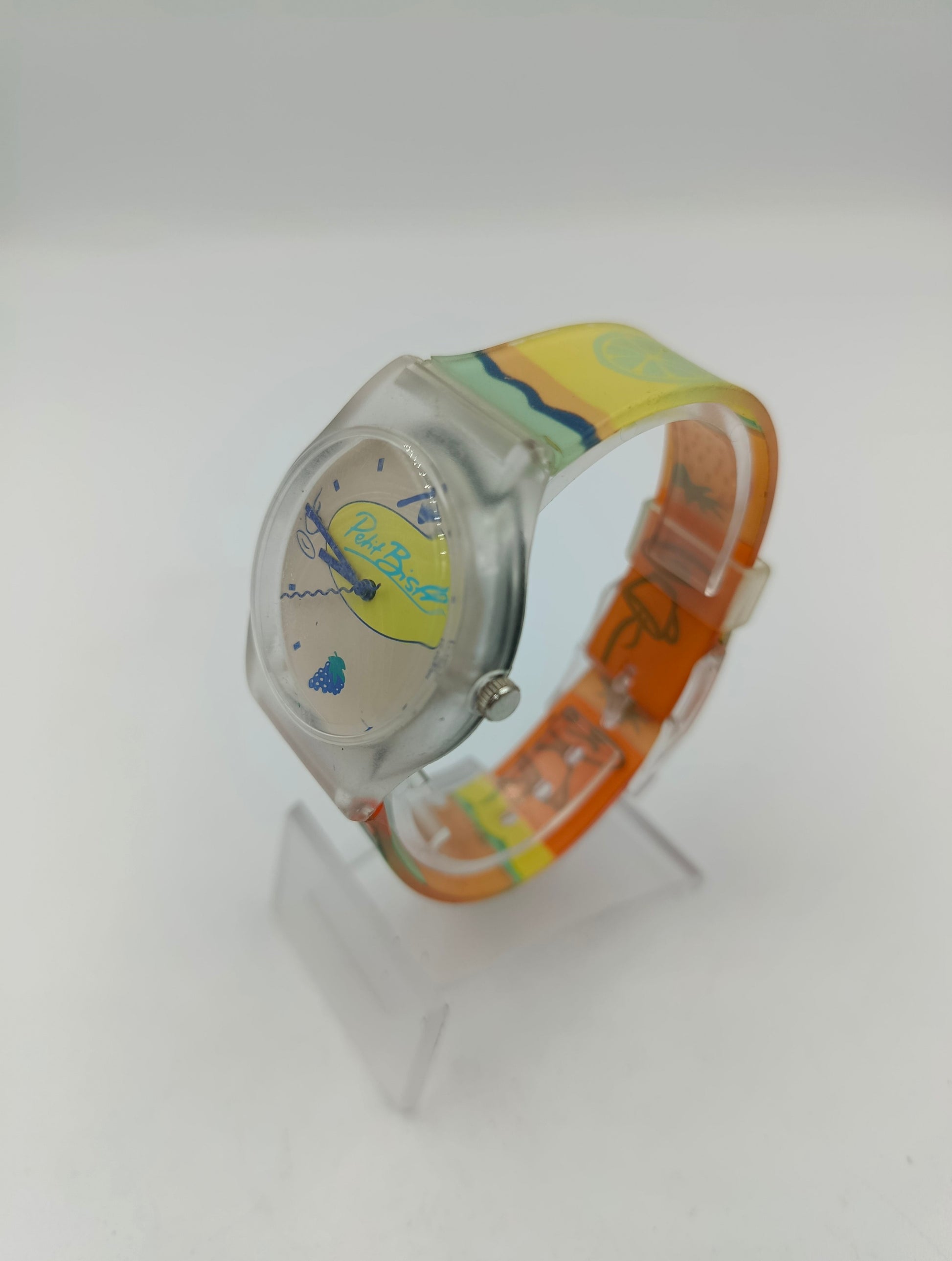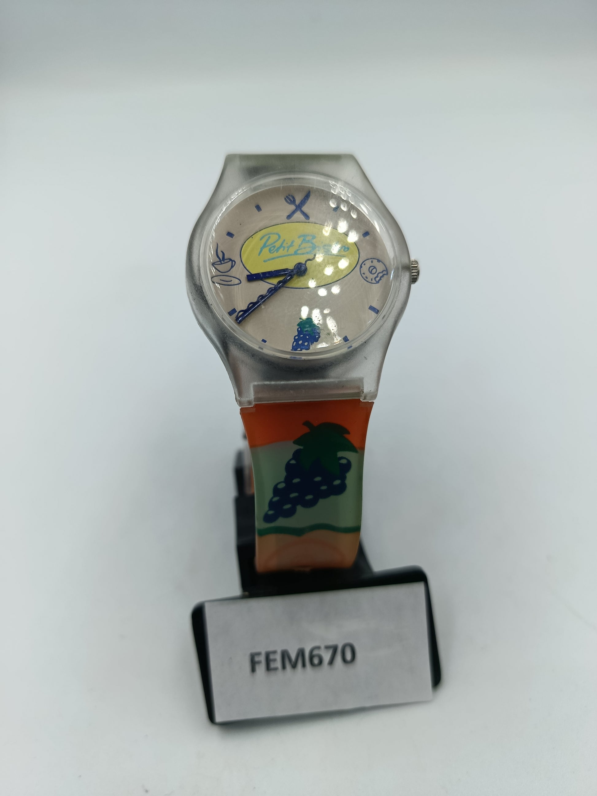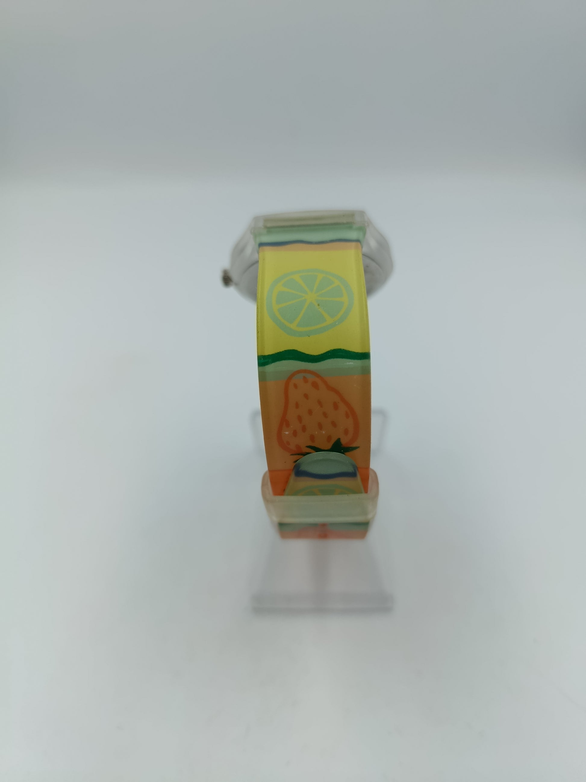 Verspielte Kinderuhr von Petit Bistro mit farbenfrohem Design. Das transparente Gehäuse und das bunte Kunststoffarmband mit Obstmotiven machen sie zu einem echten Hingucker für Kinder. Leicht, bequem und ideal für den täglichen Gebrauch.