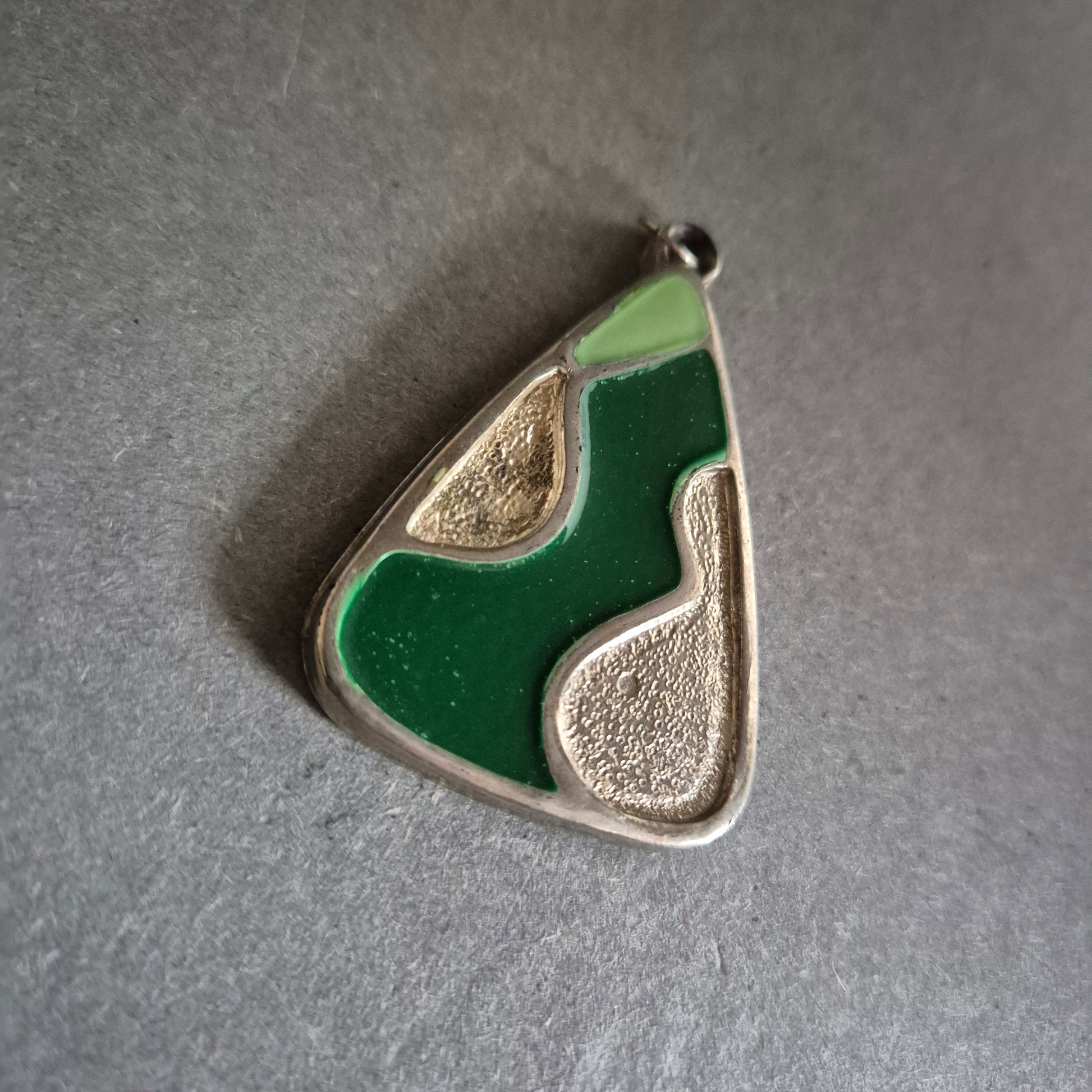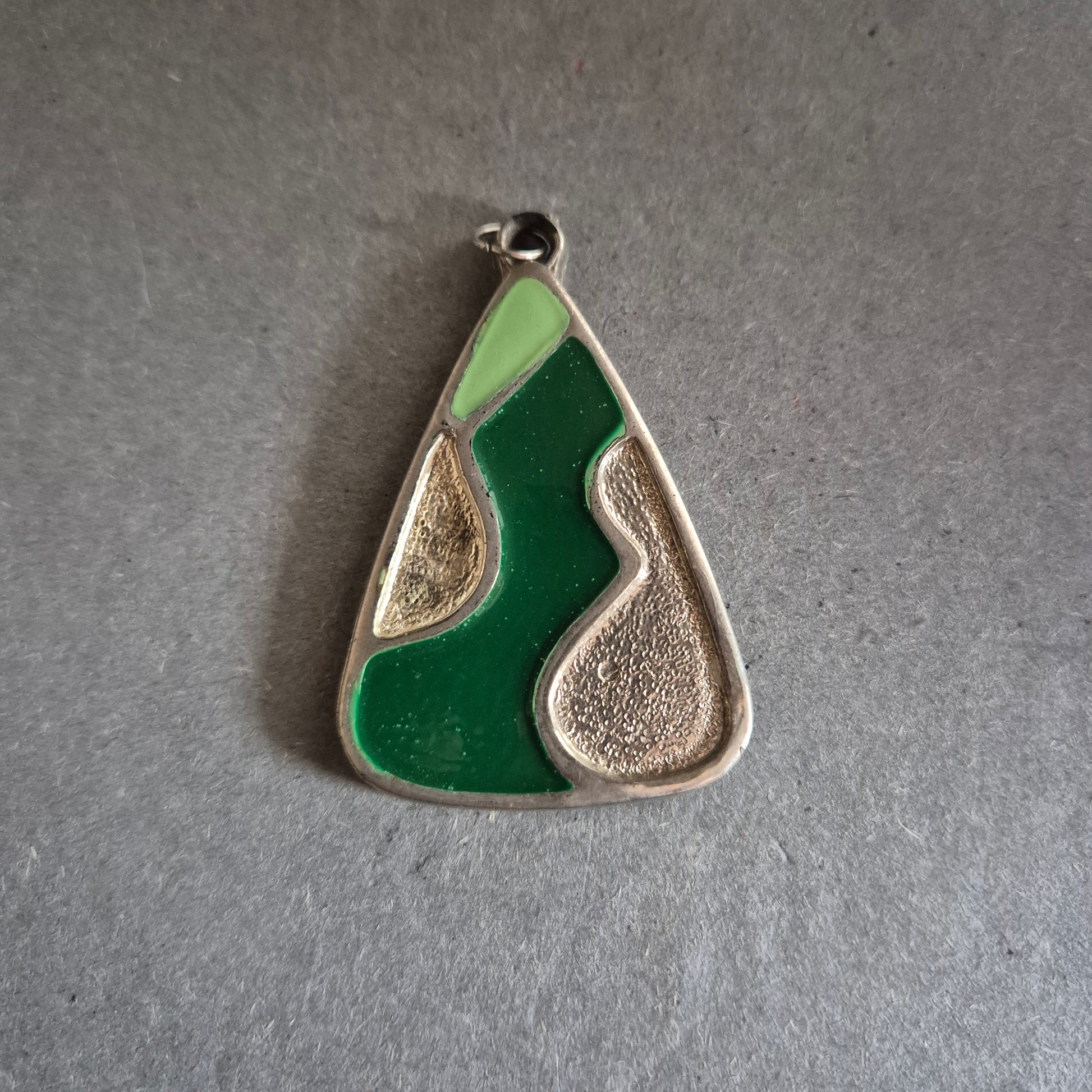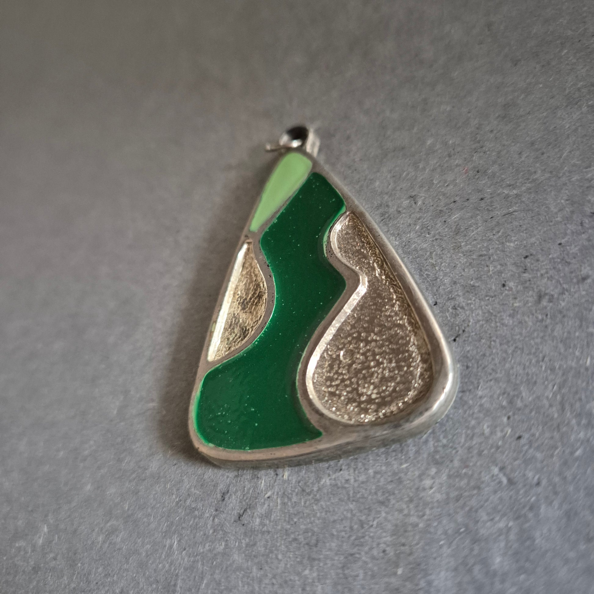 Dieser auffällige Anhänger vereint Retro-Charme mit modernem Design. In einer dreieckigen Grundform gestaltet, überzeugt er durch grüne Emaille-Flächen im Wechselspiel mit strukturierten silberfarbenen Elementen. Das asymmetrische Design und die kräftige Farbkombination machen ihn zu einem echten Statement-Piece für Ketten oder Bänder.