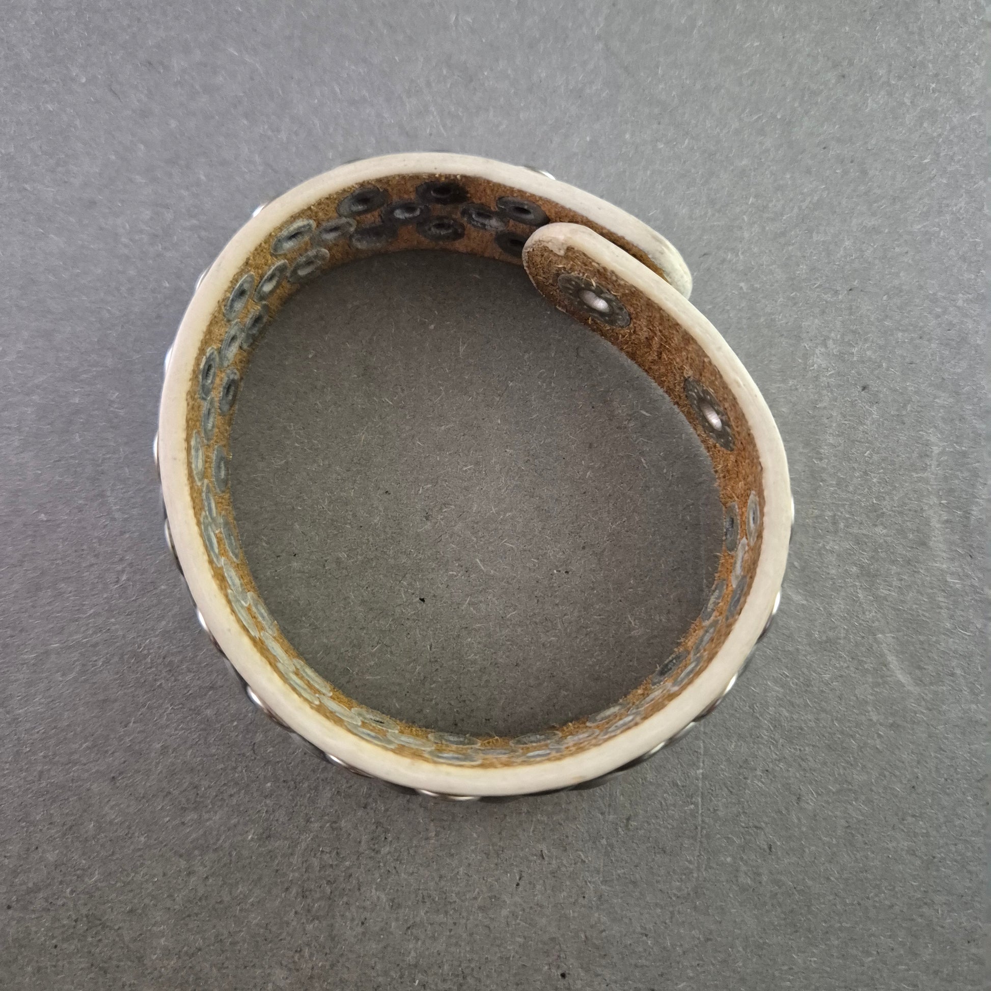 Dieses markante Armband aus hellem Kunstleder setzt mit seinen silberfarbenen Nieten im Kreisdesign ein klares Statement. Das breite Band ist mit zwei Druckknöpfen in der Größe verstellbar und bietet hohen Tragekomfort. Die Kombination aus weichem Innenmaterial und harter Nietenoptik macht dieses Accessoire perfekt für Rock-, Biker- oder Festival-Looks.