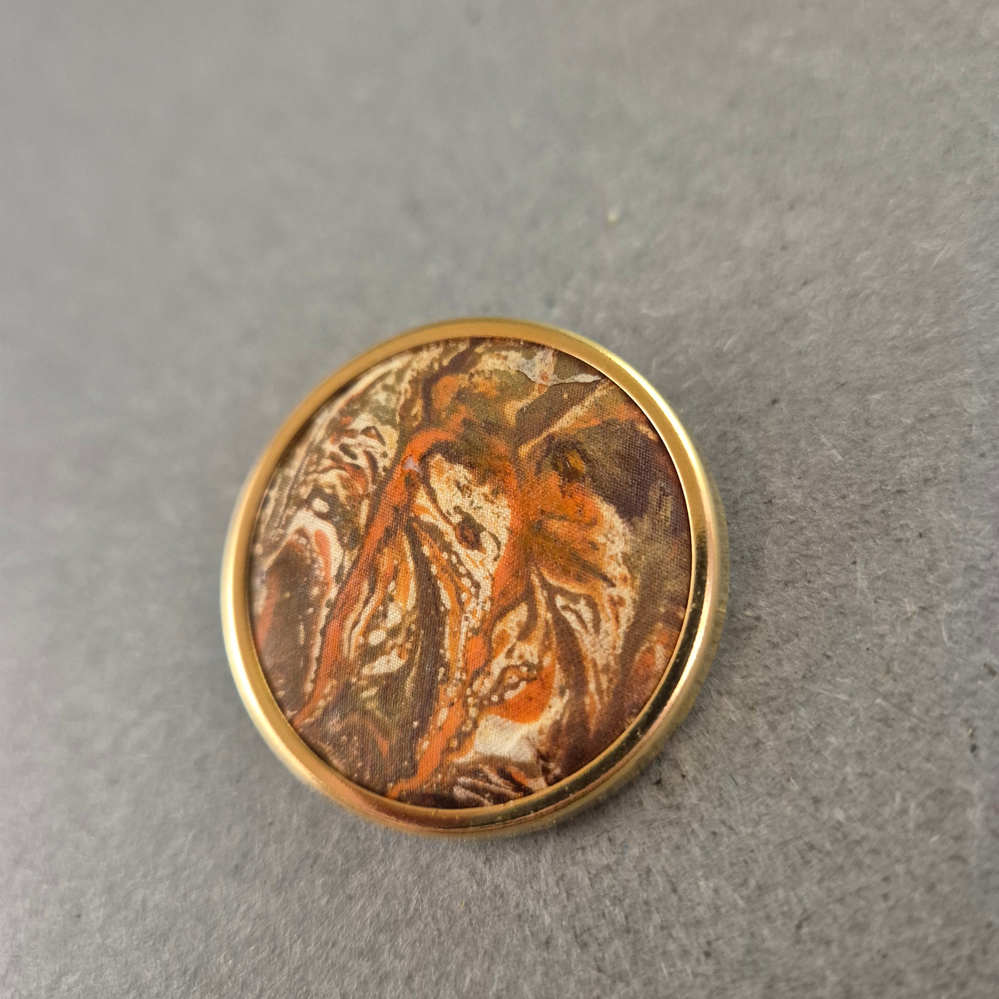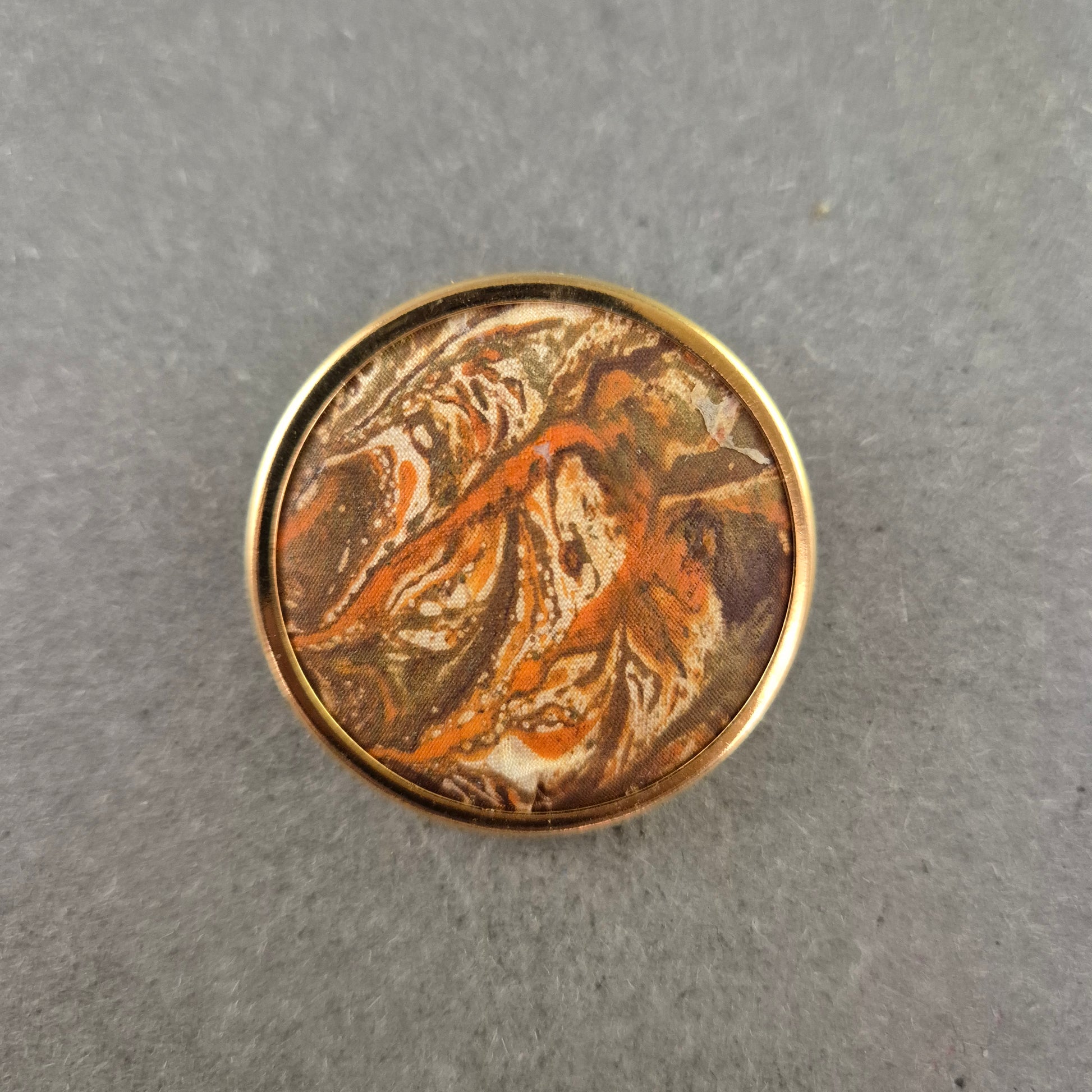 Diese runde Vintage-Brosche besticht durch ihr auffälliges, abstraktes Stoffmuster in warmen Braun-, Orange- und Beigetönen. Eingefasst in einen glänzenden Metallrahmen und ausgestattet mit einer klassischen Sicherheitsnadel auf der Rückseite, lässt sie sich leicht an Kleidung, Taschen oder Hüten befestigen. Ein perfektes Accessoire für Retro-Fans und kreative Outfits.