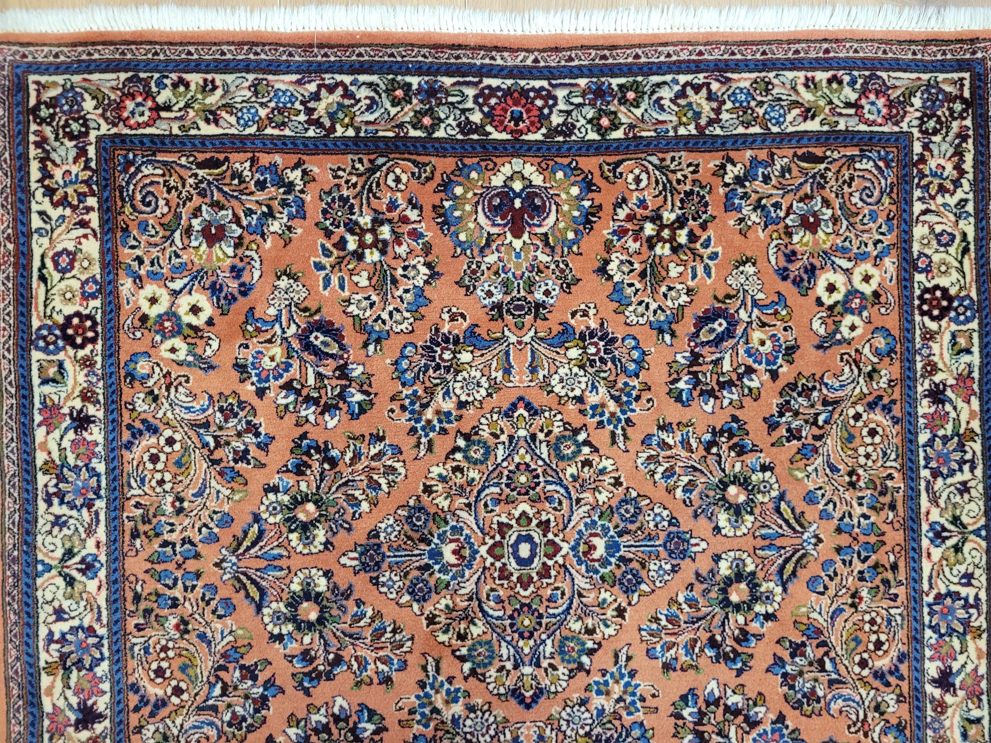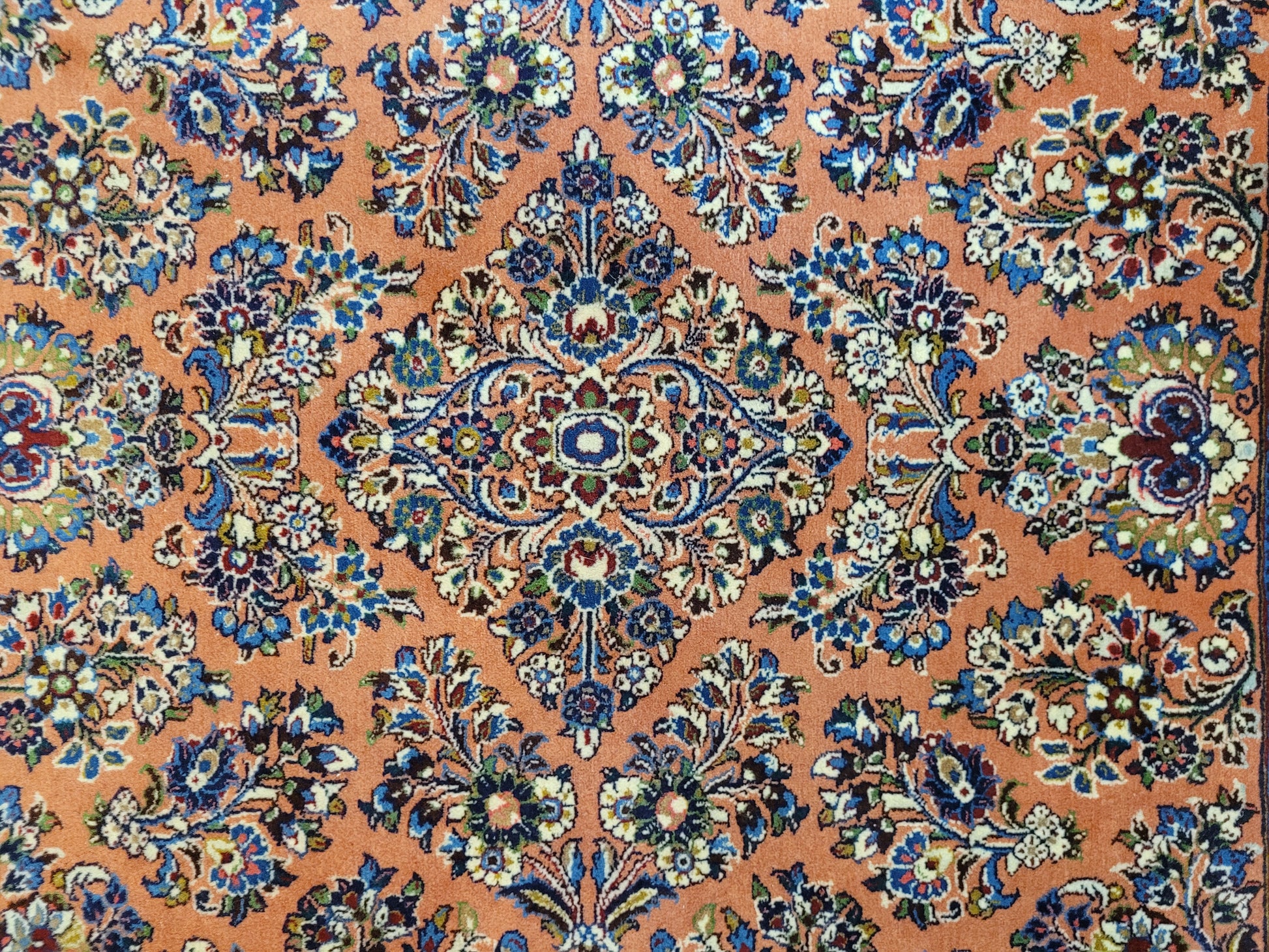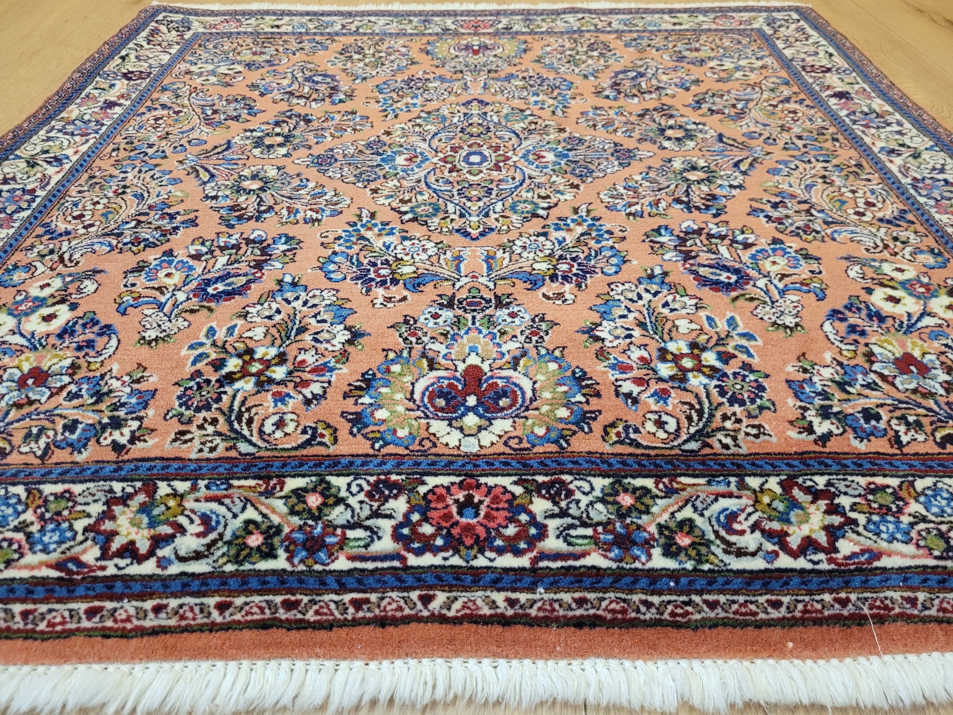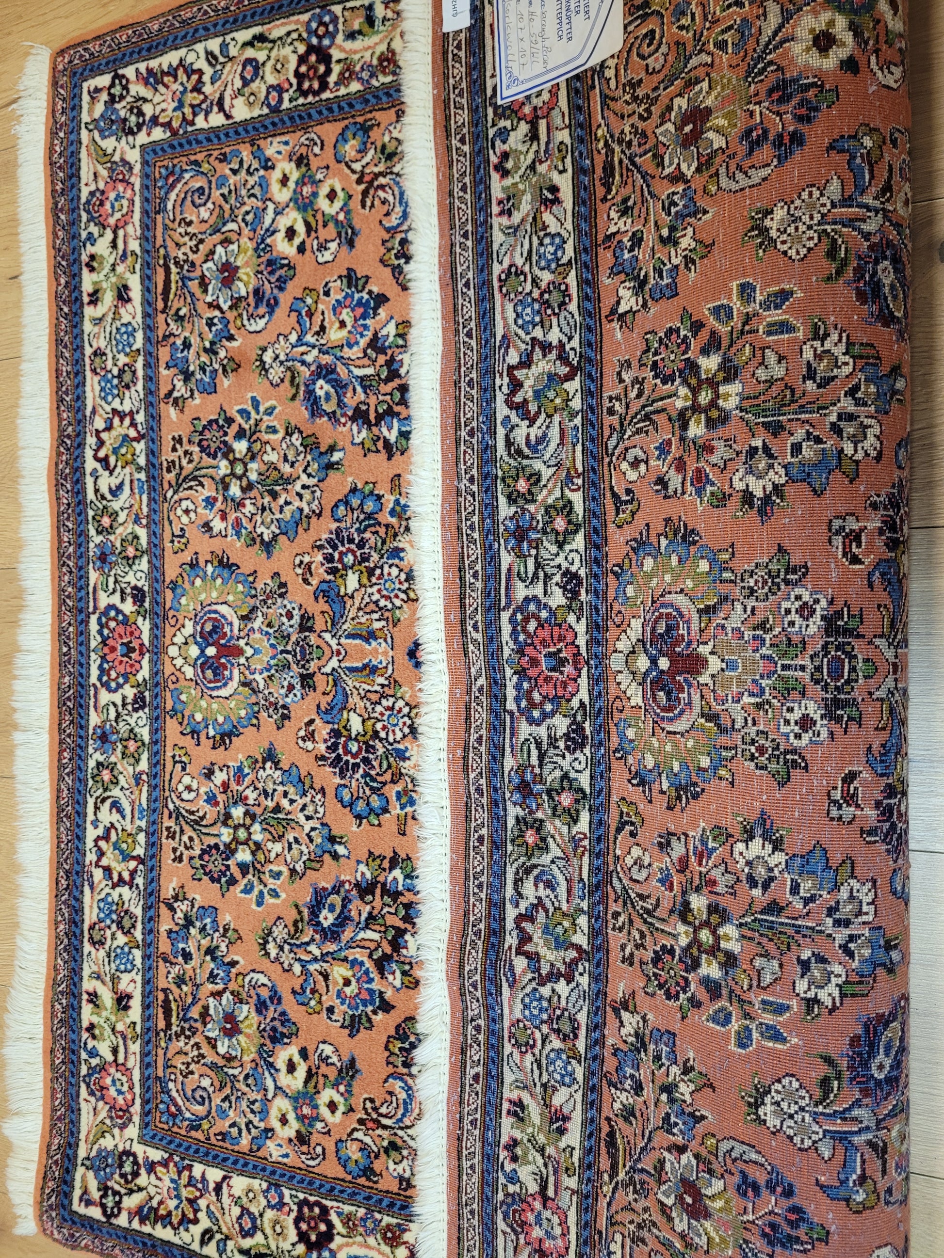 angeboten wird ein erlesener Sarough Teppich aus feiner Korkwolle, handgeknüpft in ausgewogener Komposition. Das Zentrum wird von einem geschwungenen Medaillon betont, umgeben von prachtvollen Blütenranken, stilisierten Palmetten und detailreichen Arabesken. Der warme, lachsfarbene Fond bildet einen edlen Hintergrund für die farbenreiche Musterung, während die Bordüre mit floralen Ornamenten das Gesamtbild elegant abrundet.