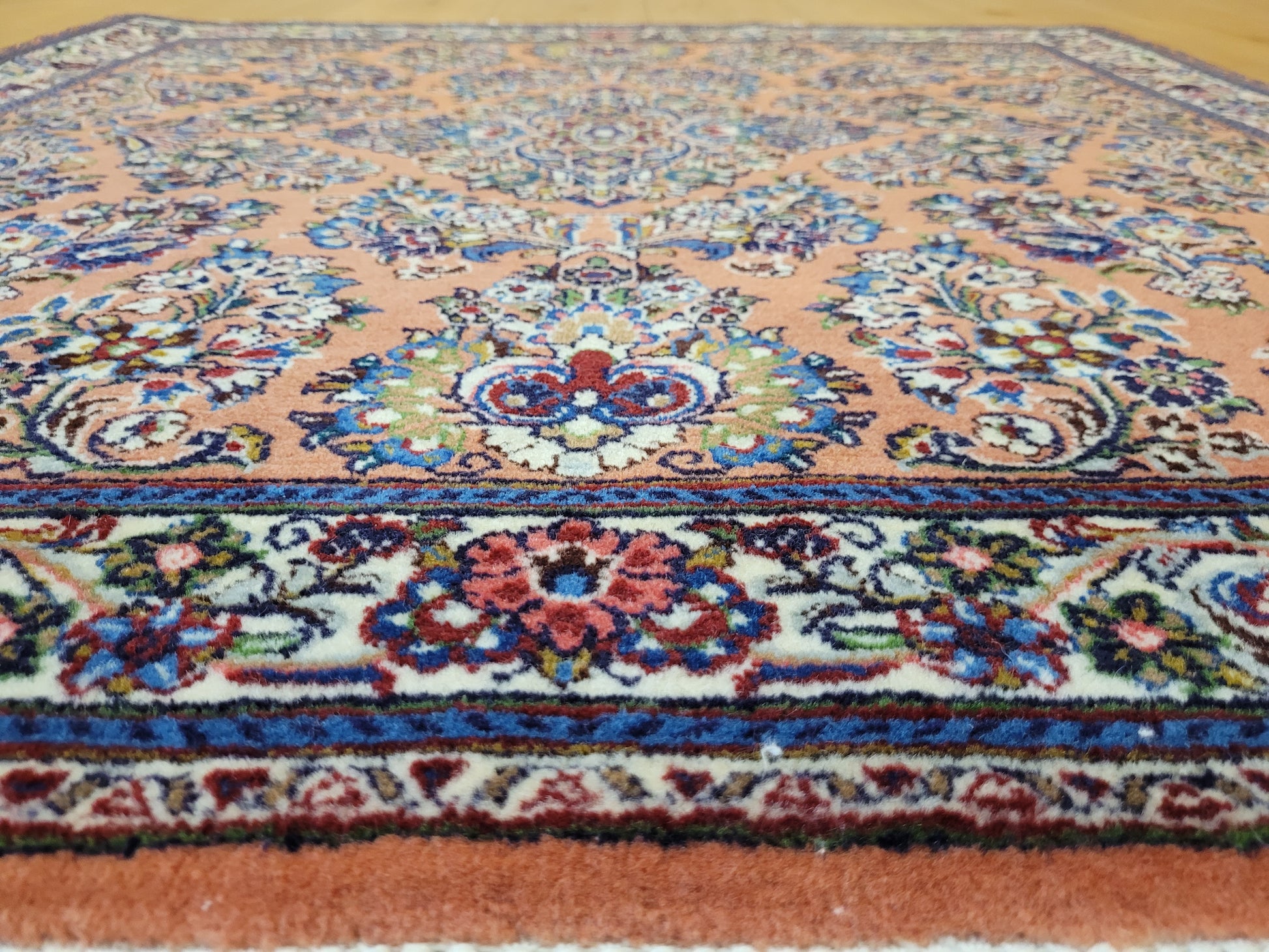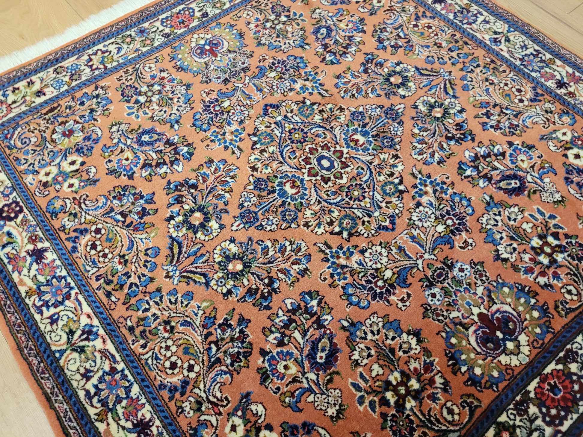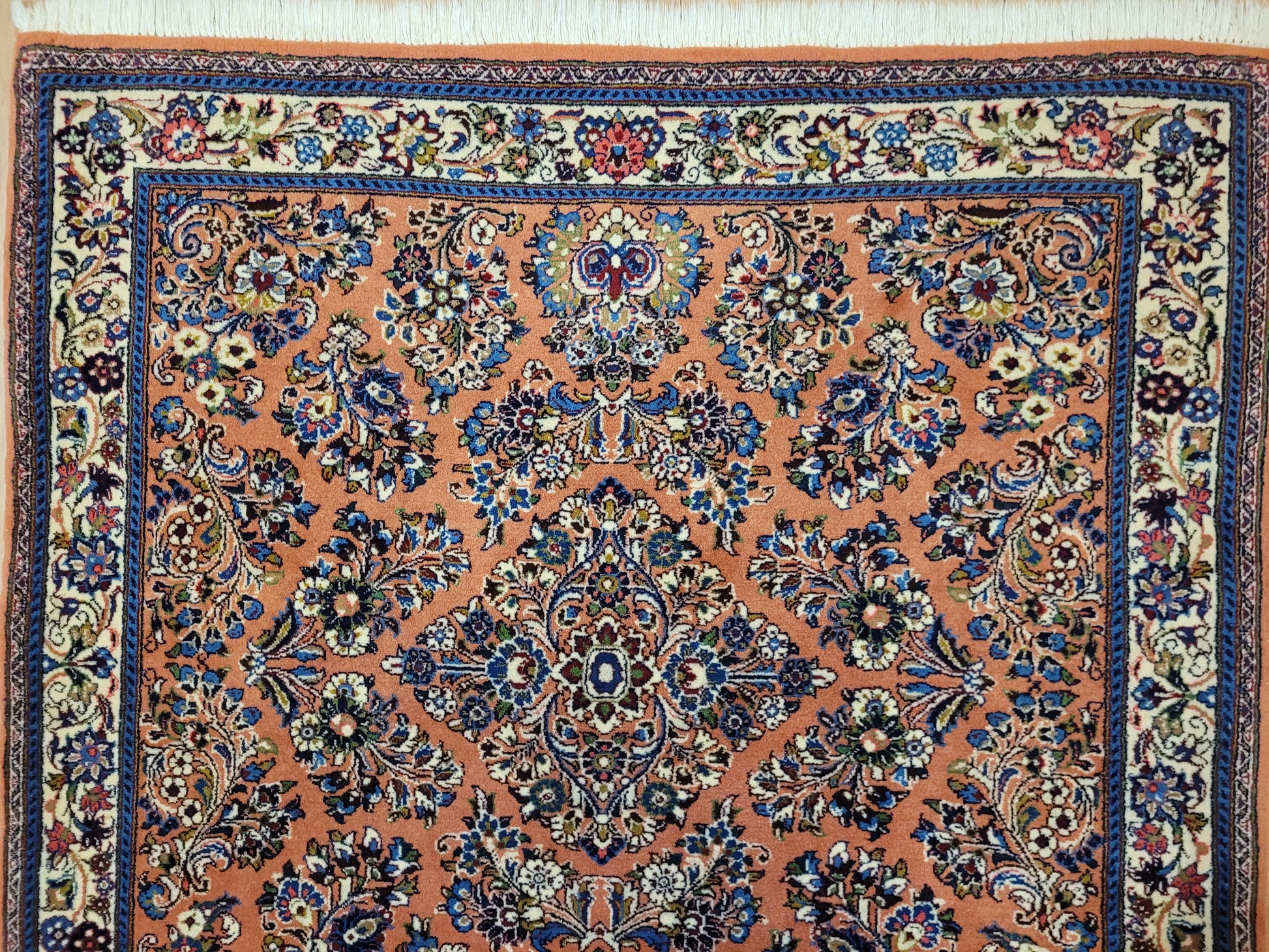 angeboten wird ein erlesener Sarough Teppich aus feiner Korkwolle, handgeknüpft in ausgewogener Komposition. Das Zentrum wird von einem geschwungenen Medaillon betont, umgeben von prachtvollen Blütenranken, stilisierten Palmetten und detailreichen Arabesken. Der warme, lachsfarbene Fond bildet einen edlen Hintergrund für die farbenreiche Musterung, während die Bordüre mit floralen Ornamenten das Gesamtbild elegant abrundet.