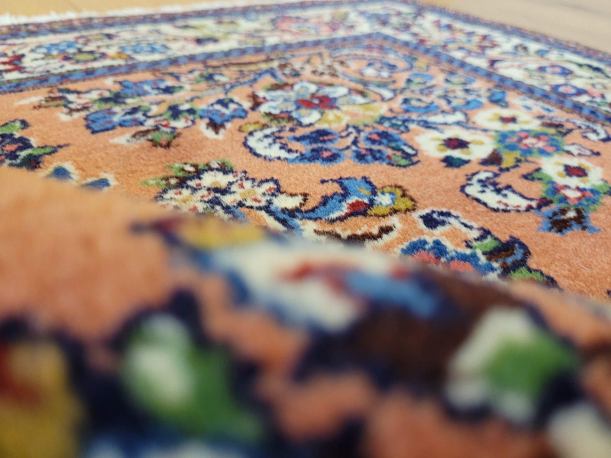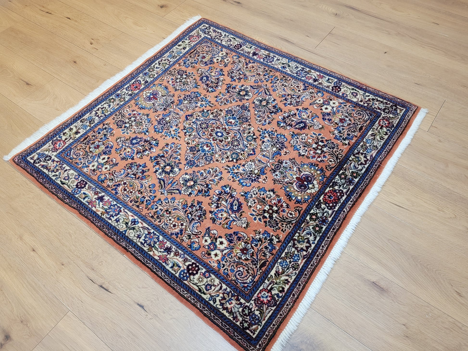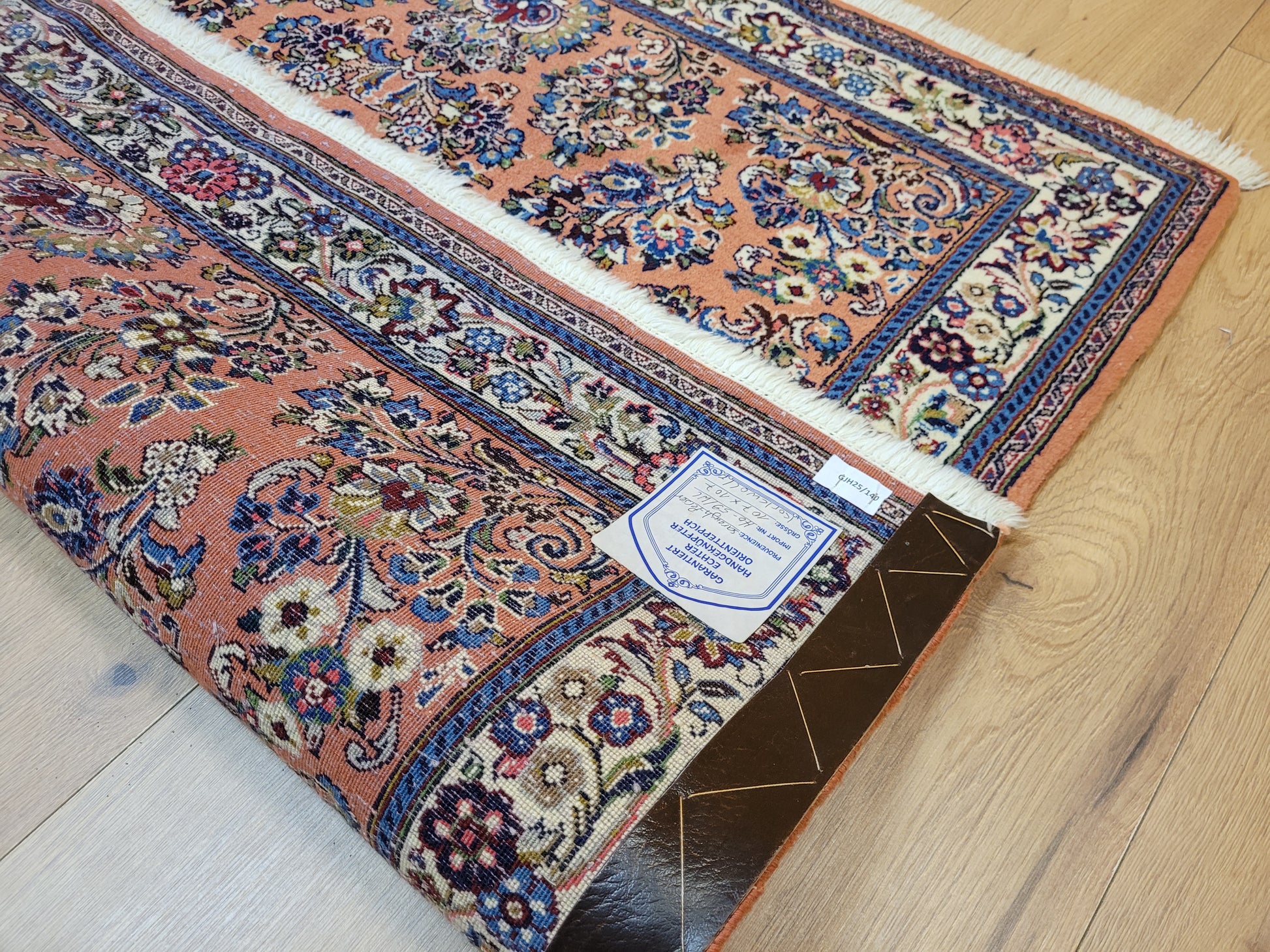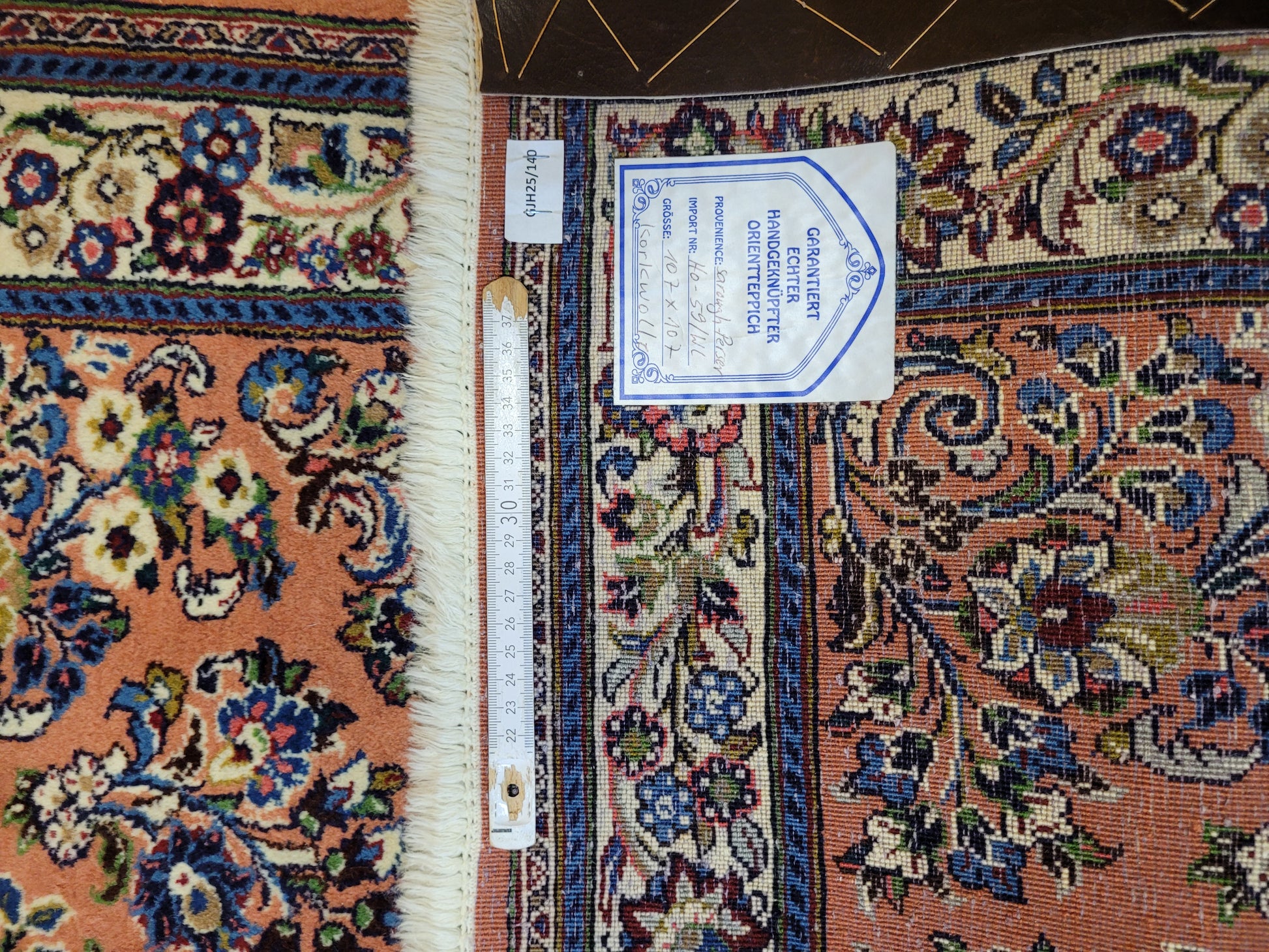 angeboten wird ein erlesener Sarough Teppich aus feiner Korkwolle, handgeknüpft in ausgewogener Komposition. Das Zentrum wird von einem geschwungenen Medaillon betont, umgeben von prachtvollen Blütenranken, stilisierten Palmetten und detailreichen Arabesken. Der warme, lachsfarbene Fond bildet einen edlen Hintergrund für die farbenreiche Musterung, während die Bordüre mit floralen Ornamenten das Gesamtbild elegant abrundet.