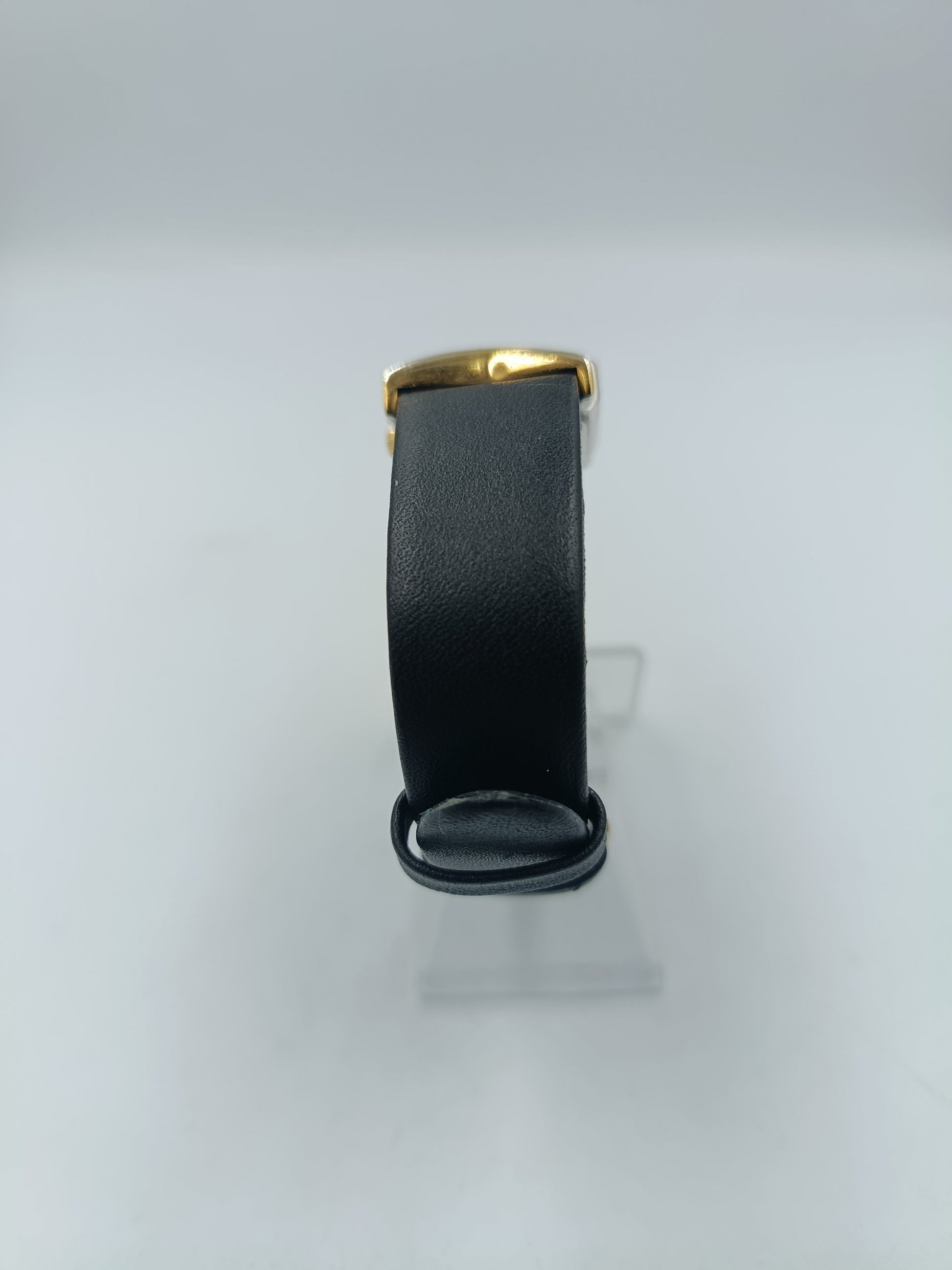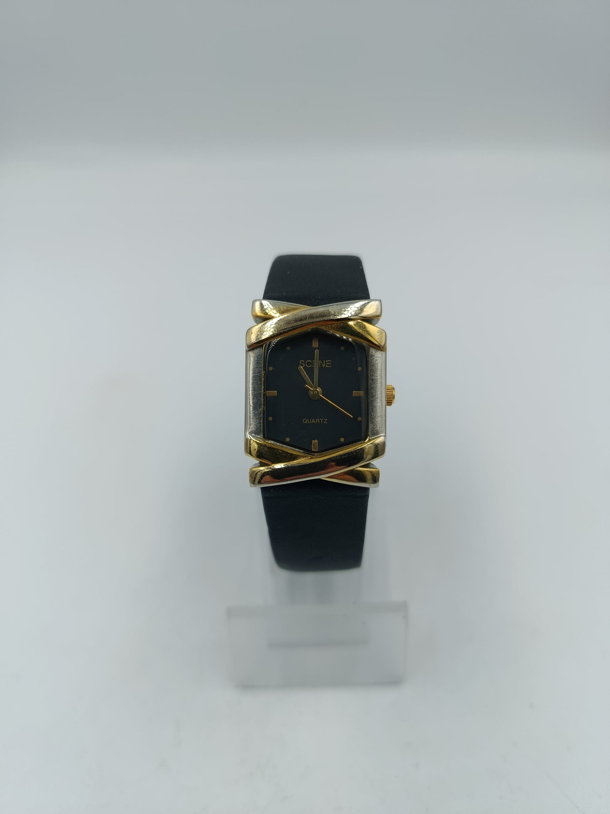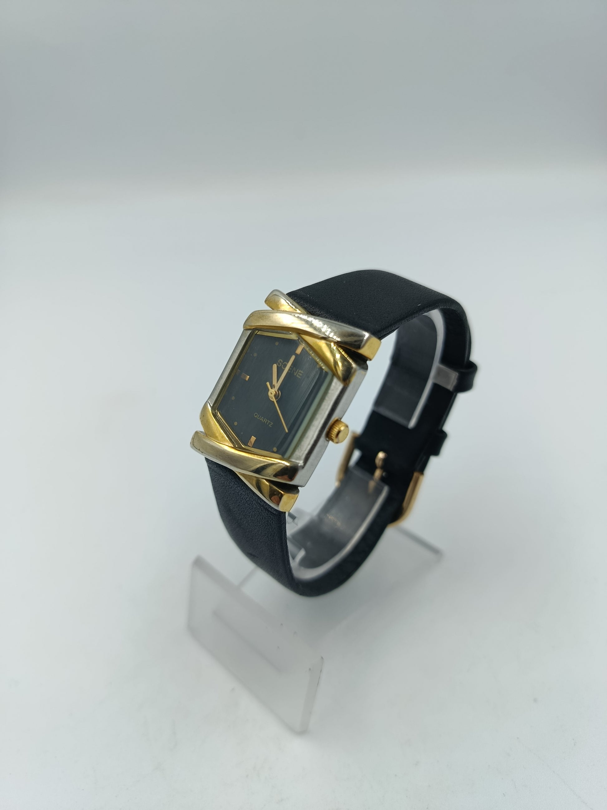 Elegante Damenuhr von Scene mit rechteckigem Gehäuse und edlem Design. Das schwarze Zifferblatt und das gold-silberfarbene Gehäuse verleihen der Uhr einen stilvollen Kontrast. Das schlichte Lederarmband sorgt für hohen Tragekomfort und einen klassischen Look.