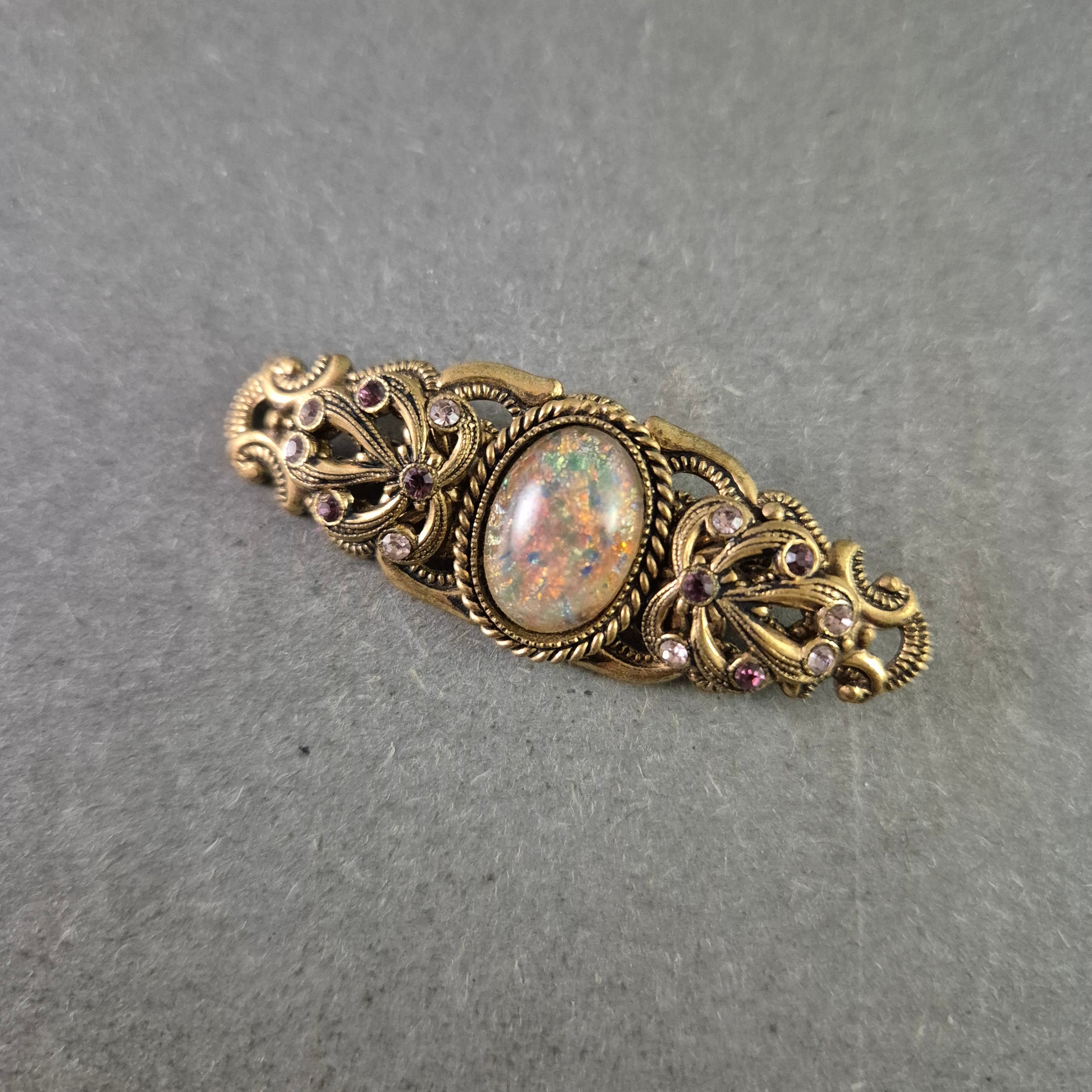 Diese kunstvolle Brosche im Jugendstil-Design überzeugt durch ihr detailreiches Ornamentmuster in goldfarbener Ausführung. Im Zentrum befindet sich ein ovaler Stein in Opaloptik, der durch seine schimmernde Farbvielfalt bezaubert. Zusätzlich sind kleine violette Schmucksteine in die filigrane Verzierung eingefasst, die der Brosche einen edlen Charakter verleihen.