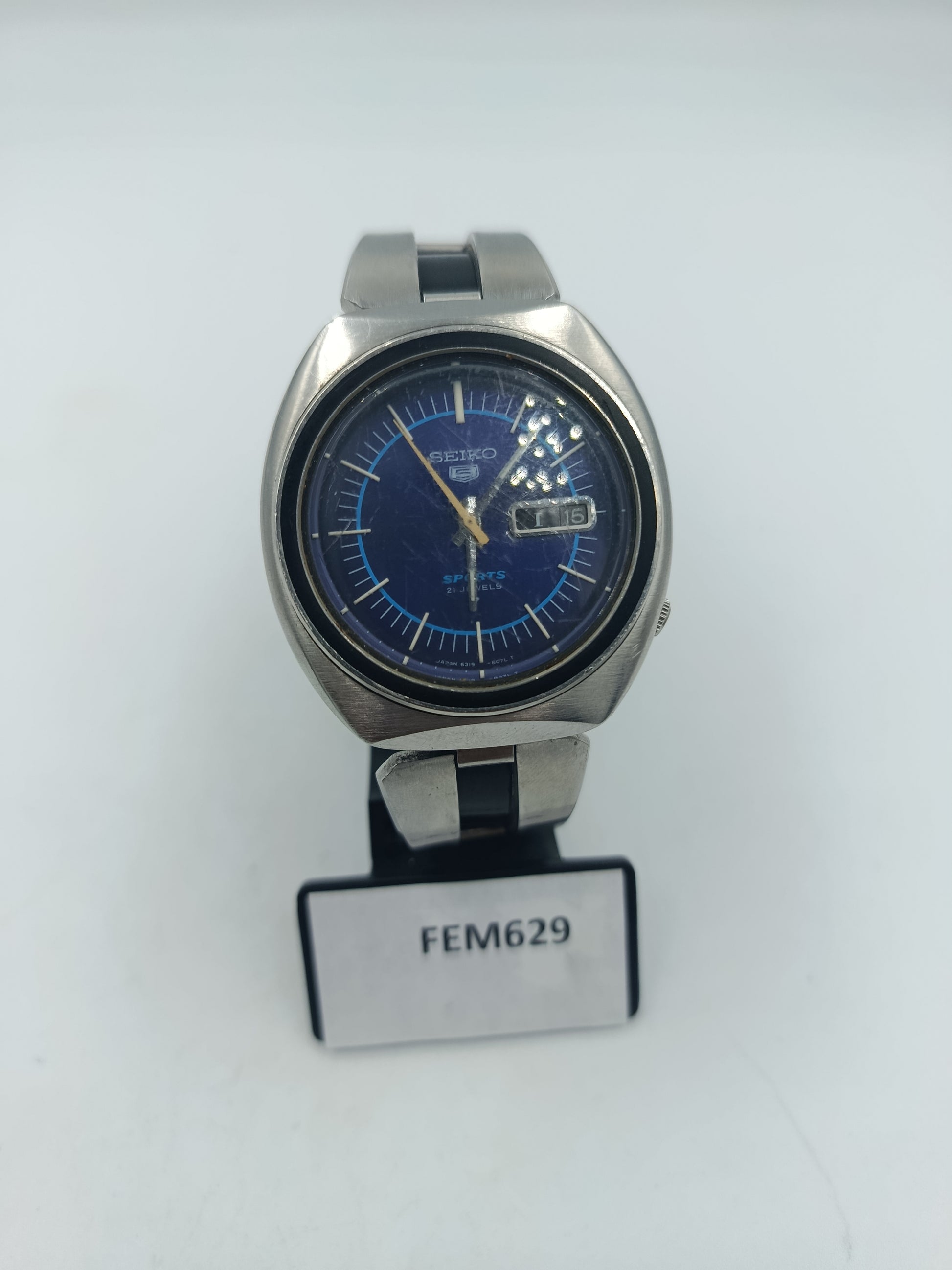 Klassische Seiko 5 Sports Herrenarmbanduhr mit blauem Zifferblatt und automatischem Uhrwerk. Das markante 70er-Jahre Design mit Edelstahlgehäuse und sportlichen Akzenten macht dieses Modell zu einem begehrten Vintage-Stück für Sammler.