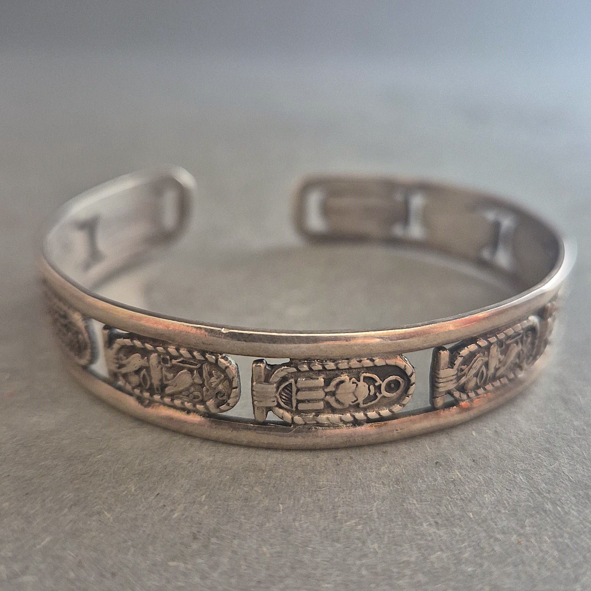 Silbernes Armspange mit ägyptischen Symbolen – Graviertes Vintage-Design