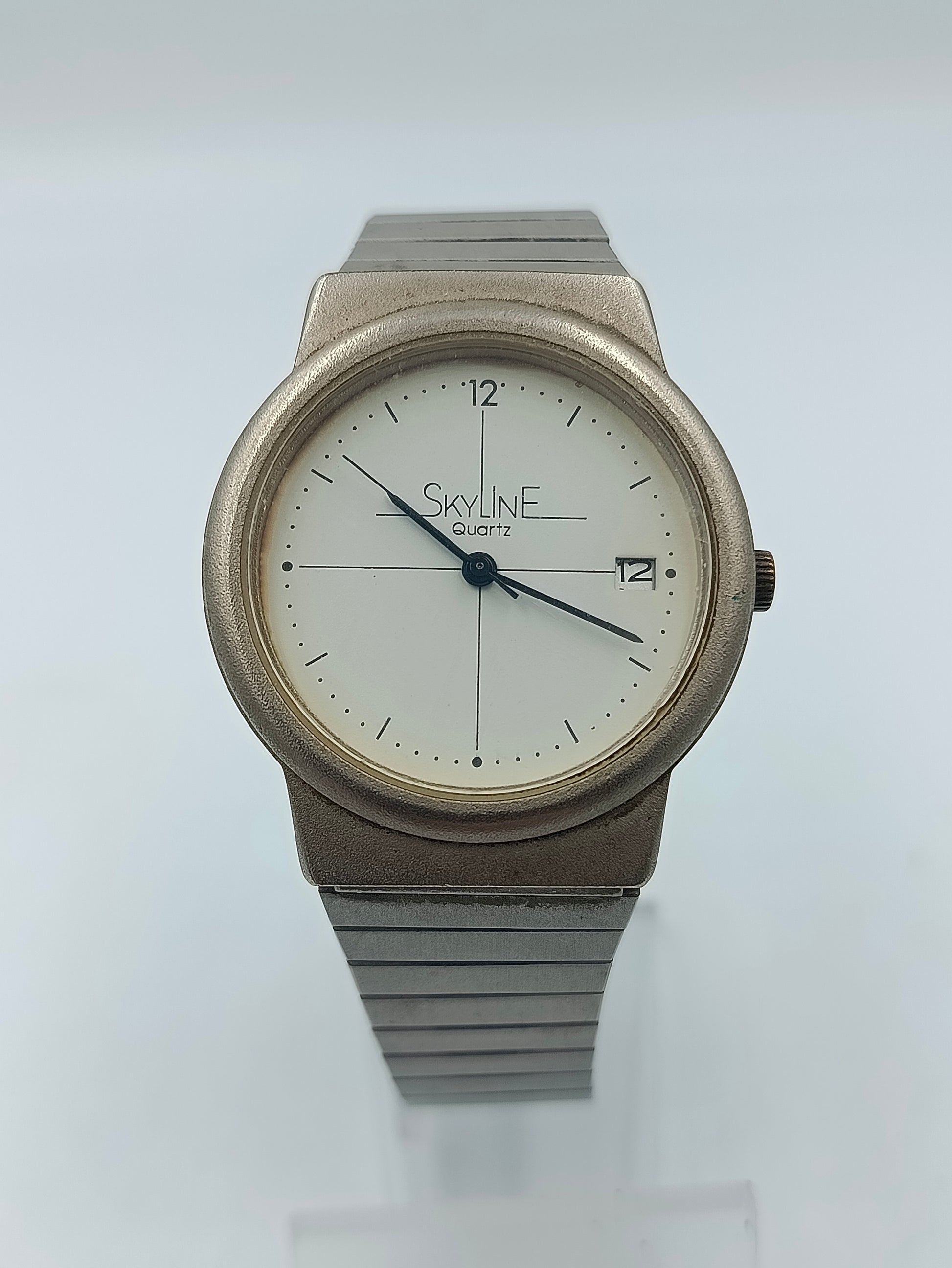 Schlichte und elegante Skyline Quartz Armbanduhr mit klassischem weißen Zifferblatt und silberfarbenem Edelstahlarmband. Das minimalistische Design mit Datumsanzeige auf 3 Uhr macht sie zu einem zeitlosen Begleiter für Alltag und Business.
