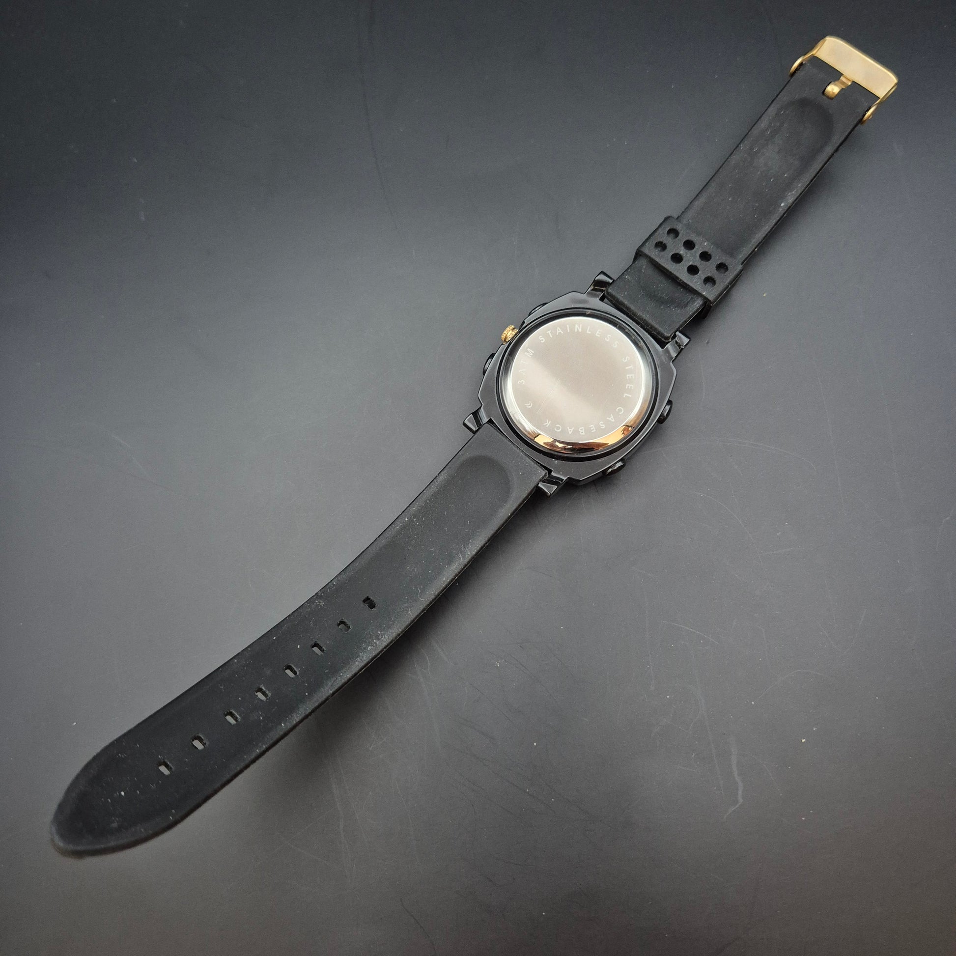 Diese sportliche Eclipse Sumotu Uhr kombiniert analoge und digitale Zeitanzeige in einem markanten Design. Das schwarze Zifferblatt mit goldenen Akzenten und klaren Zeigern bietet eine gute Ablesbarkeit. Das robuste schwarze Silikonarmband und die 3 ATM Wasserdichtigkeit machen sie zum idealen Begleiter für aktive Lebensstile.