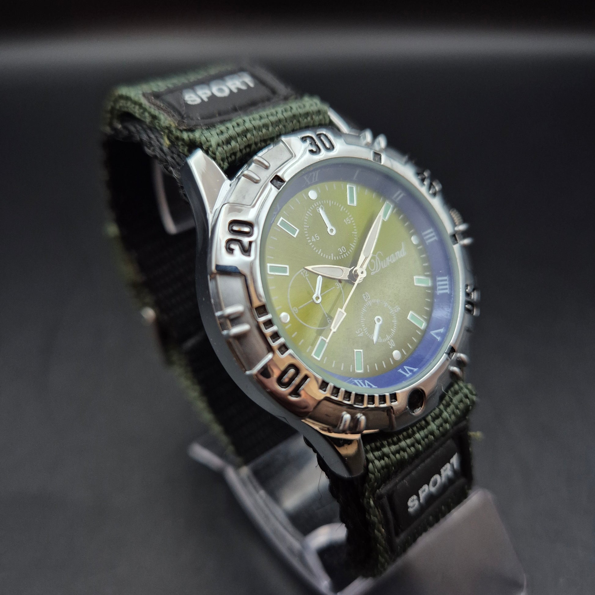 Diese Patrol Herren Uhr präsentiert sich im robusten Military-Stil mit grünem Stoffarmband und sportlichem Edelstahlgehäuse. Das grüne Zifferblatt mit dekorativen Totalisatoren verleiht der Uhr ein dynamisches Erscheinungsbild – ideal für Freizeit oder Outdoor-Aktivitäten. Hinweis: Die Chronographen-Zähler sind nur Dekor und ohne Funktion.