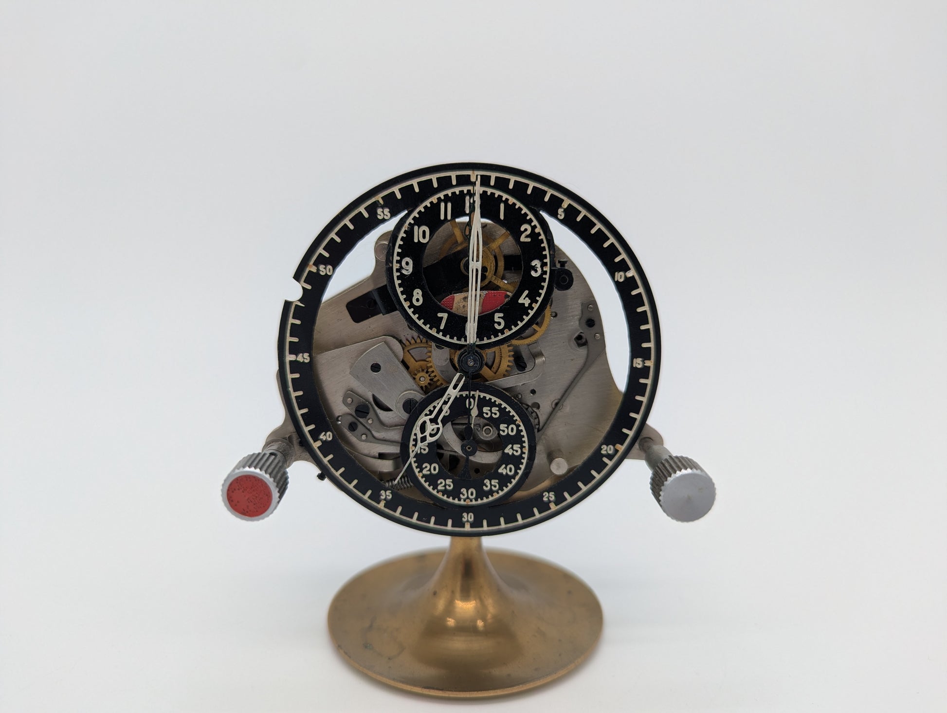 Bei diesem Stück handelt es sich um ein mechanisches Stoppuhr- bzw. Chronographenwerk, das auf einem Messingfuß montiert ist. Es zeigt die vollständige Mechanik offen – Zahnräder, Hemmung und Schaltteile sind gut sichtbar.