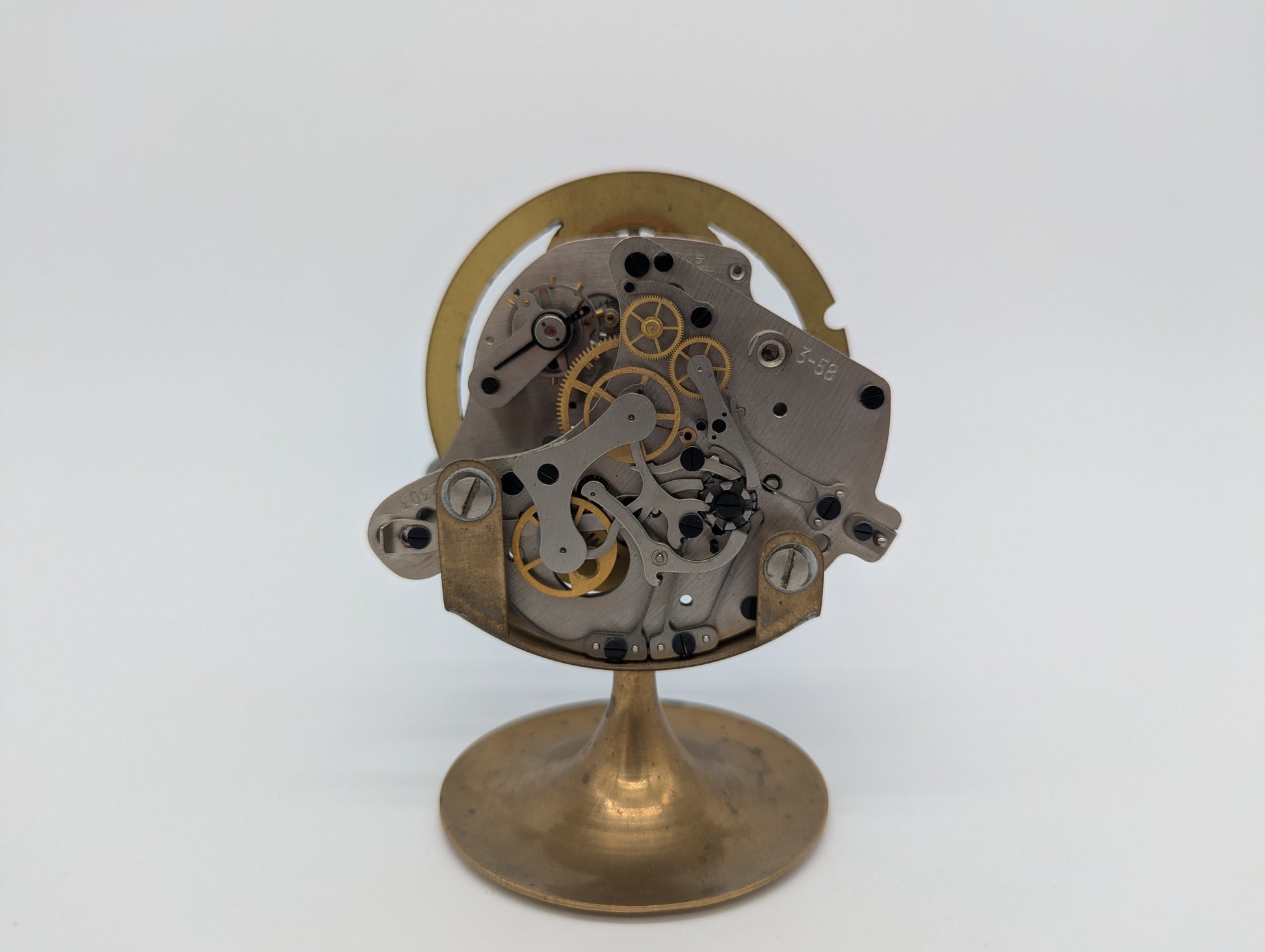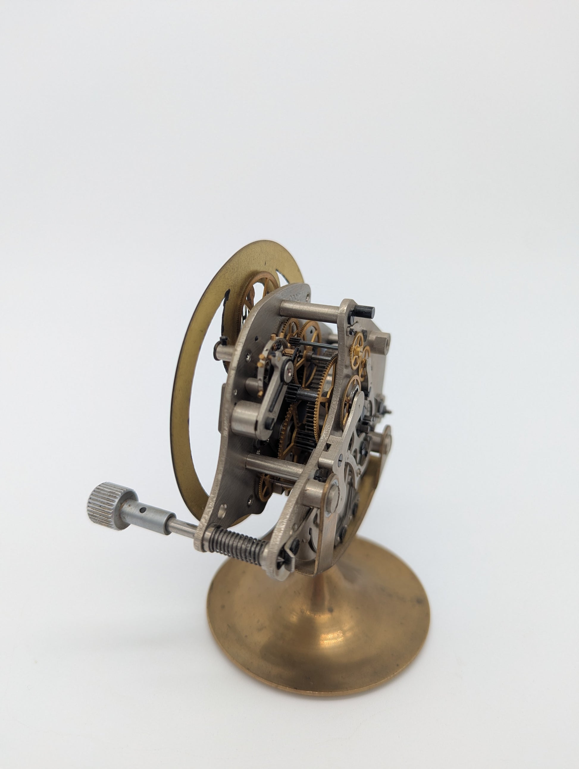 • Material: Messingfuß, Stahl- und Messingräder, schwarzes Zifferblatt