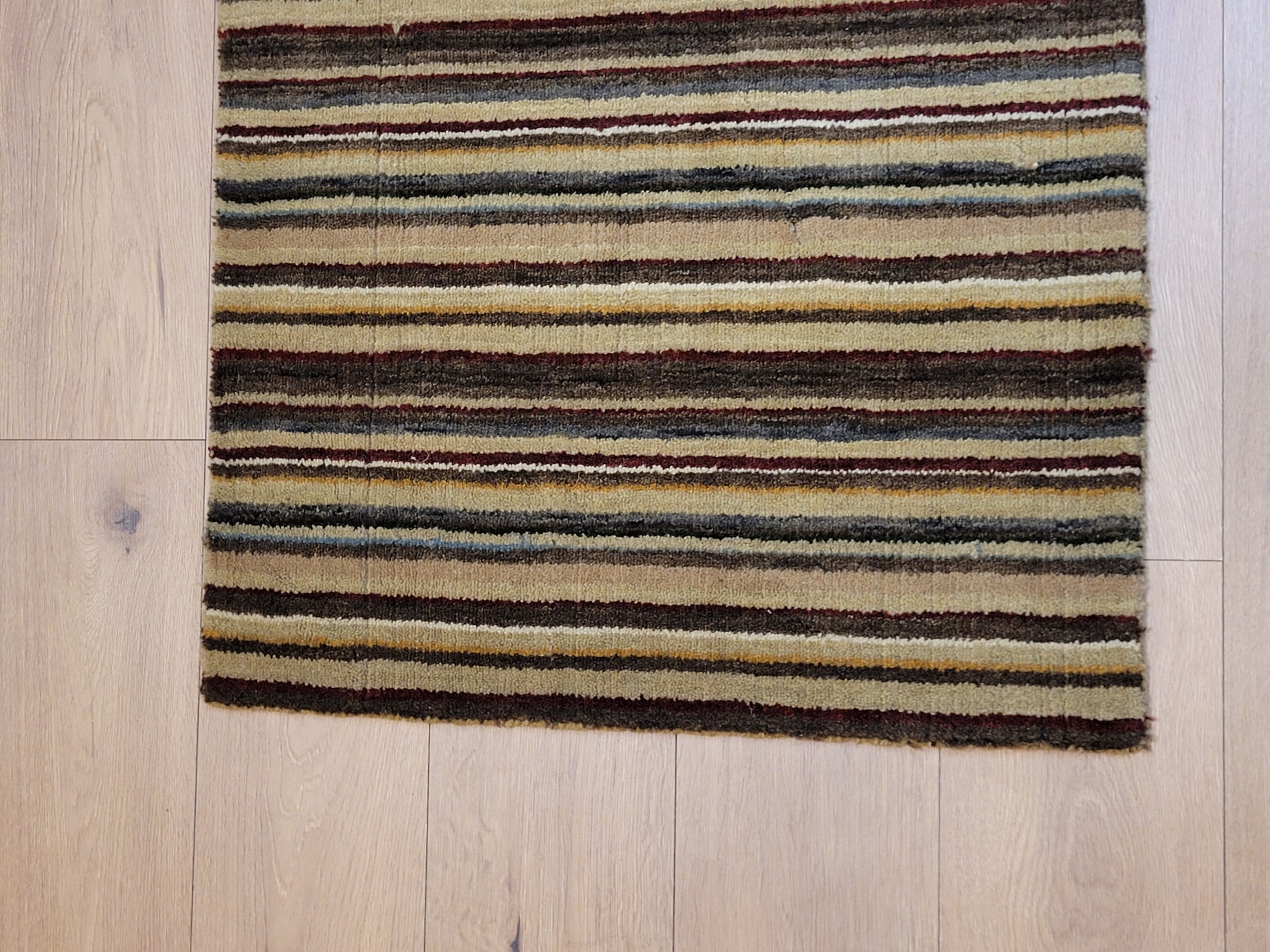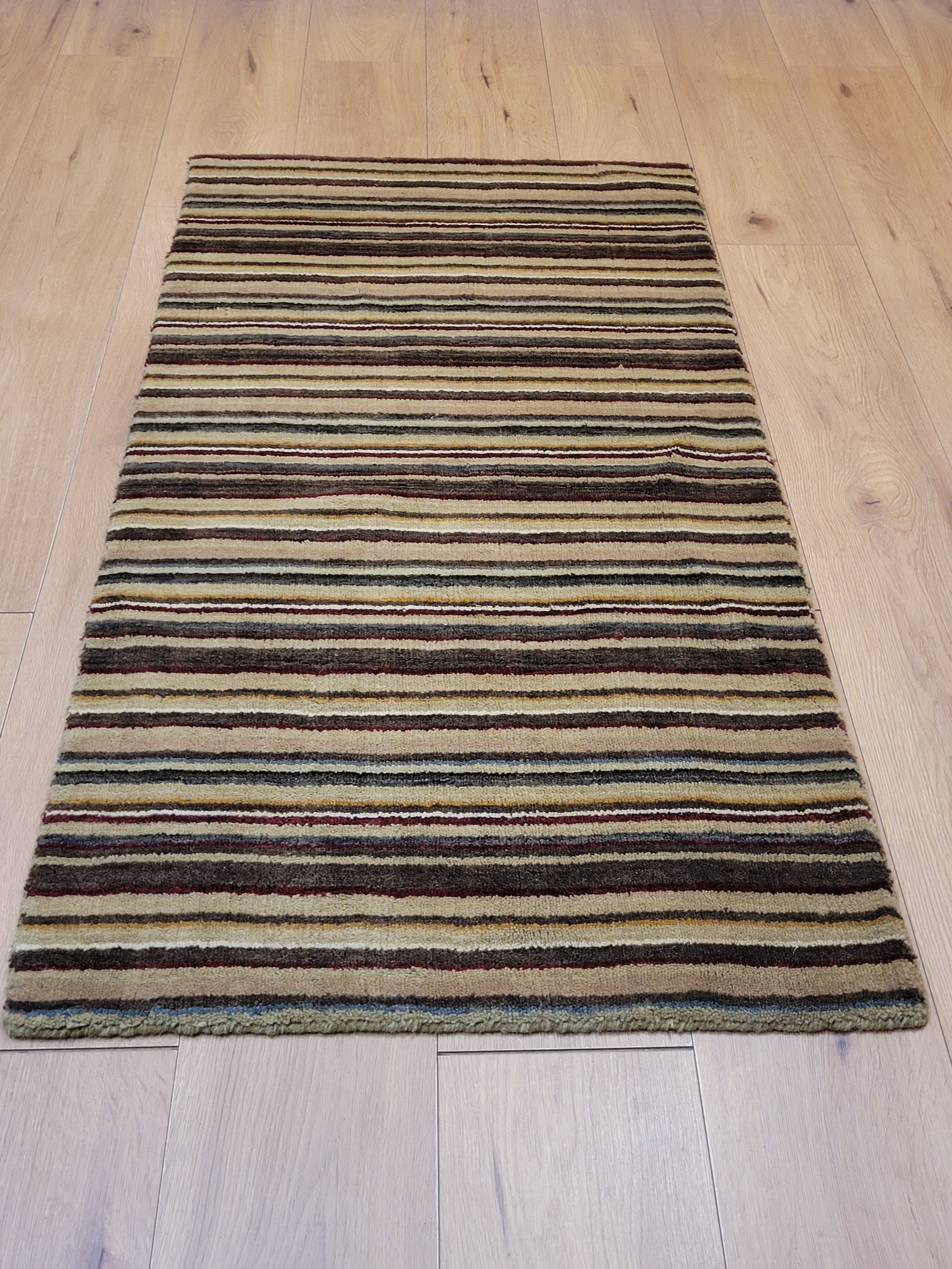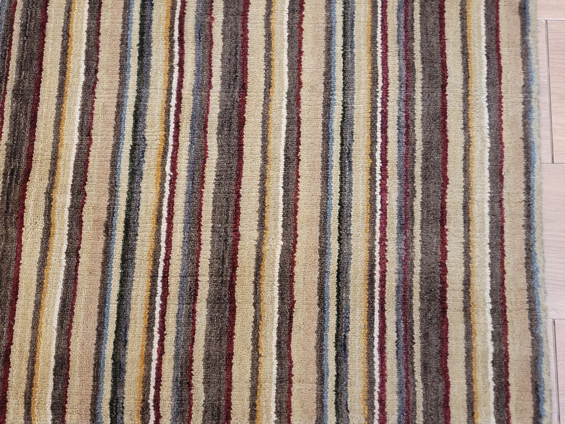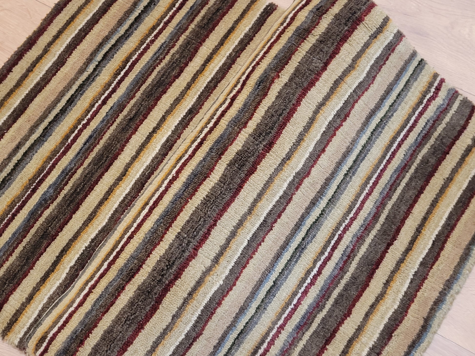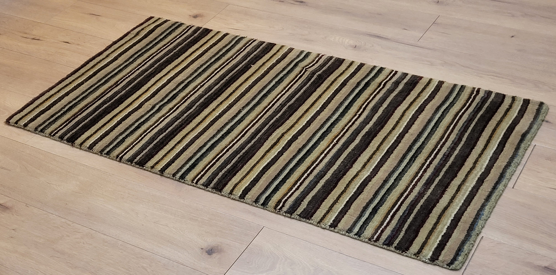 angeboten wird ein handgeknüpfter Teppich aus feiner Korkwolle in kompakter Größe. Das Design zeigt ein modernes Streifenmuster in harmonisch abgestimmten Naturtönen, das dem Teppich eine zeitlose und zugleich elegante Ausstrahlung verleiht.
