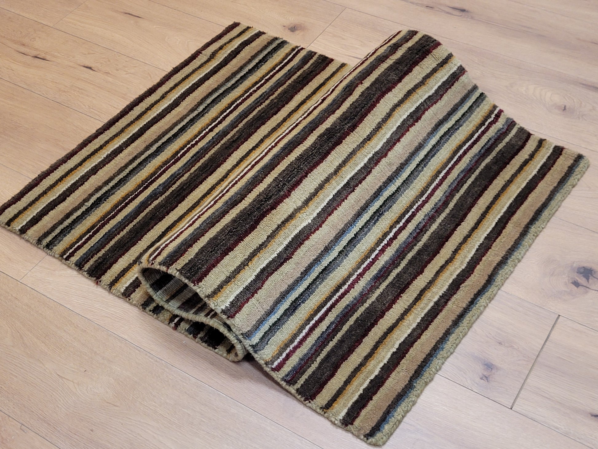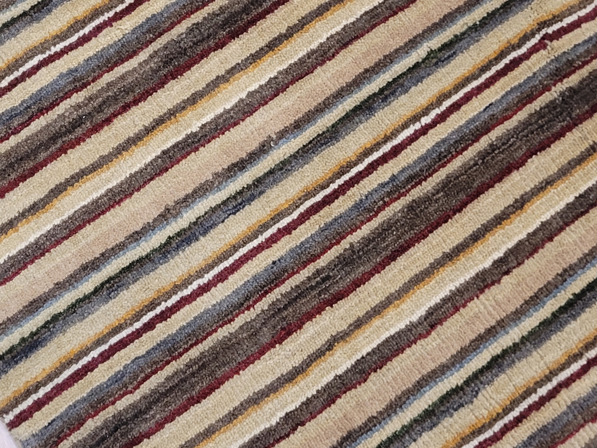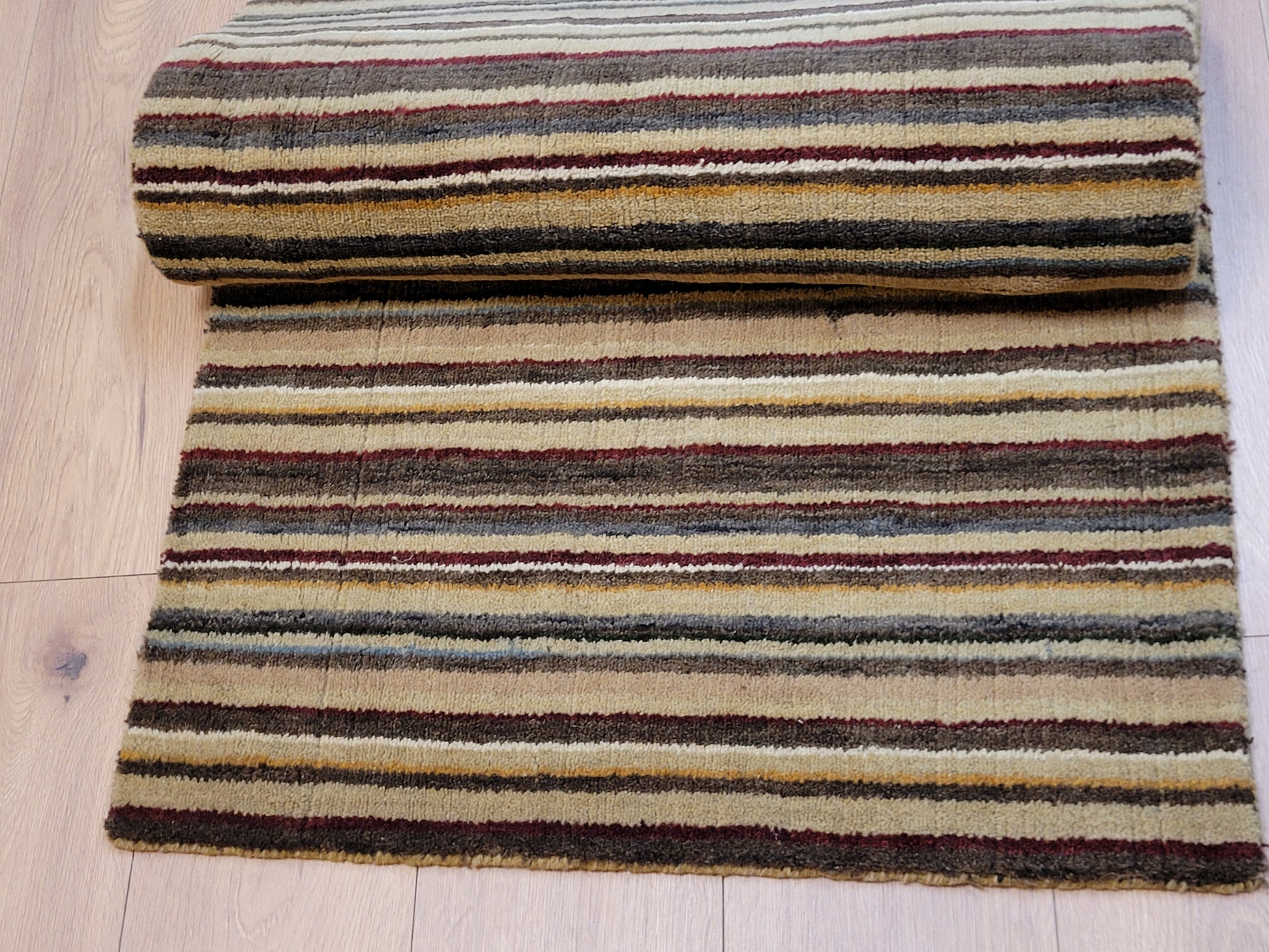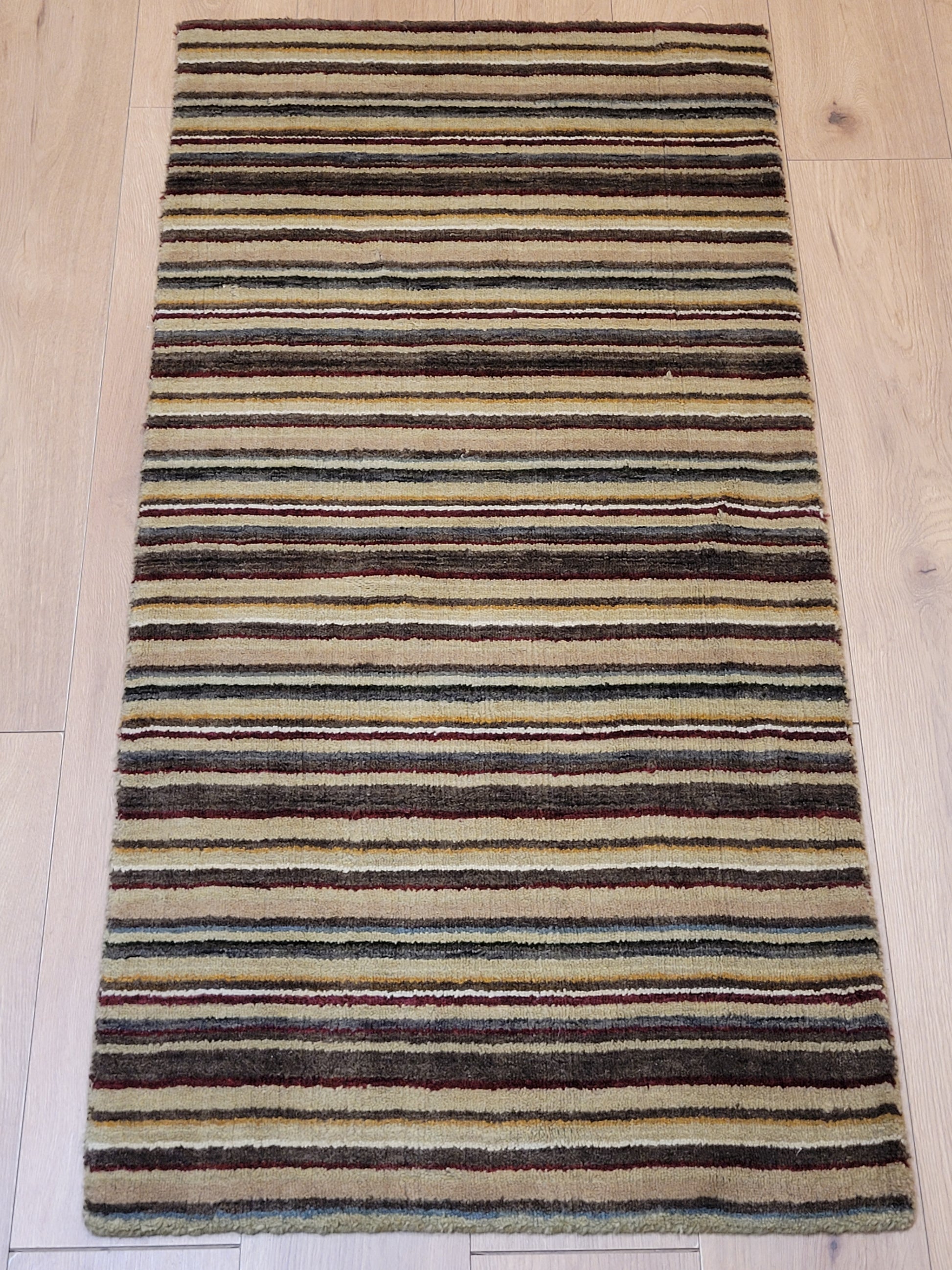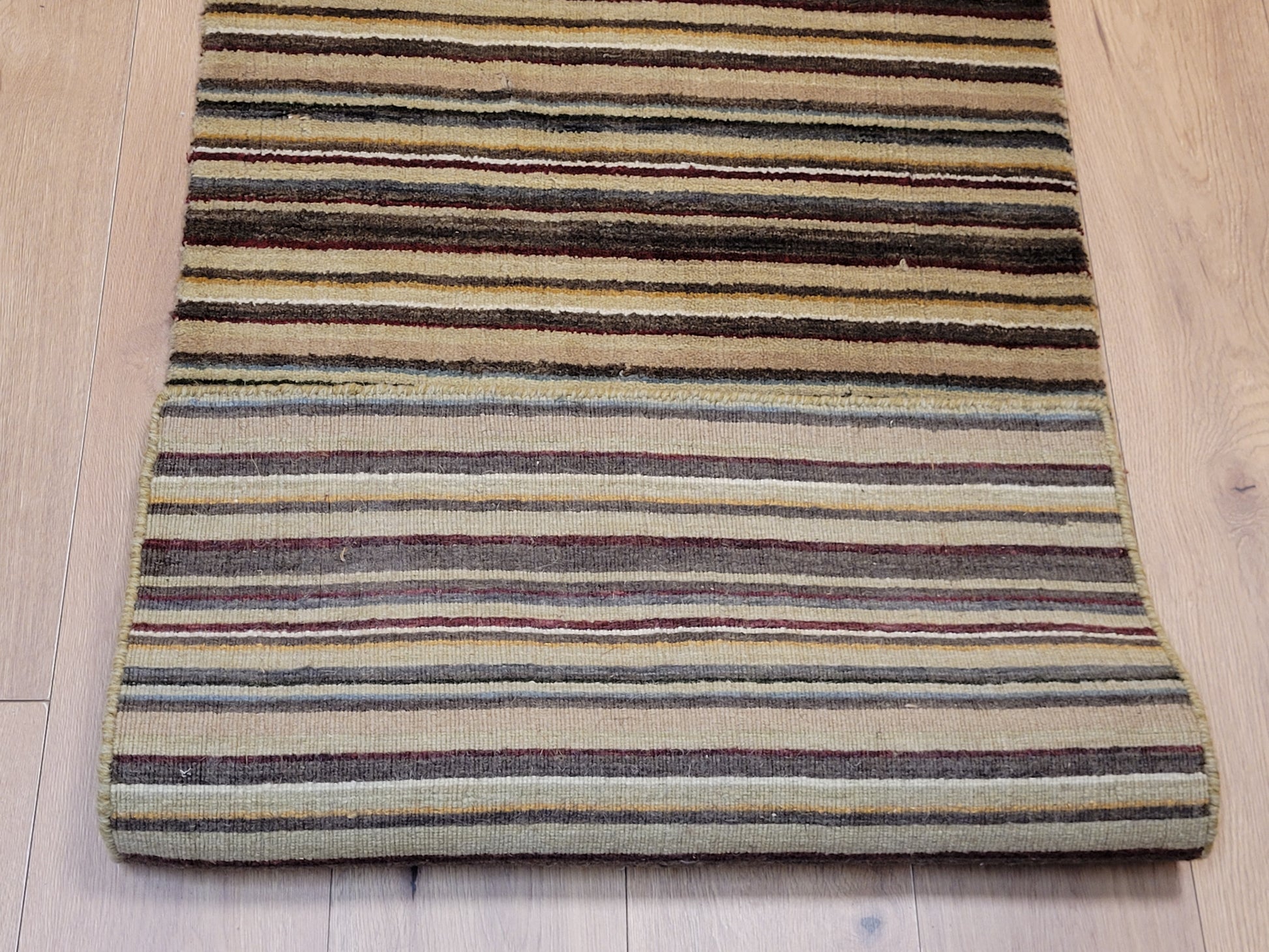 angeboten wird ein handgeknüpfter Teppich aus feiner Korkwolle in kompakter Größe. Das Design zeigt ein modernes Streifenmuster in harmonisch abgestimmten Naturtönen, das dem Teppich eine zeitlose und zugleich elegante Ausstrahlung verleiht.