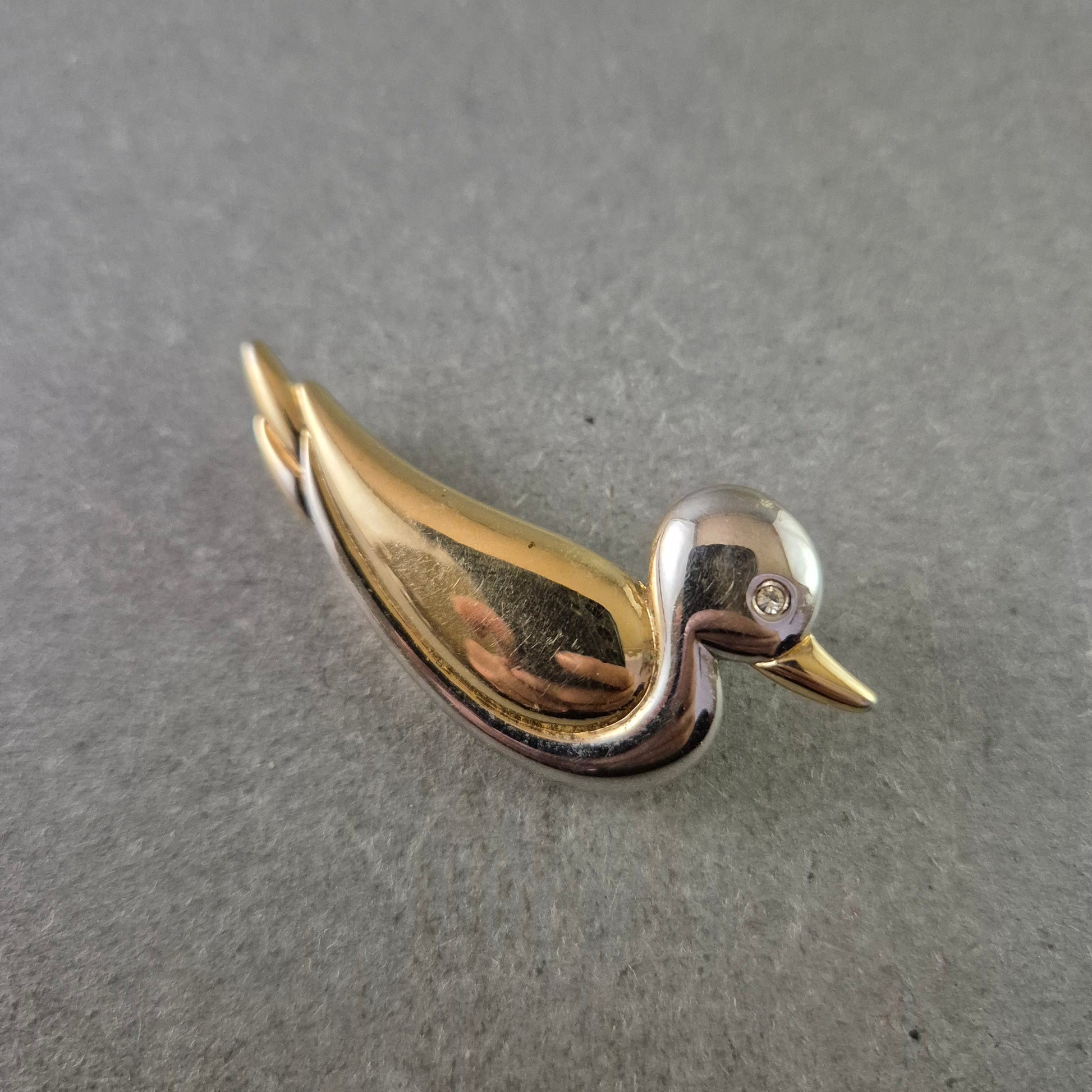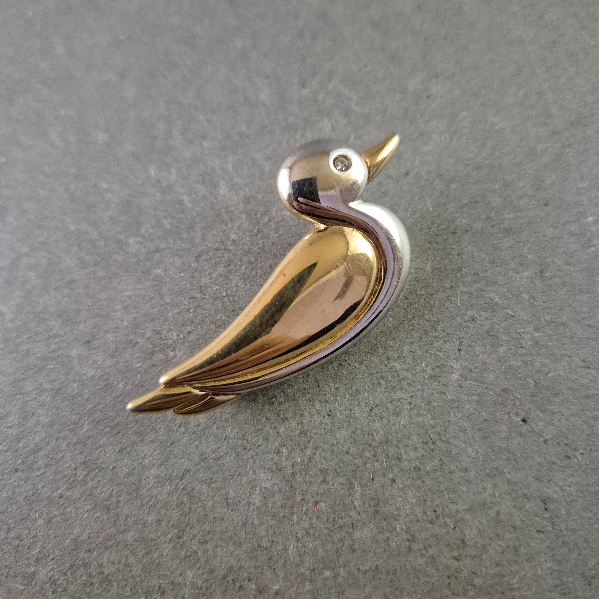 Diese elegante Brosche in Form eines Vogels kombiniert vergoldete und silberfarbene Elemente in einem fließenden Design. Der Kopf des Vogels ist mit einem kleinen Strassstein verziert, der dezent funkelt und das Schmuckstück veredelt. Eine stilvolle Brosche, die sowohl zu eleganten Outfits als auch als verspielter Akzent im Alltag getragen werden kann.