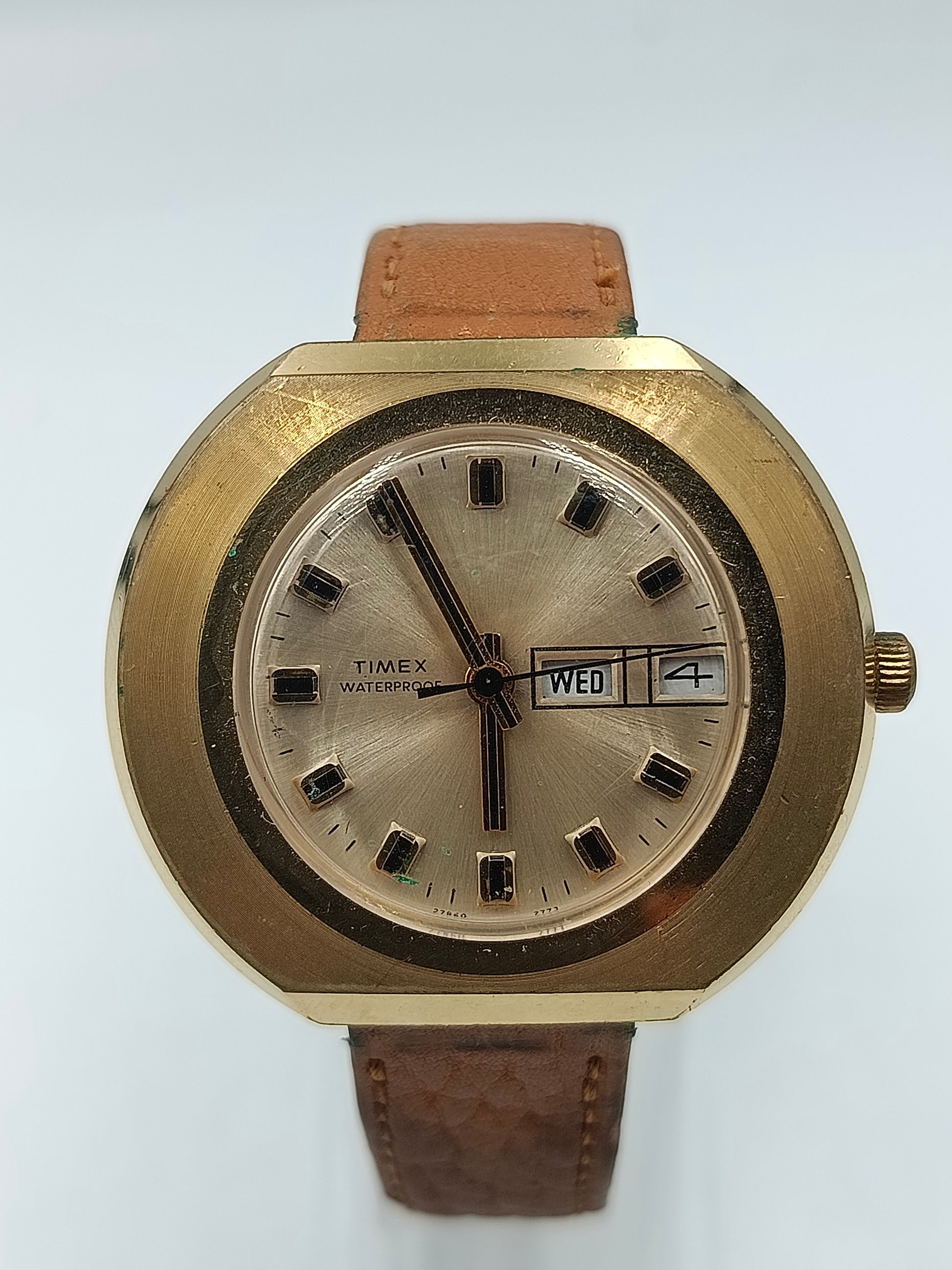 Klassische Timex Armbanduhr im Vintage Design mit goldfarbenem Gehäuse und braunem Lederarmband. Die Uhr überzeugt durch ihren zeitlosen Stil und praktische Funktionen.