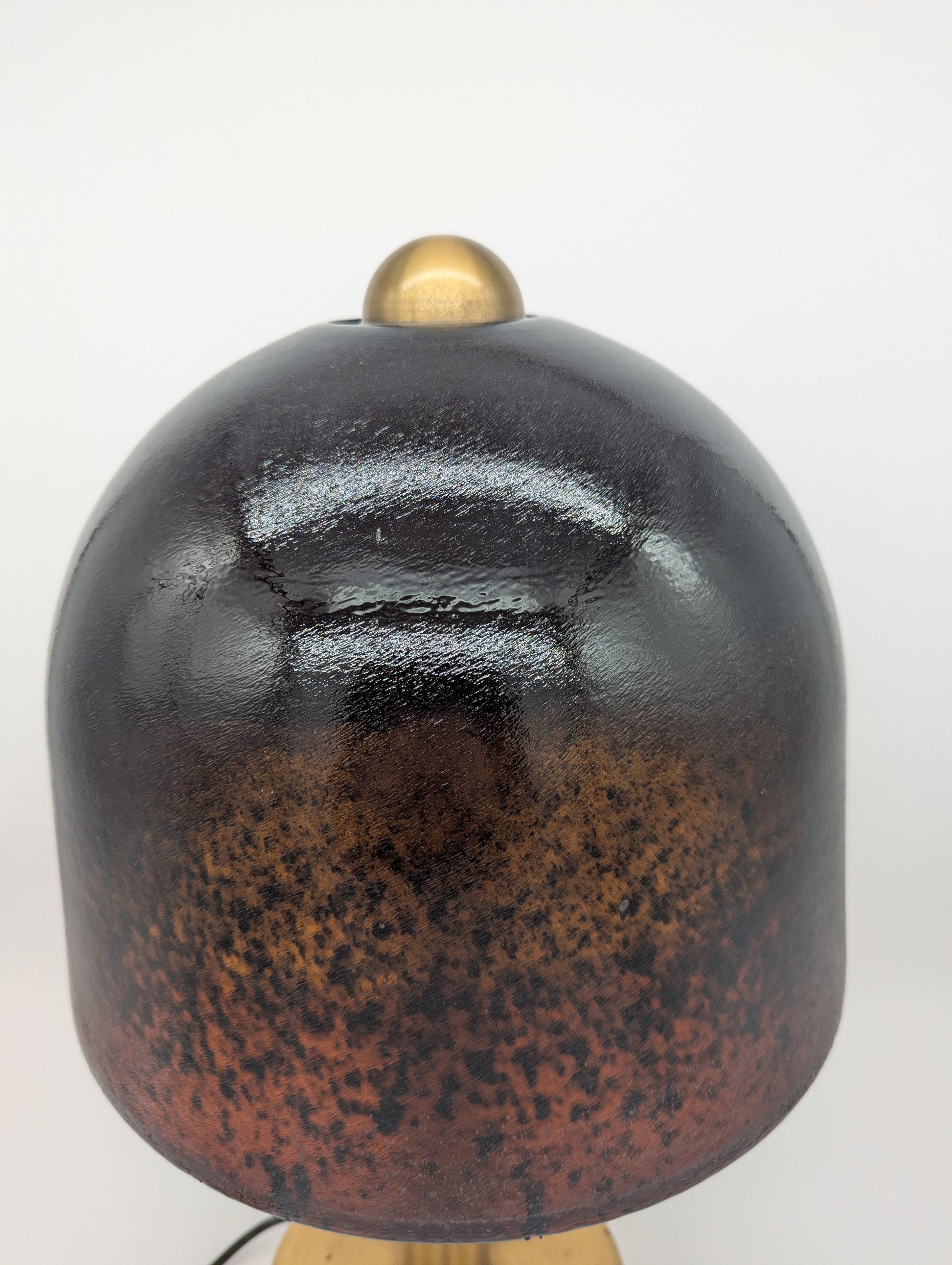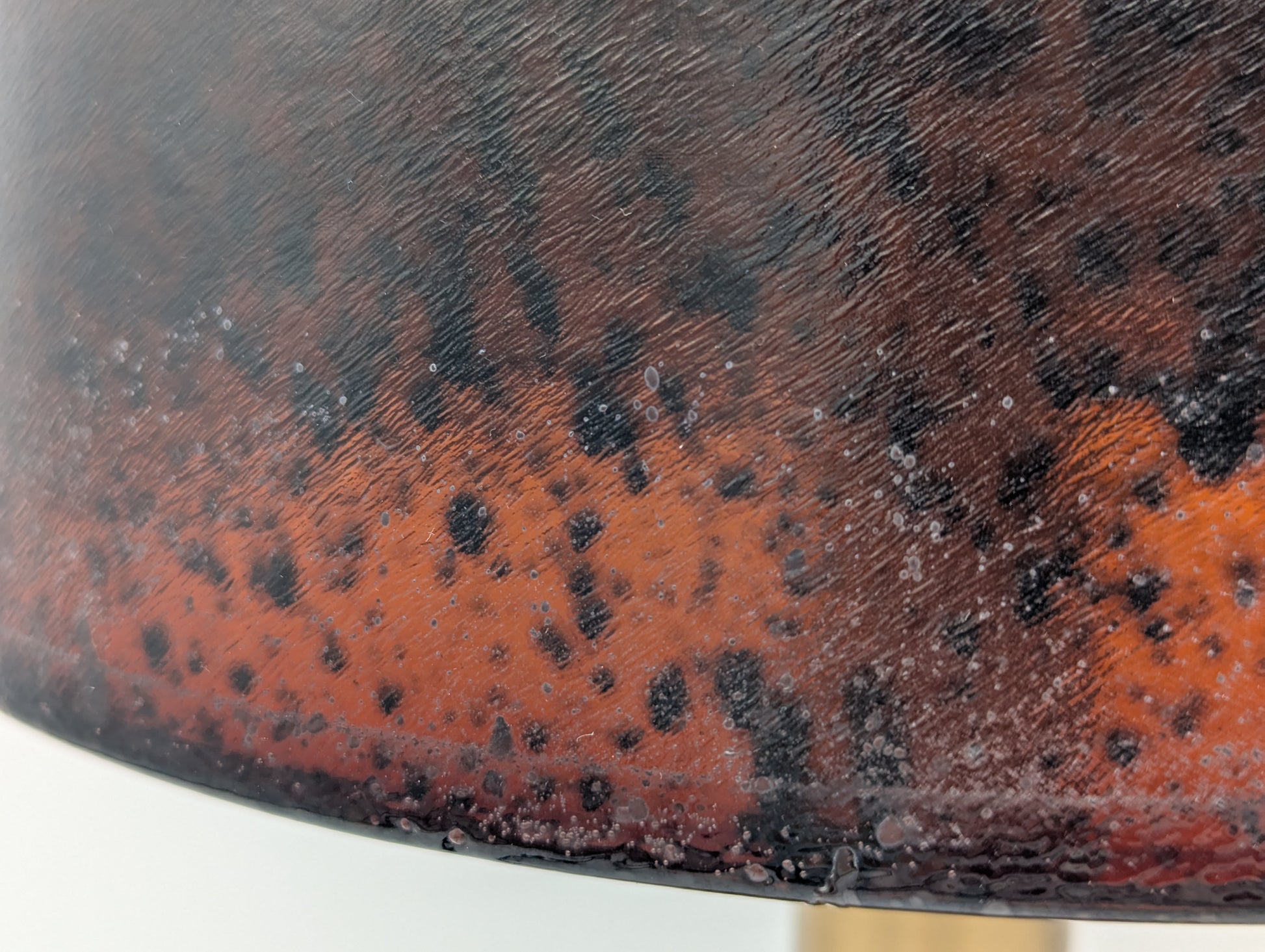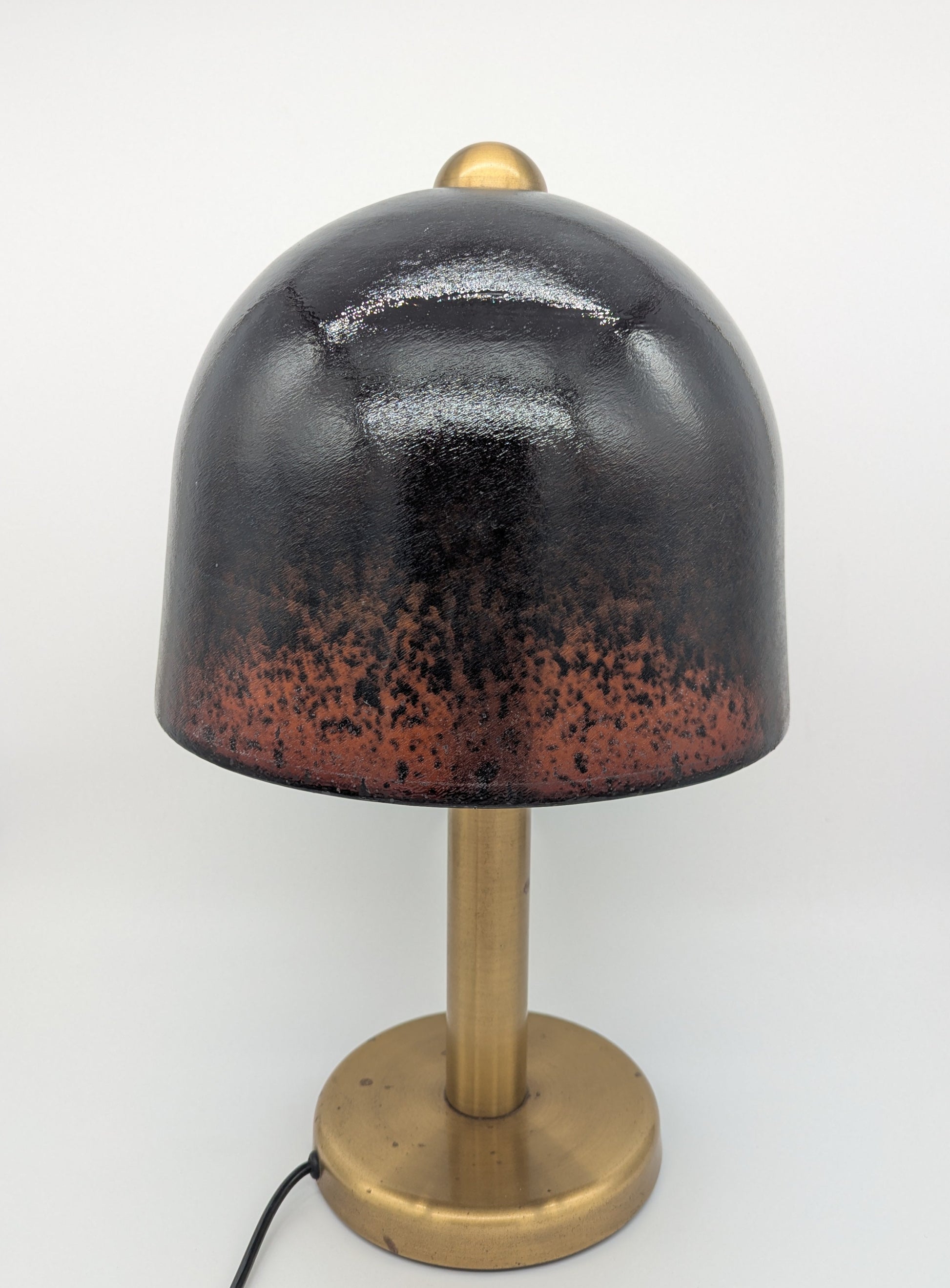 Diese originale Peill & Putzler Tischlampe besticht durch ihr ikonisches Pilz Design und die hochwertige Verarbeitung. Der große, halbkugelförmige Glasschirm zeigt einen eindrucksvollen Farbverlauf von tiefem Schwarz bis zu warmen Kupfer- und Rosttönen mit lebendiger Struktur. Der Sockel sowie die Zierkappe sind in eleganter Messingoptik gehalten und unterstreichen den exklusiven Charakter dieser Leuchte.