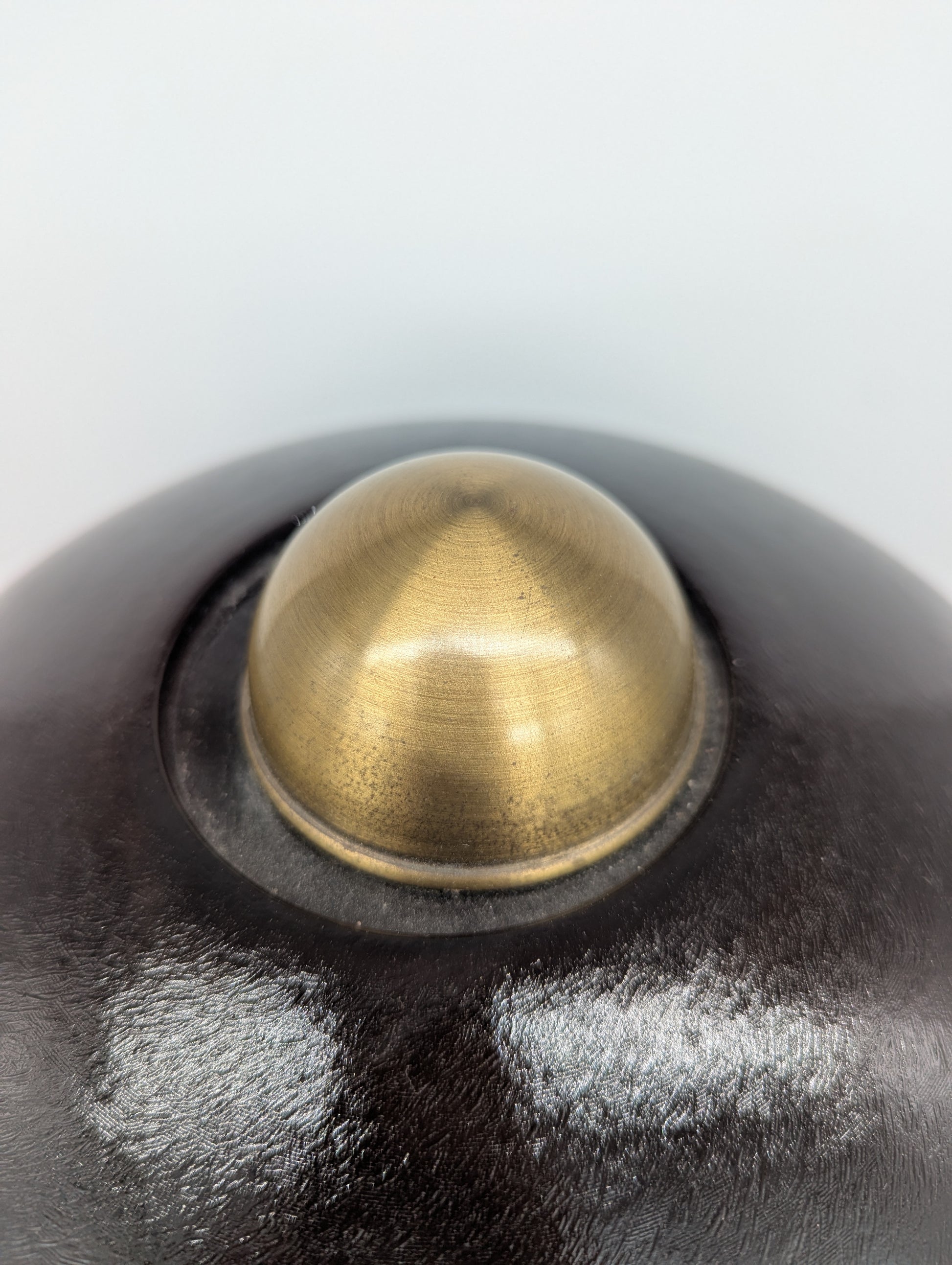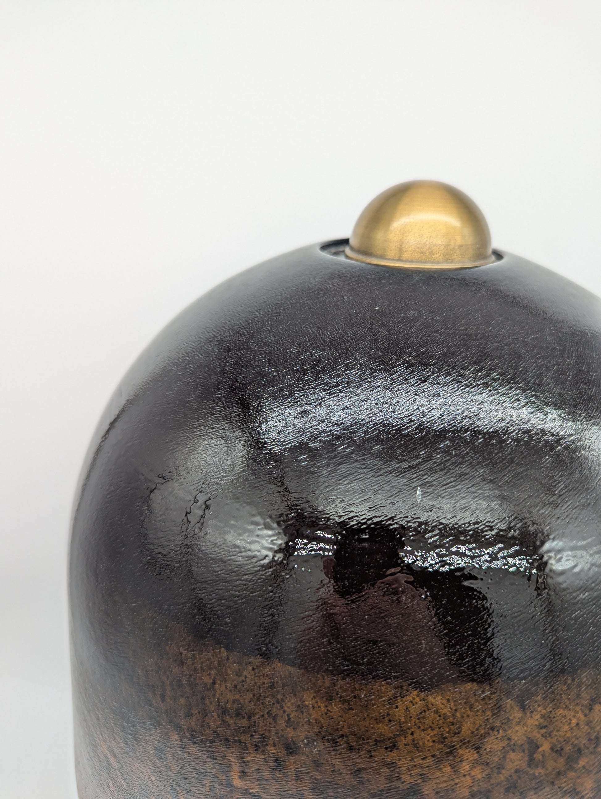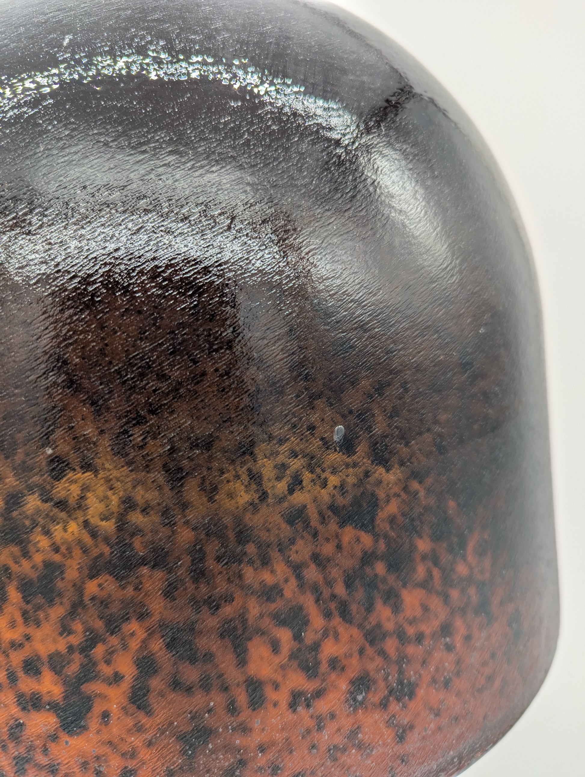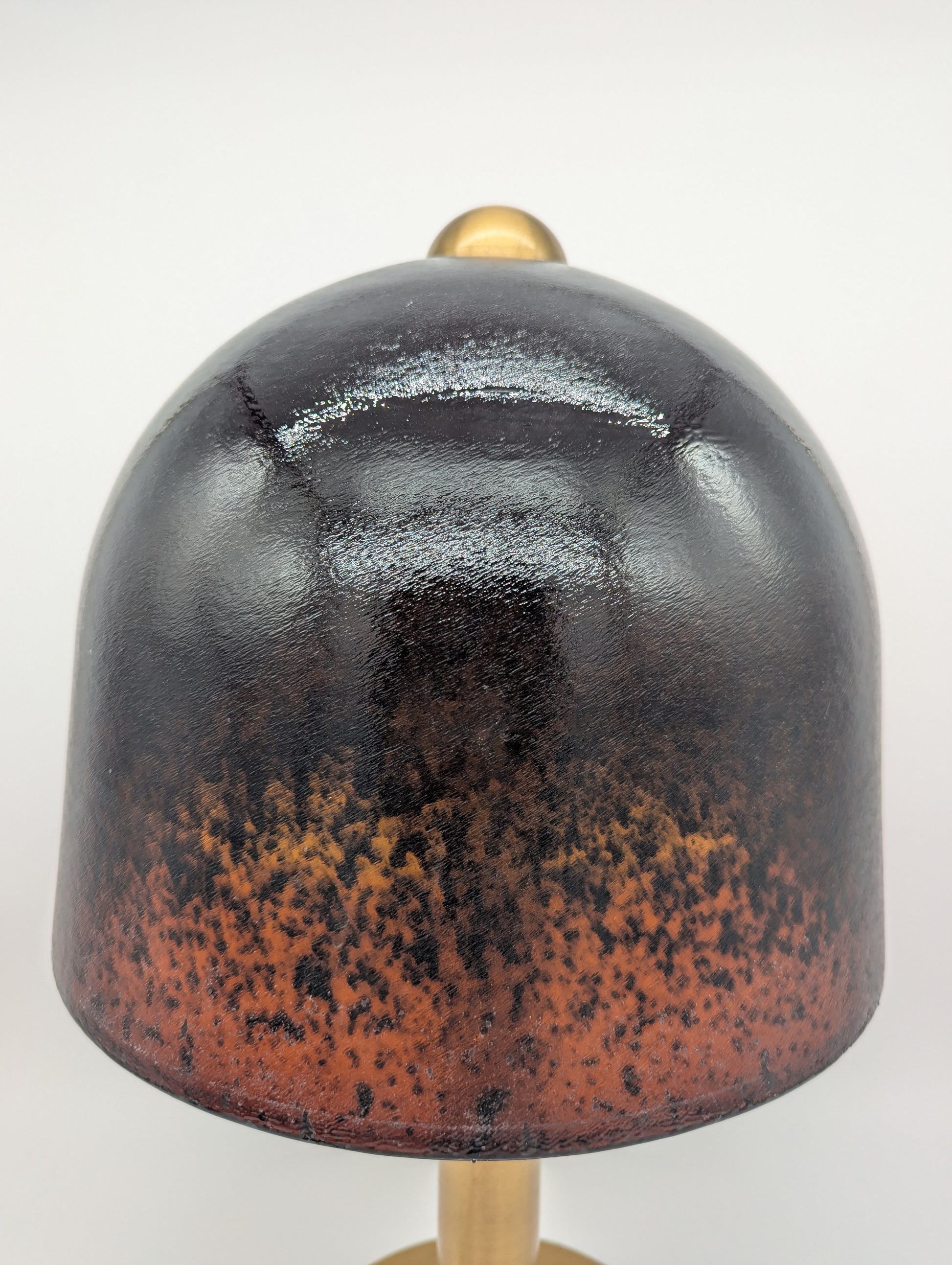 Diese originale Peill & Putzler Tischlampe besticht durch ihr ikonisches Pilz Design und die hochwertige Verarbeitung. Der große, halbkugelförmige Glasschirm zeigt einen eindrucksvollen Farbverlauf von tiefem Schwarz bis zu warmen Kupfer- und Rosttönen mit lebendiger Struktur. Der Sockel sowie die Zierkappe sind in eleganter Messingoptik gehalten und unterstreichen den exklusiven Charakter dieser Leuchte.