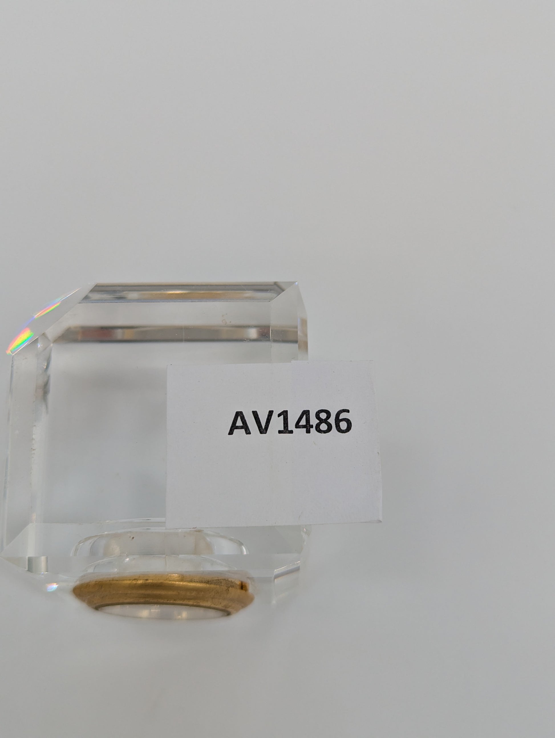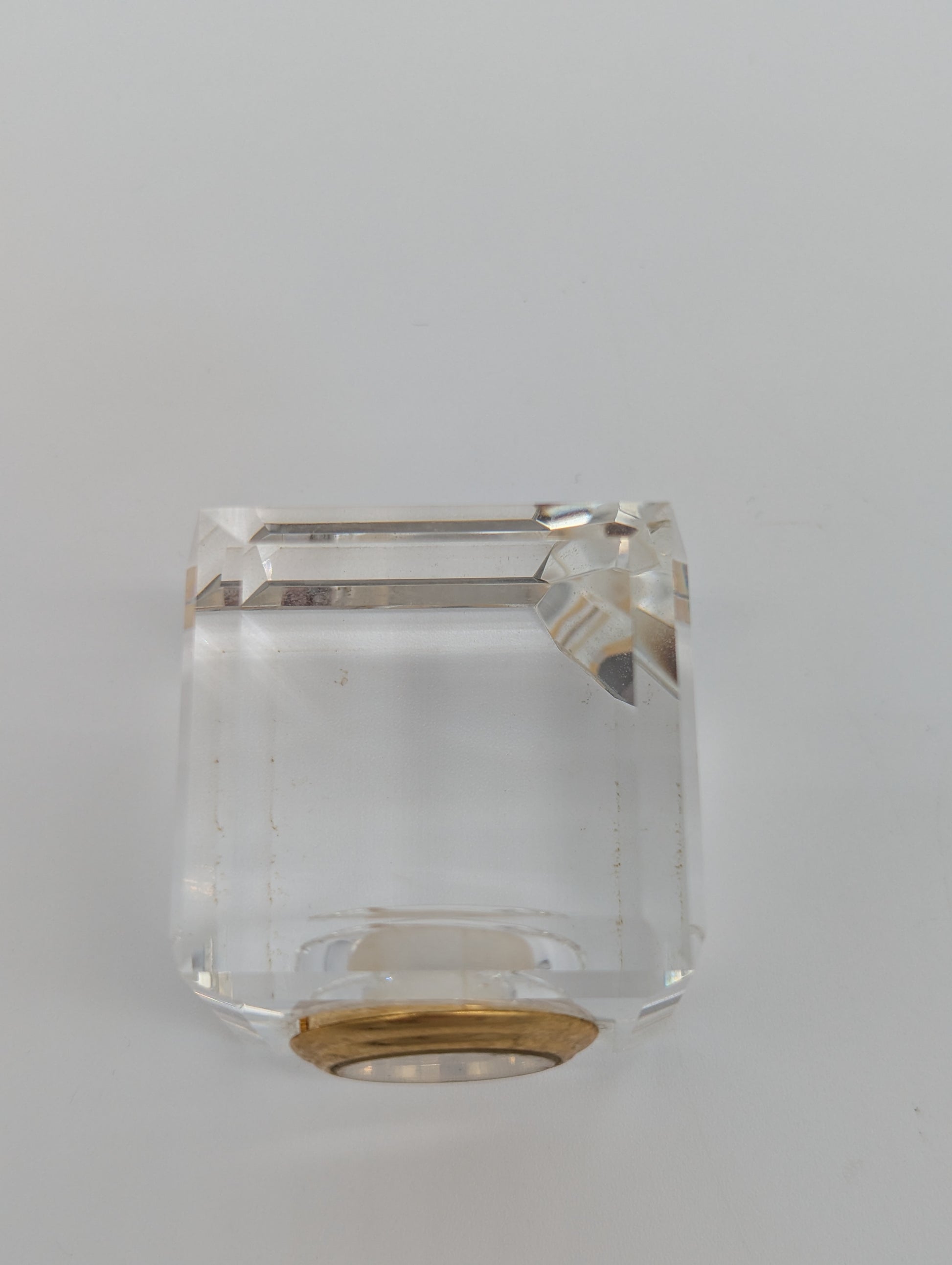 Angeboten wird eine elegante, kleine Tischuhr im modernen, kompakten Design. Die Uhr ist in einem klaren Acrylglaswürfel eingefasst und besitzt ein rundes, goldfarbenes Metallzifferblatt mit dezenten Stundenpunkten und feinen Zeigern.