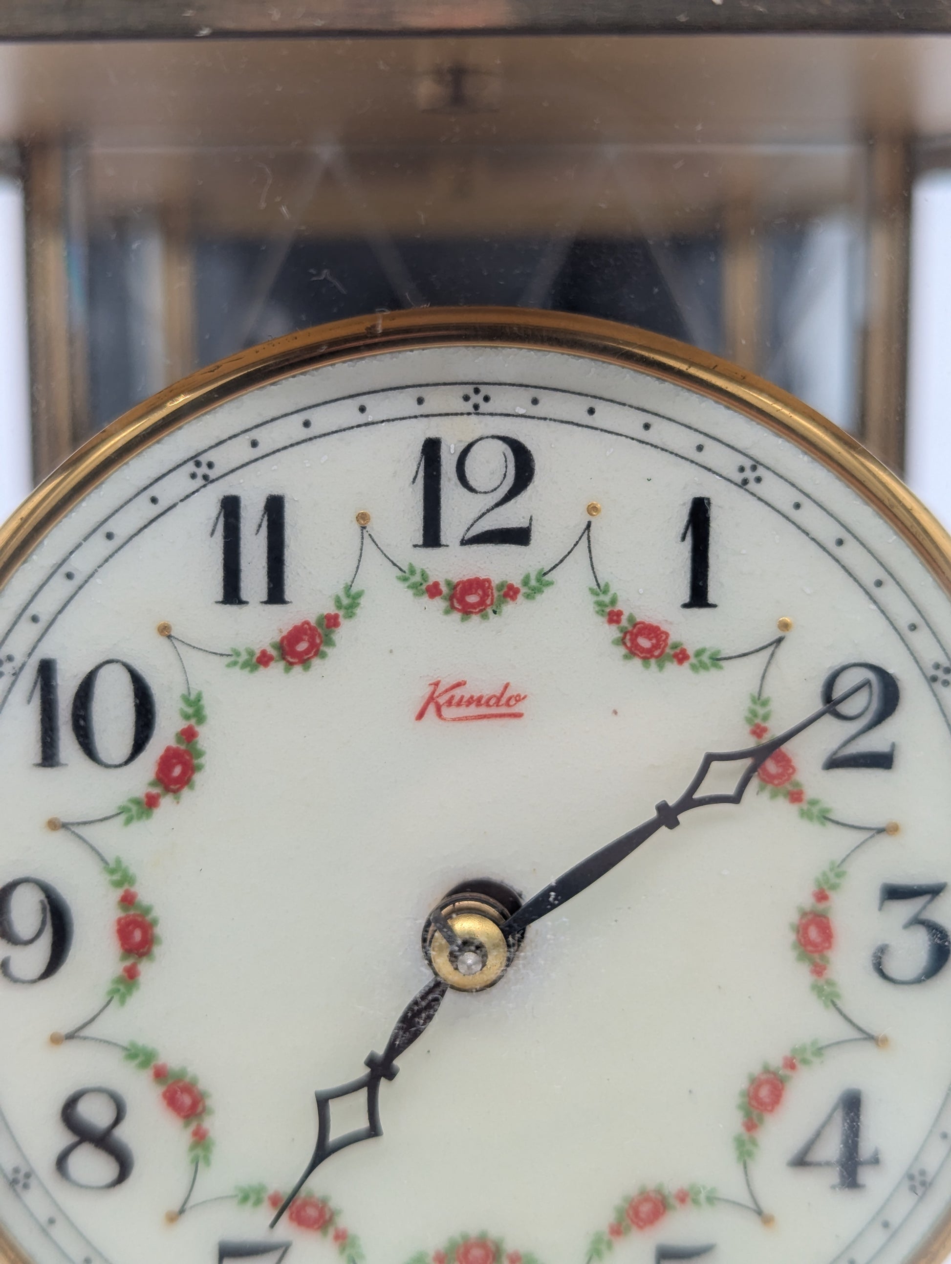 Diese elegante Tischuhr der Marke Kundo (Kieninger & Obergfell) präsentiert sich in einem klassischen Design mit dekorativem Drehpendel. Das Zifferblatt ist mit floralen Ornamenten verziert und von einem achteckigen Glasgehäuse mit floralen Schliffmotiven umgeben. Gekrönt wird die Uhr von einem goldfarbenen Zierelement, das den edlen Charakter der Uhr zusätzlich betont.