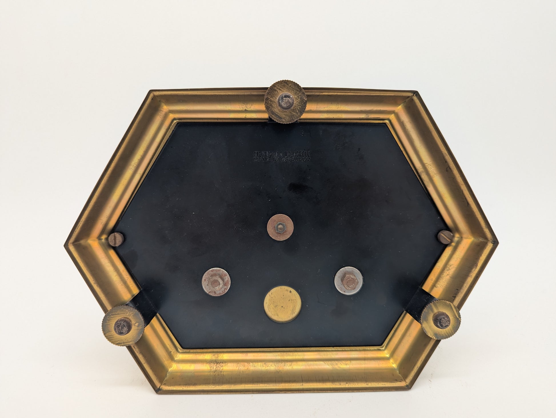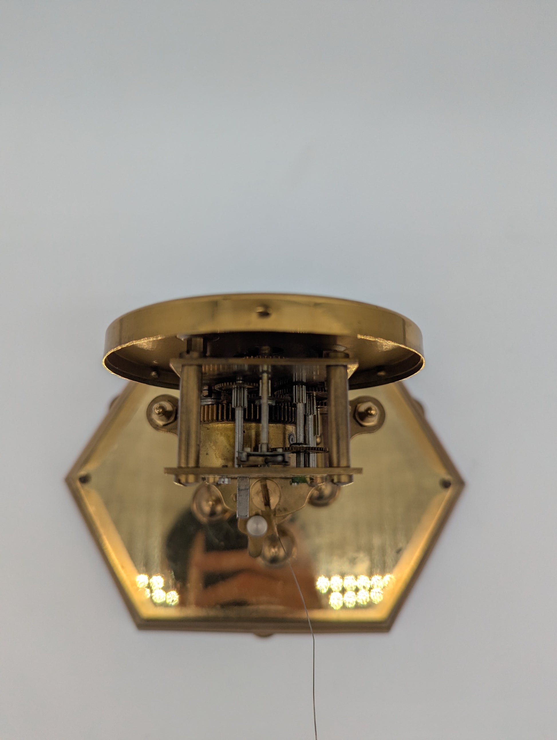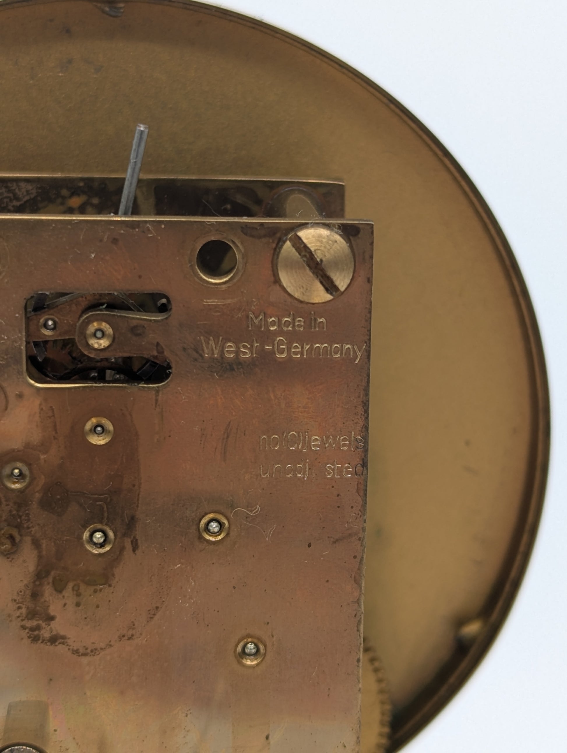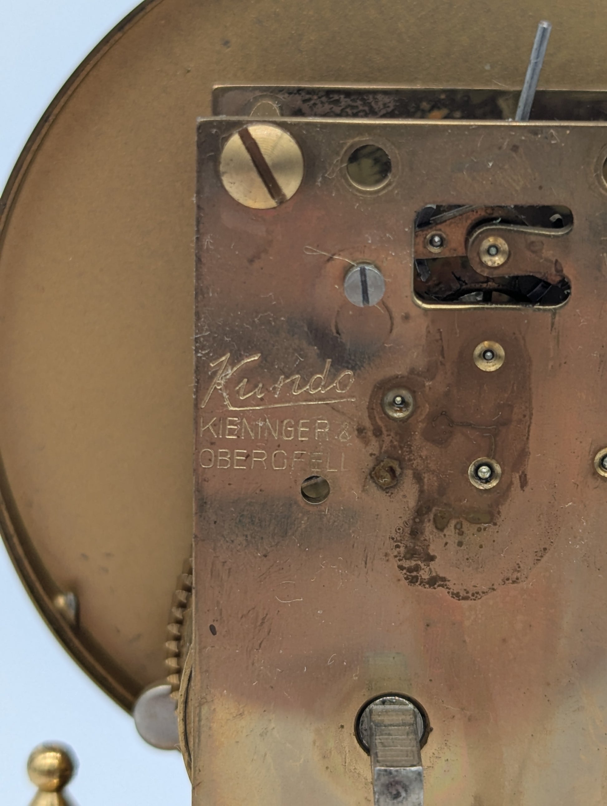 Unter dem Zifferblatt arbeitet ein mechanisches Uhrwerk mit feiner Gangregulierung. Auf der Rückseite ist das Werk signiert mit Kieninger & Obergfell – Made in West-Germany – 0 Jewels unadjusted. Das Uhrwerk wird von einem klassischen Drehpendel angetrieben, das sich im unteren Bereich der Uhr bewegt und durch den abnehmbaren Glasdom geschützt wird.