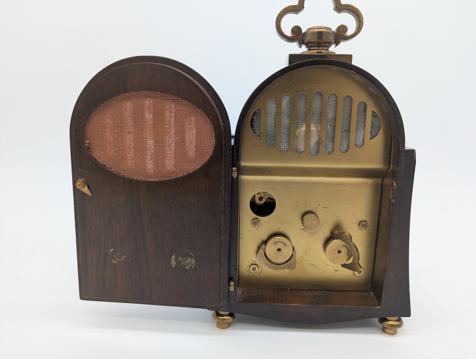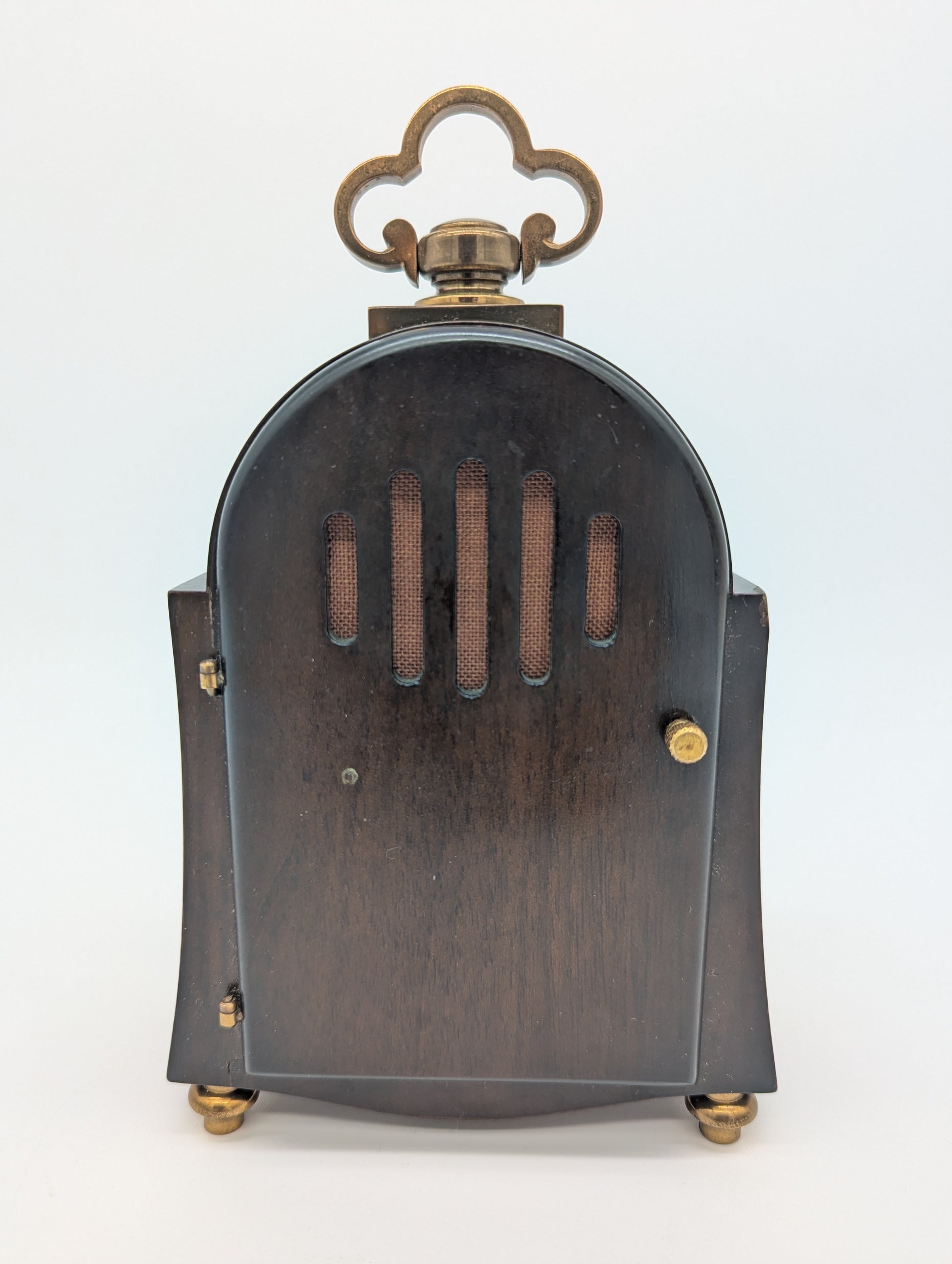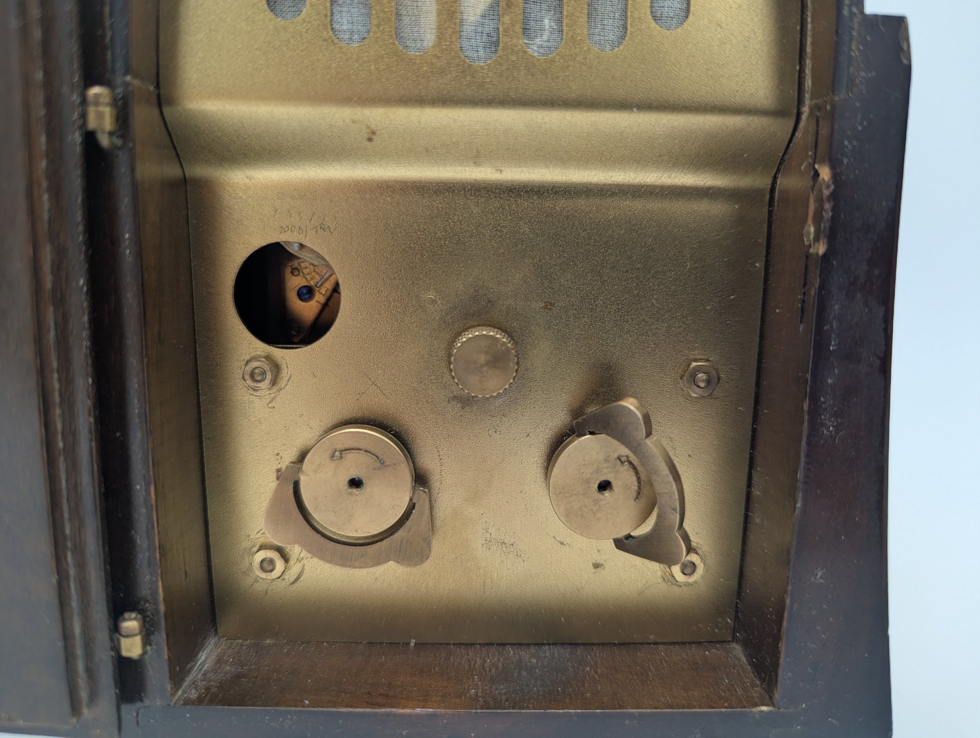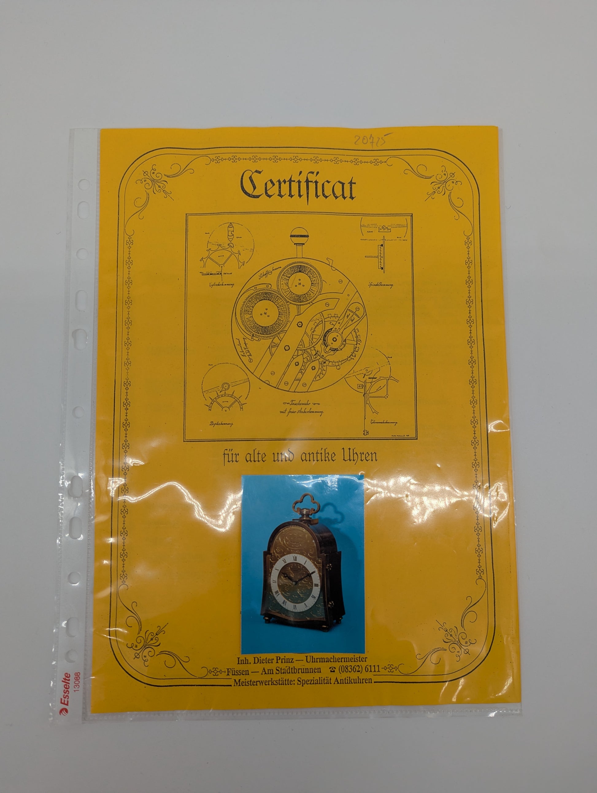 Die Tischuhr ist mit einem mechanischen Handaufzugswerk ausgestattet. Auf der Rückseite befindet sich die originale Abdeckung mit Schlitzen sowie die Aufzugsschlüssel. Ein Restaurationszertifikat aus dem Jahr 2006 liegt bei, was die Werthaltigkeit dieses Stücks zusätzlich unterstreicht.