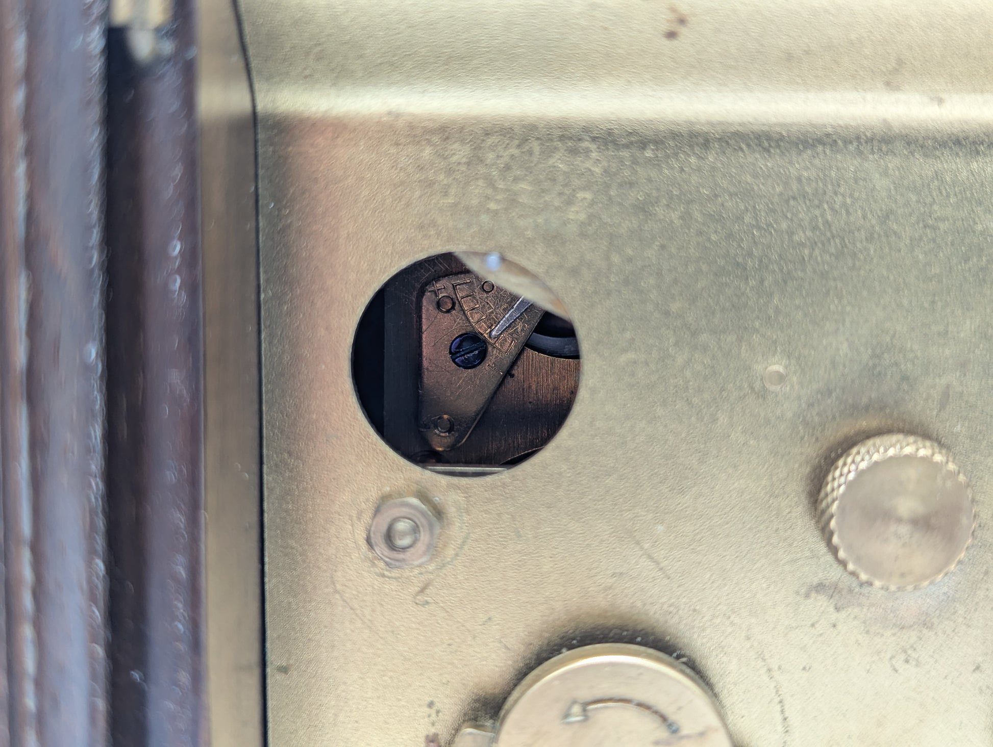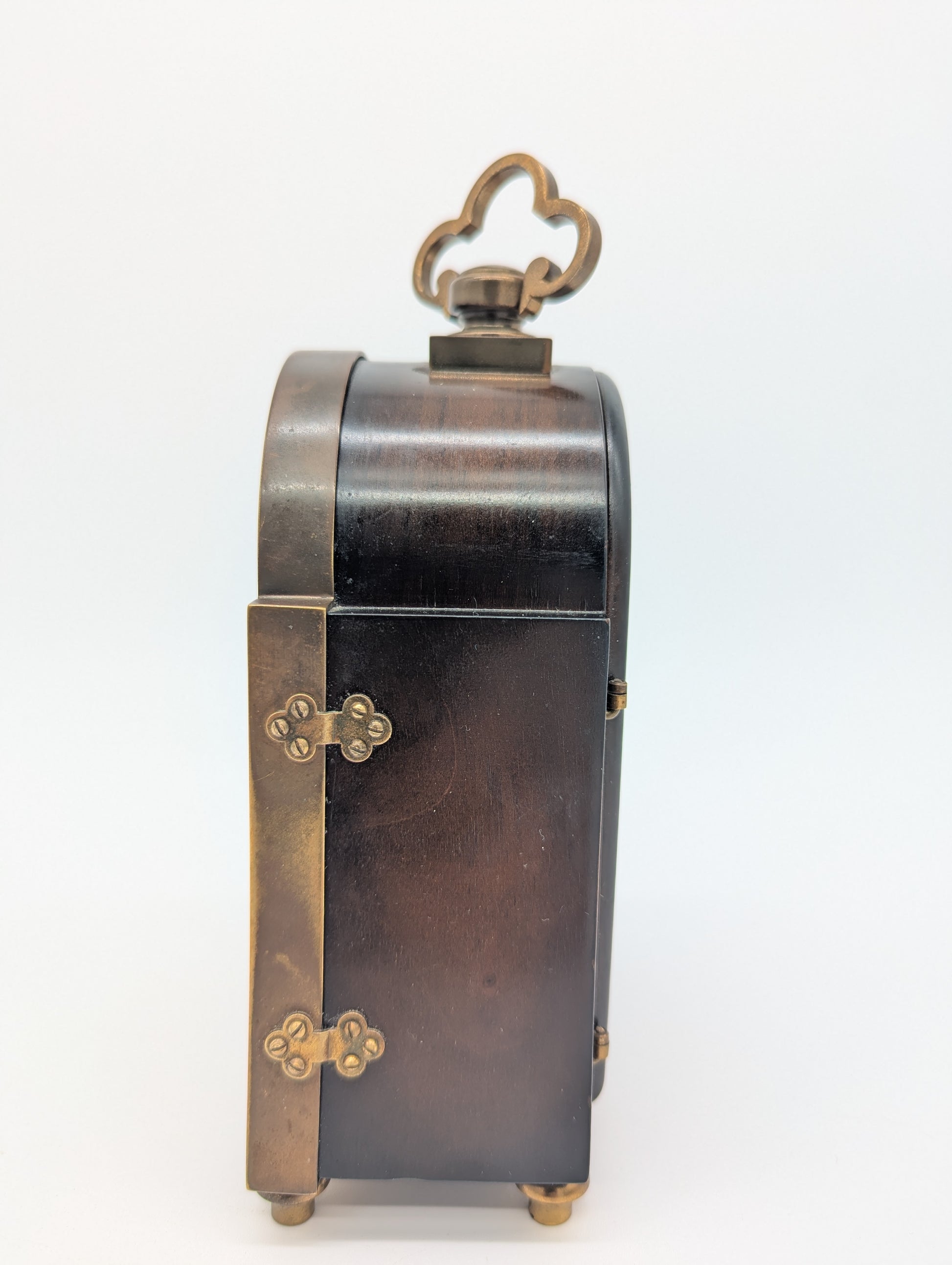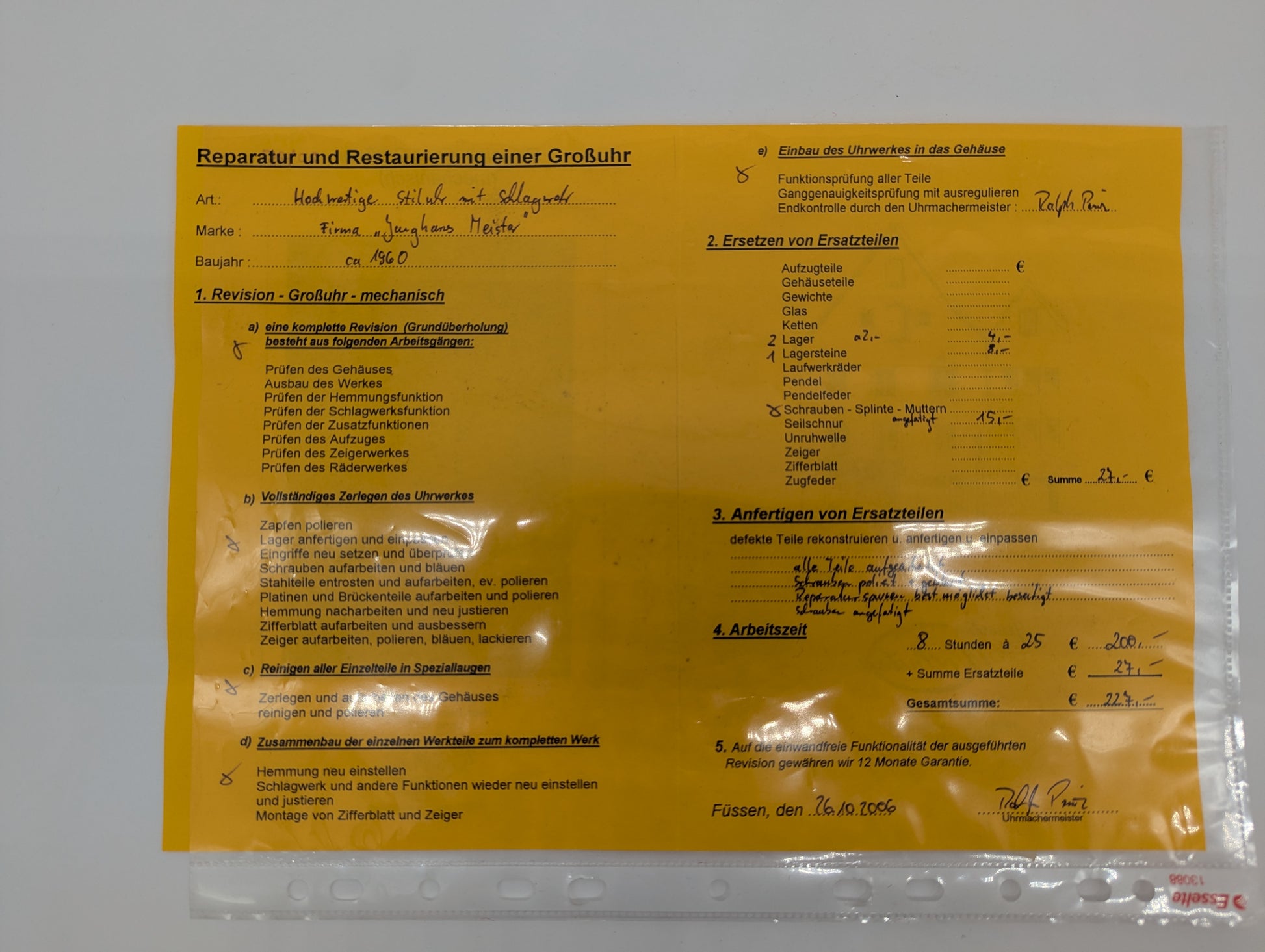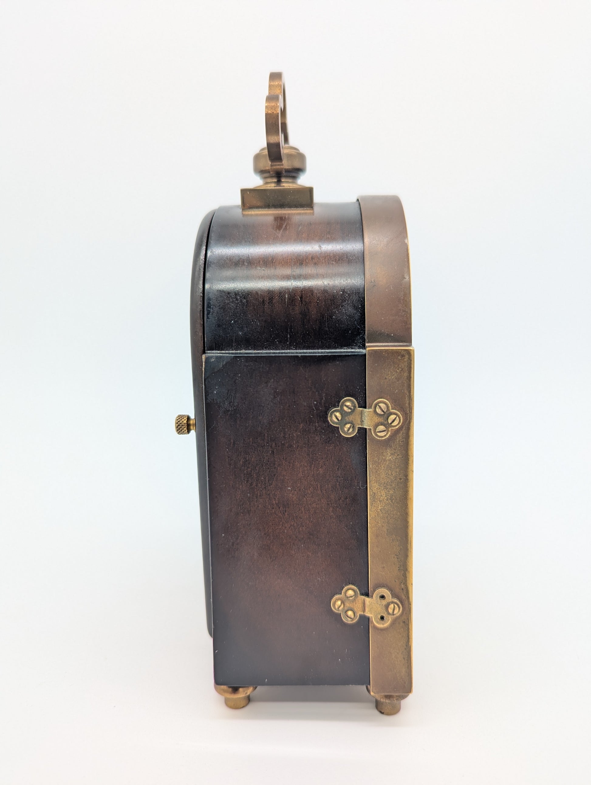 Die Tischuhr ist mit einem mechanischen Handaufzugswerk ausgestattet. Auf der Rückseite befindet sich die originale Abdeckung mit Schlitzen sowie die Aufzugsschlüssel. Ein Restaurationszertifikat aus dem Jahr 2006 liegt bei, was die Werthaltigkeit dieses Stücks zusätzlich unterstreicht.