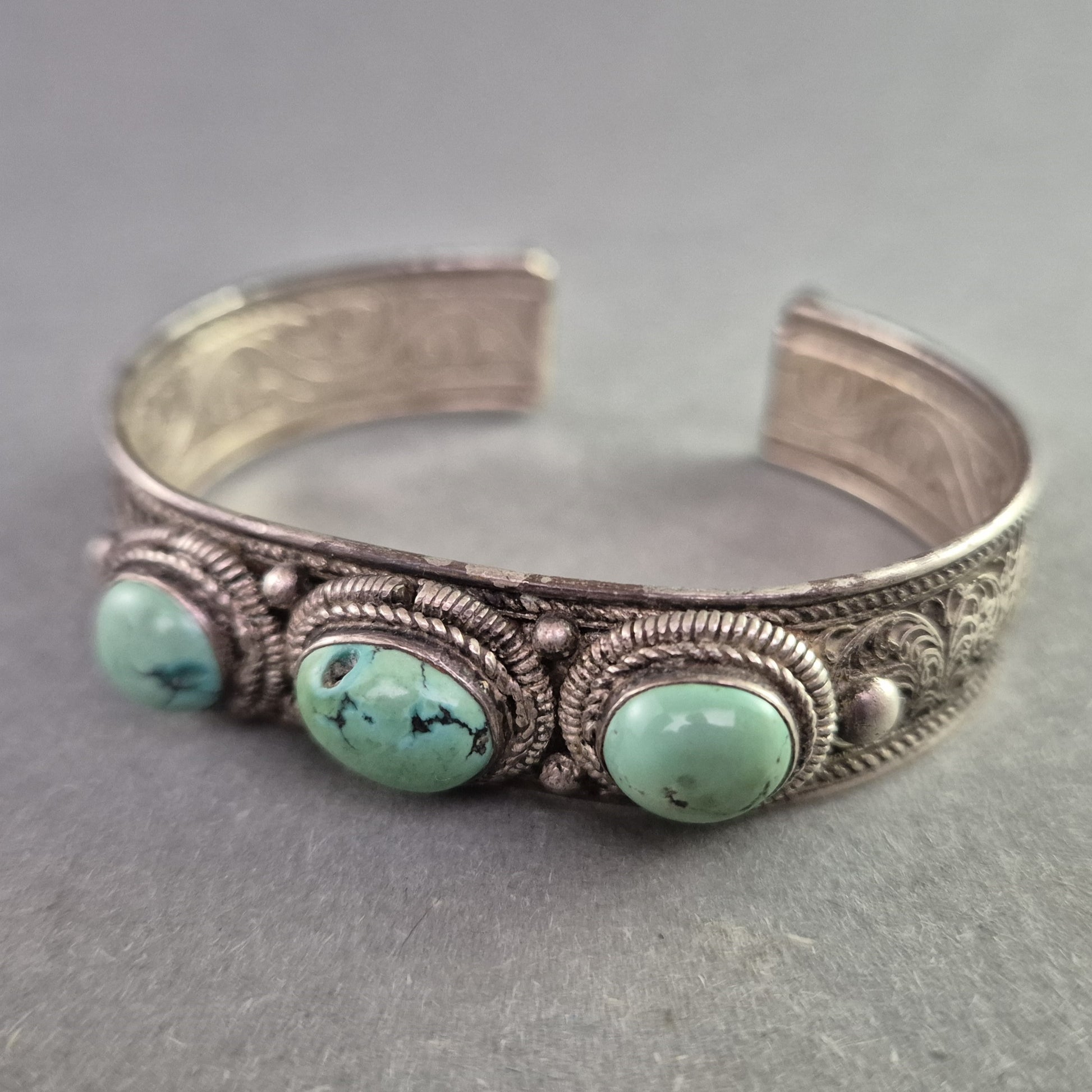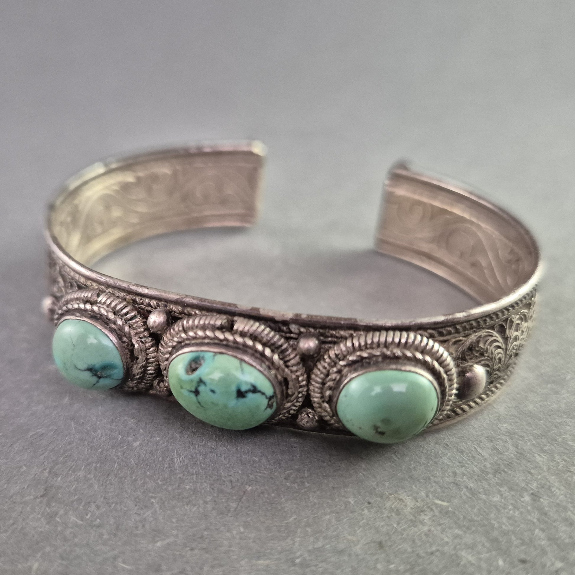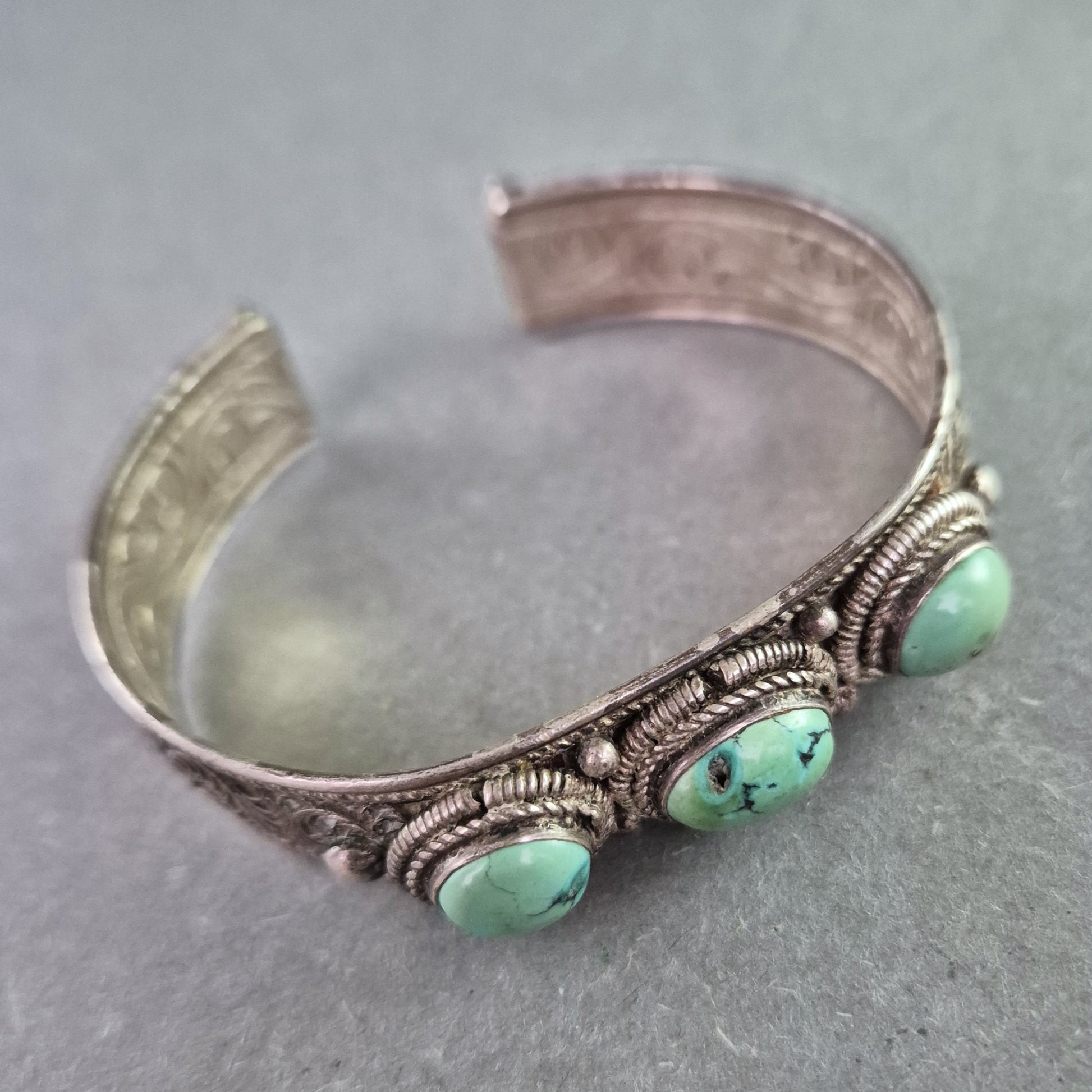 Dieser massiv gearbeitete Vintage-Armreif im offenen Design besticht durch seine ethnisch inspirierte Ornamentik und die aufwendig gravierte Oberfläche. Drei türkisfarbene Steine (vermutlich Türkis oder Imitation) zieren die Vorderseite des Reifs, eingefasst in kunstvolle Seilrahmungen. Das schwere Gewicht und die hochwertige Verarbeitung machen diesen Armschmuck zu einem auffälligen Statement-Piece.