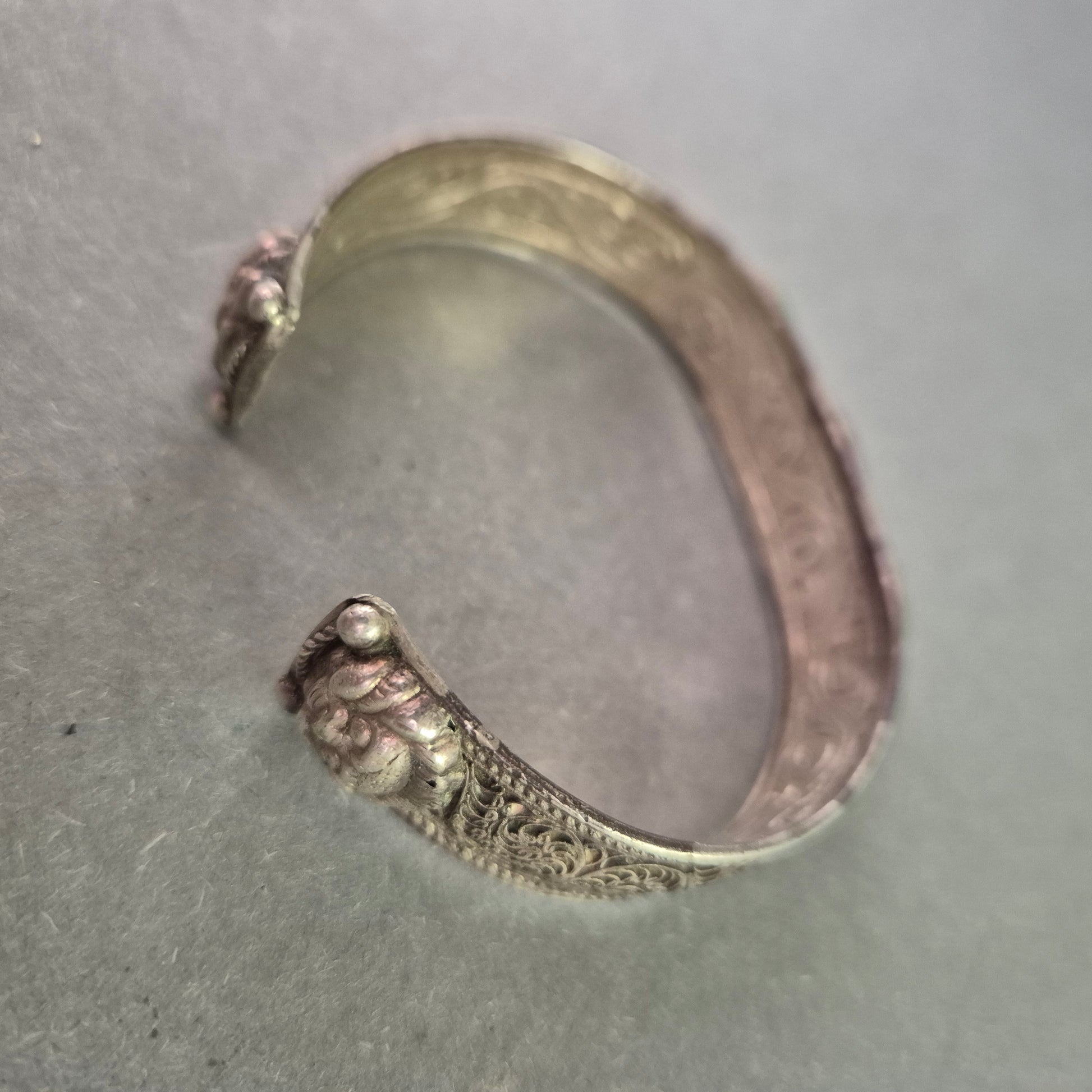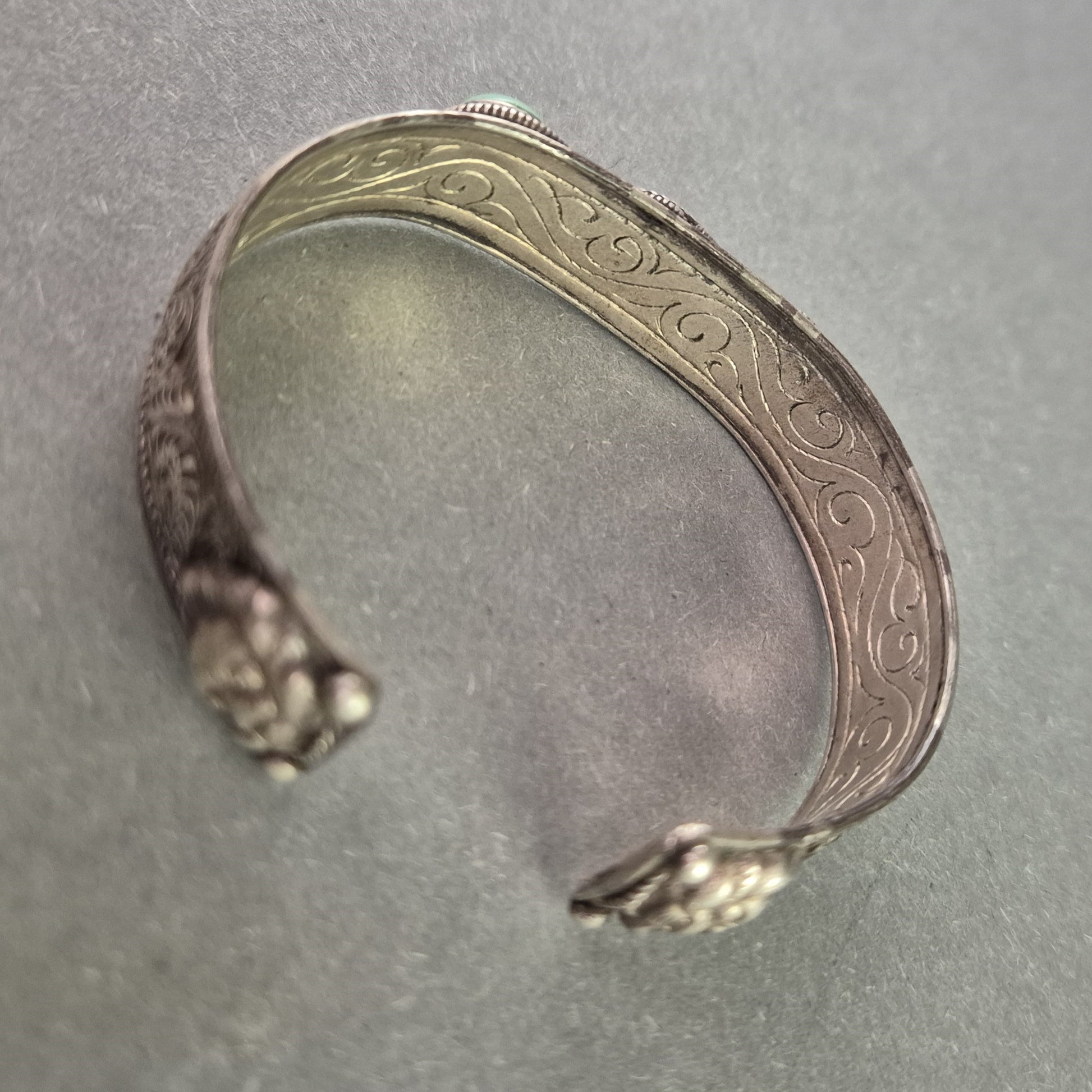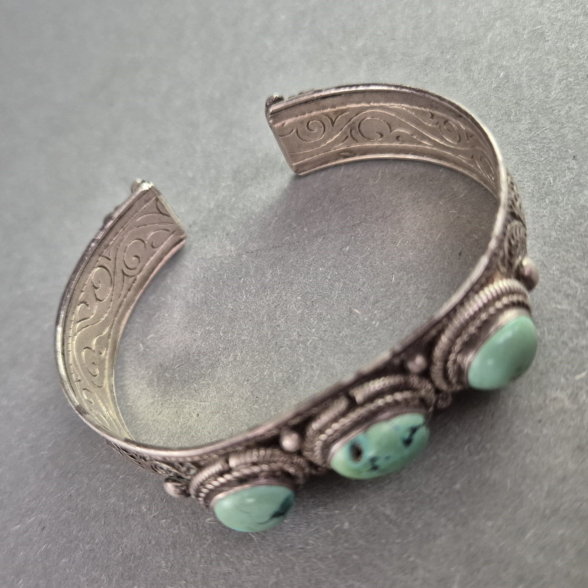 Dieser massiv gearbeitete Vintage-Armreif im offenen Design besticht durch seine ethnisch inspirierte Ornamentik und die aufwendig gravierte Oberfläche. Drei türkisfarbene Steine (vermutlich Türkis oder Imitation) zieren die Vorderseite des Reifs, eingefasst in kunstvolle Seilrahmungen. Das schwere Gewicht und die hochwertige Verarbeitung machen diesen Armschmuck zu einem auffälligen Statement-Piece.