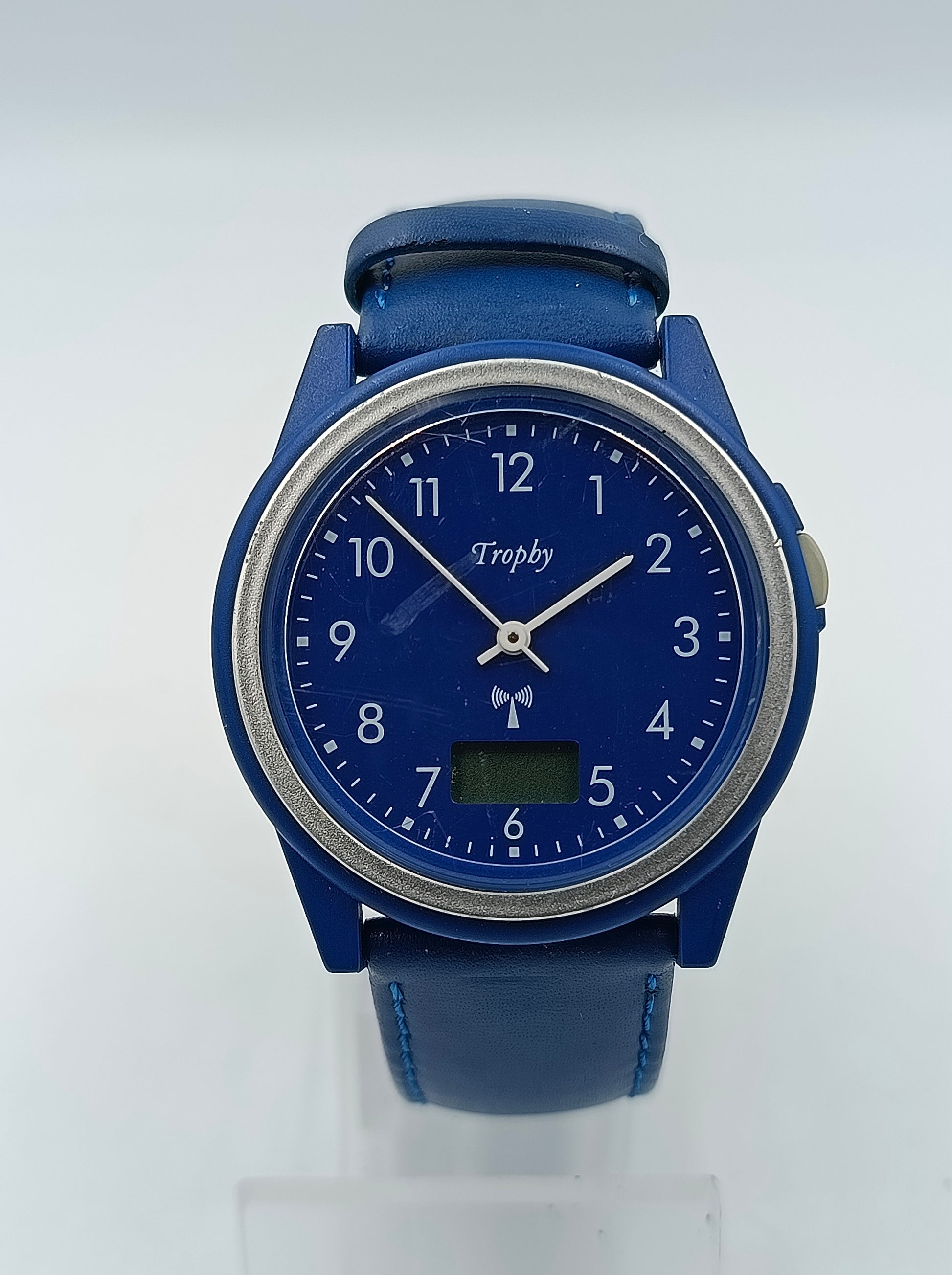 Moderne Armbanduhr der Marke Trophy in kräftigem Blau mit silberner Umrandung. Das minimalistische Design kombiniert klassische Zeiger mit einem kleinen digitalen Display – ideal für Alltag und Freizeit. Das Armband besteht aus weichem, angenehm zu tragendem Material.
