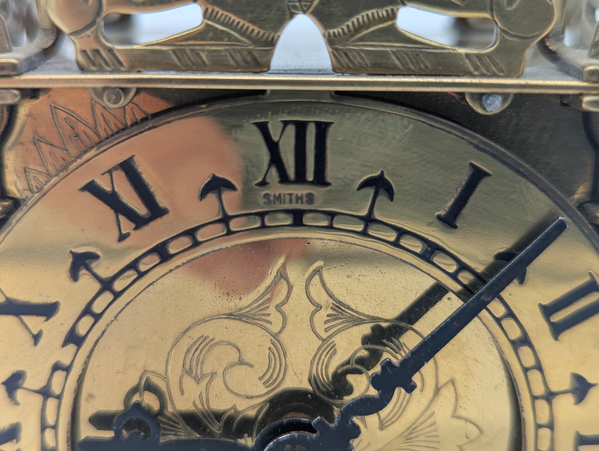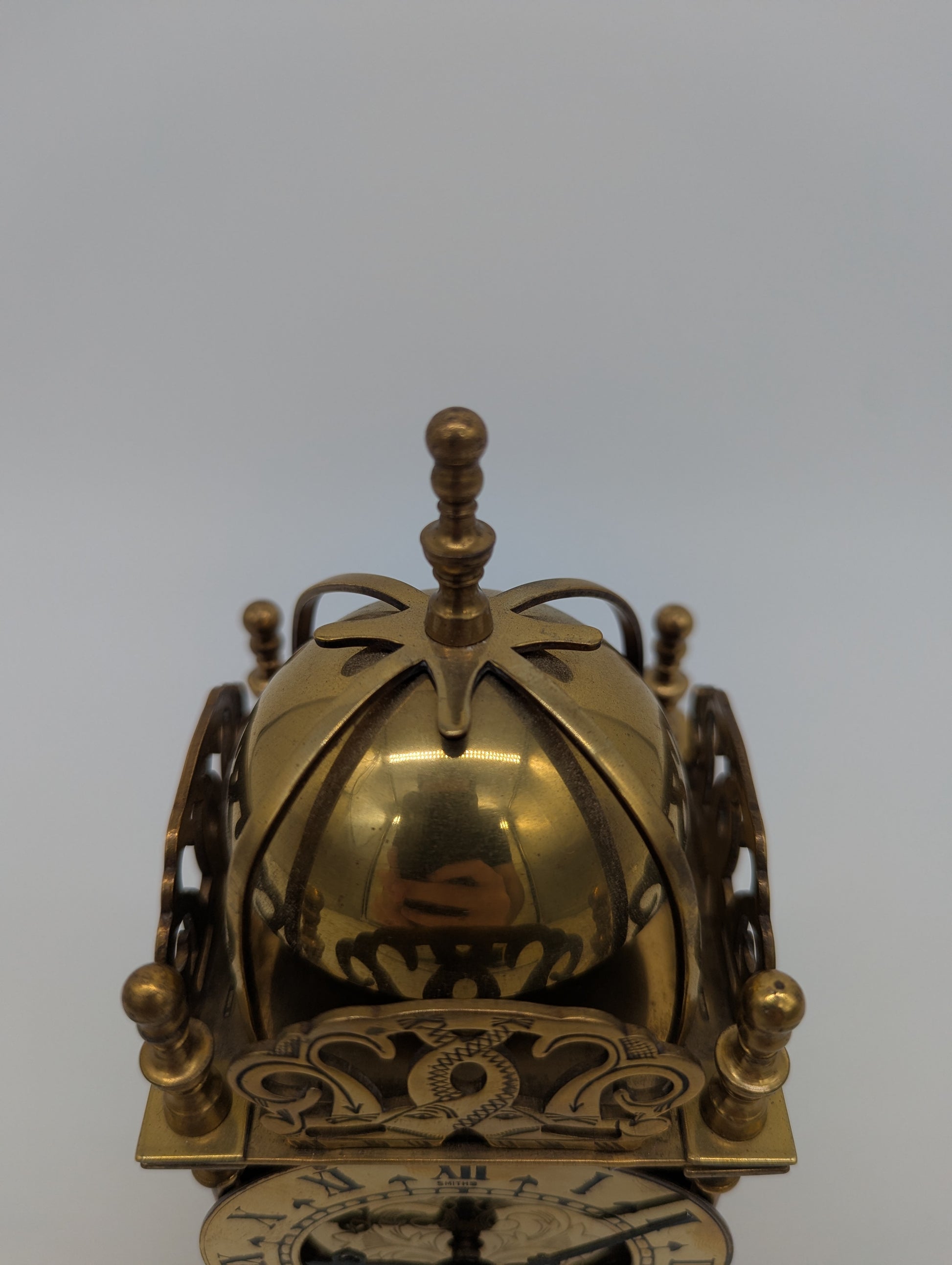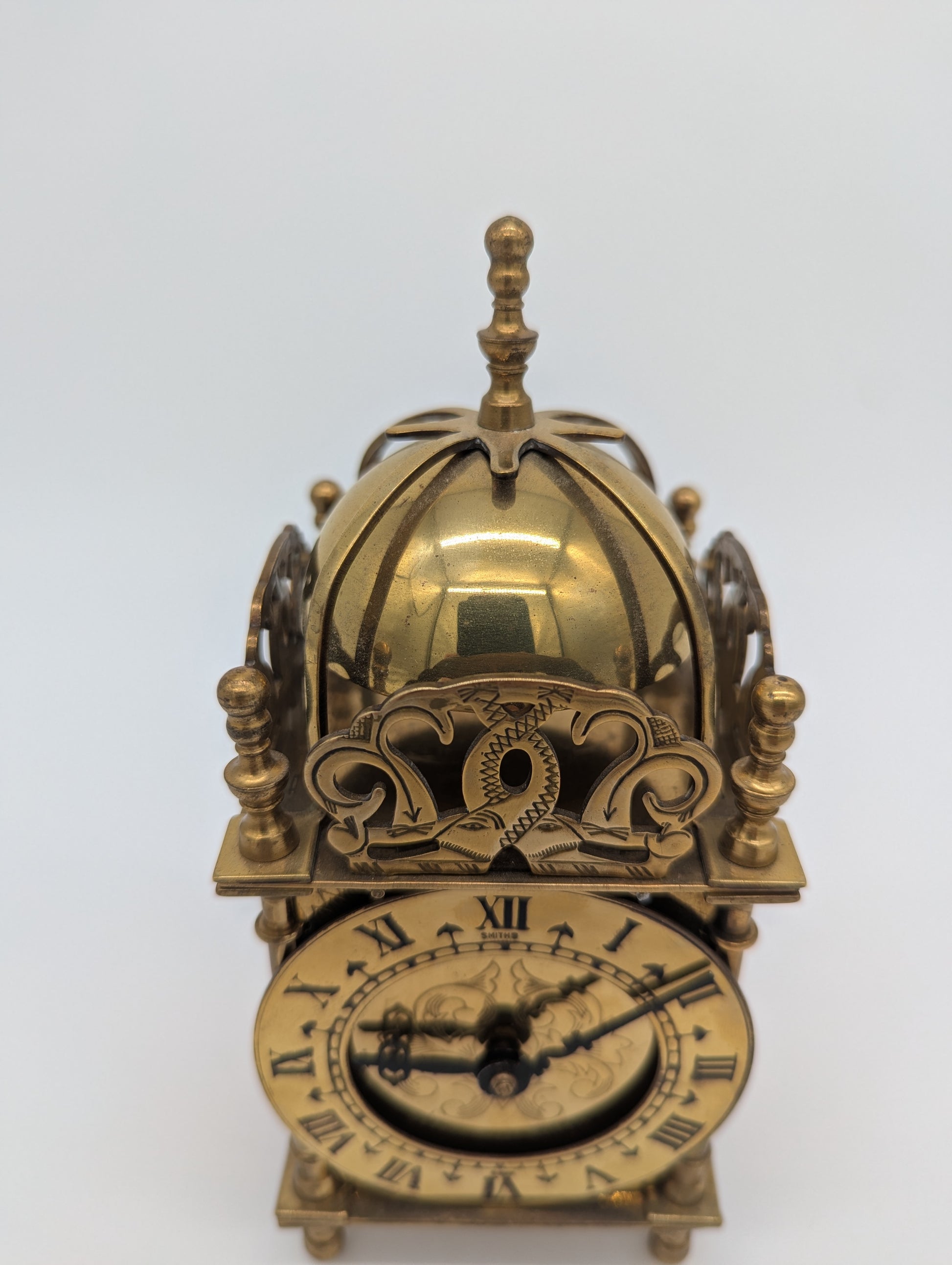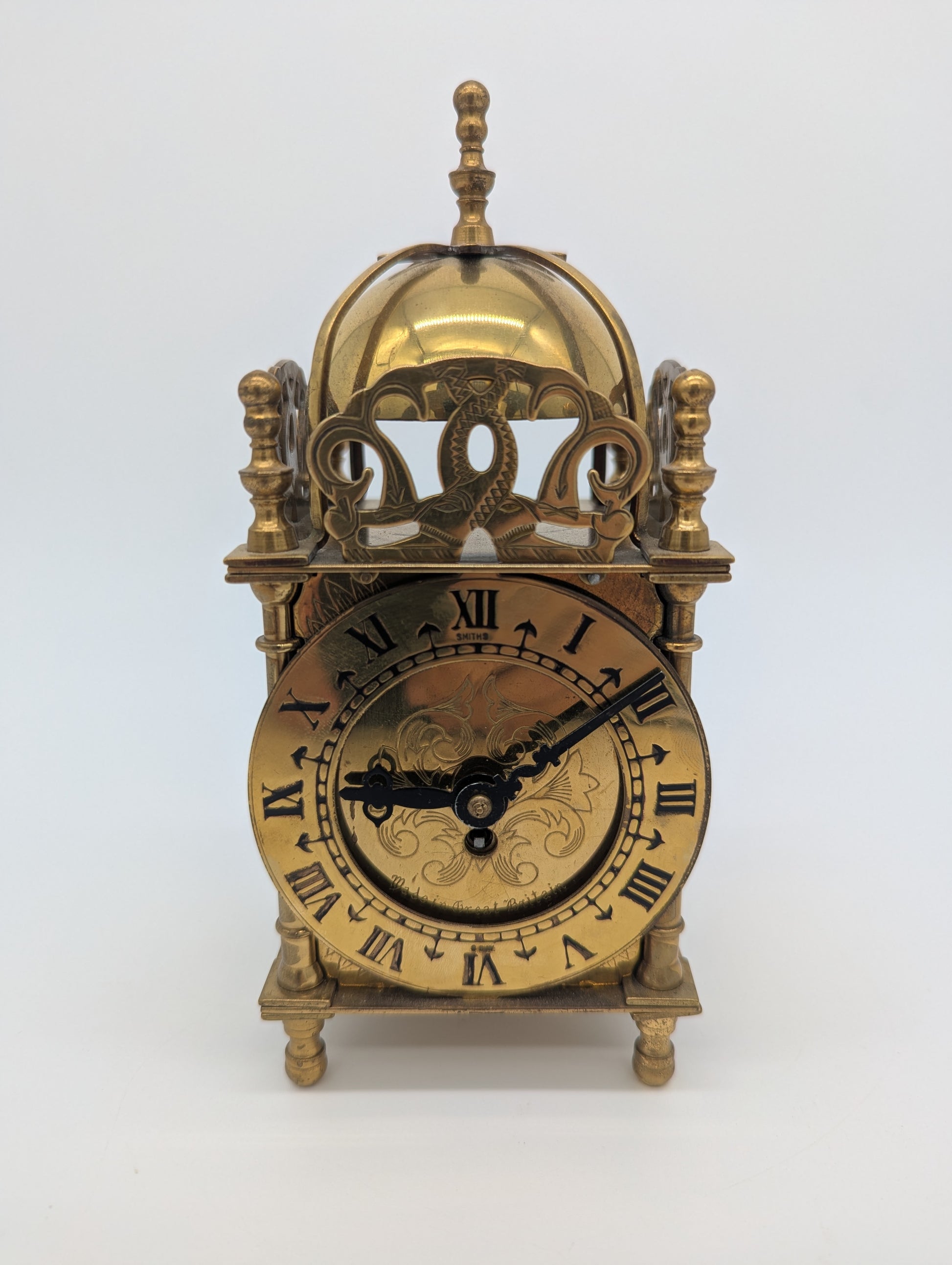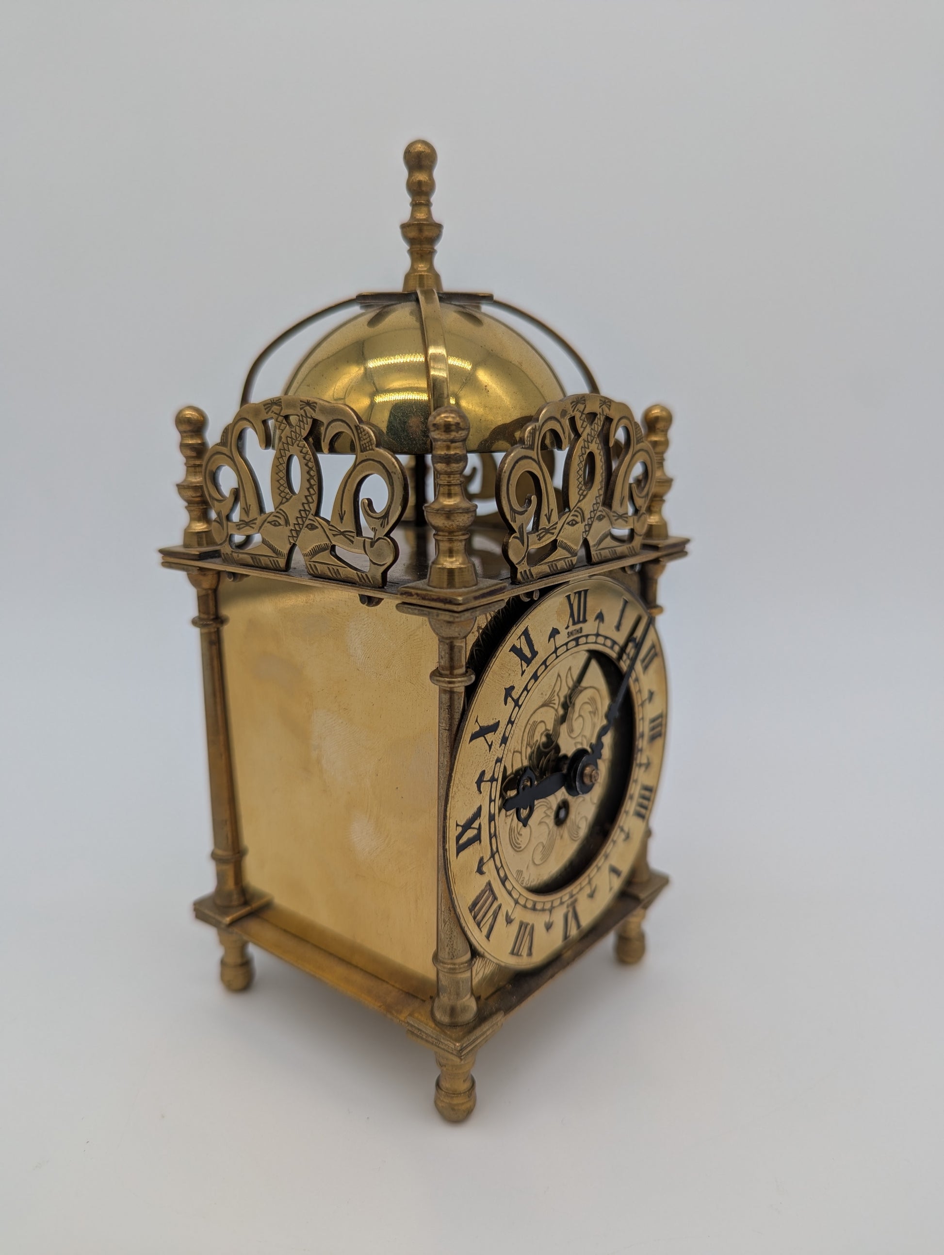 Angeboten wird eine elegante Tischuhr der britischen Marke Smiths. Die Uhr ist in einem klassischen Laternenuhr-Design gefertigt, mit reich verziertem Zifferblatt in Messingoptik und römischen Ziffern. Das Gehäuse ist kunstvoll gearbeitet und mit dekorativen Säulen sowie einer gewölbten Kuppel versehen.