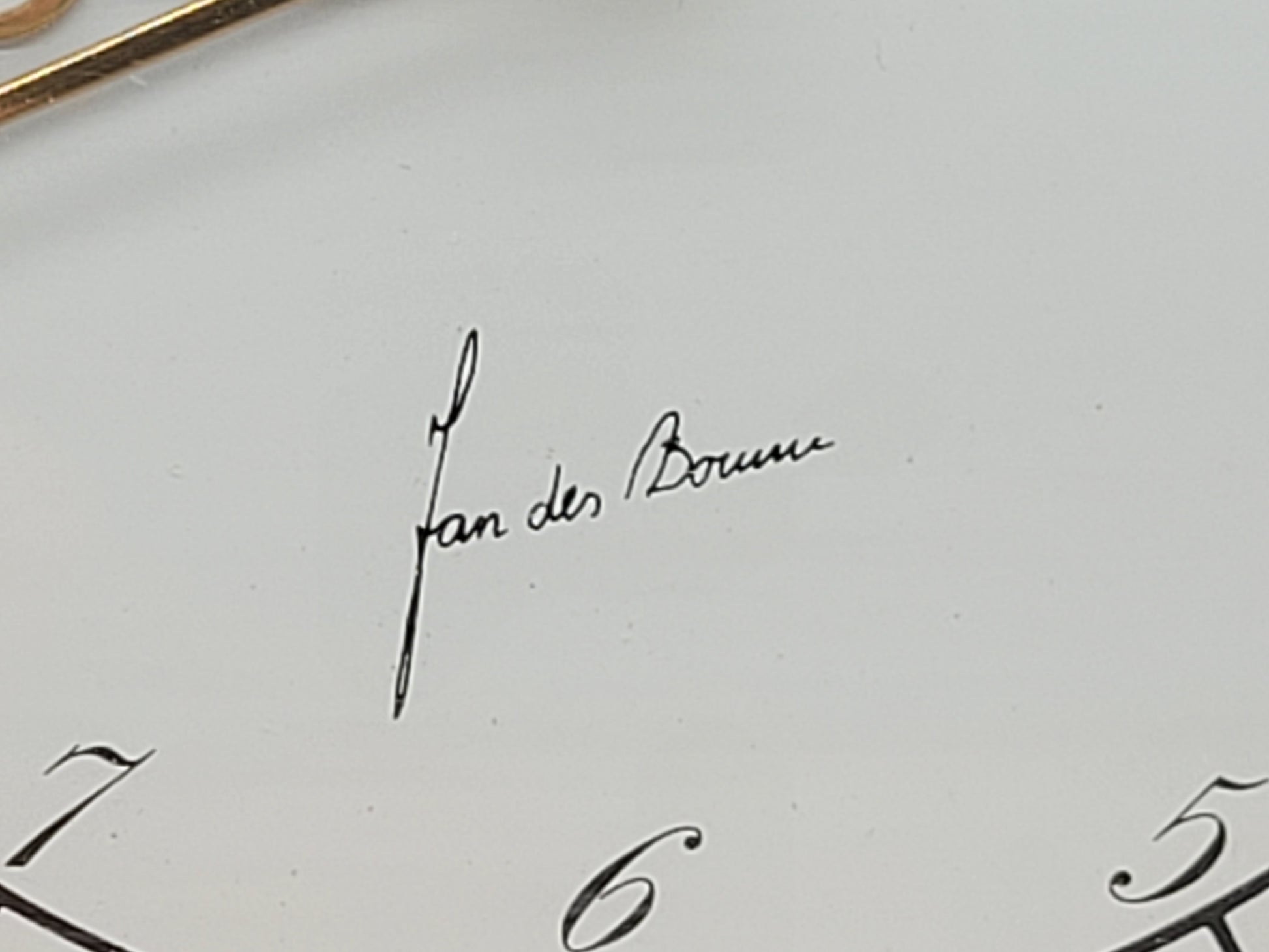 Auf dem Zifferblatt sowie auf dem Holzsockel befindet sich die Signatur: „Jan des Bouvrie“