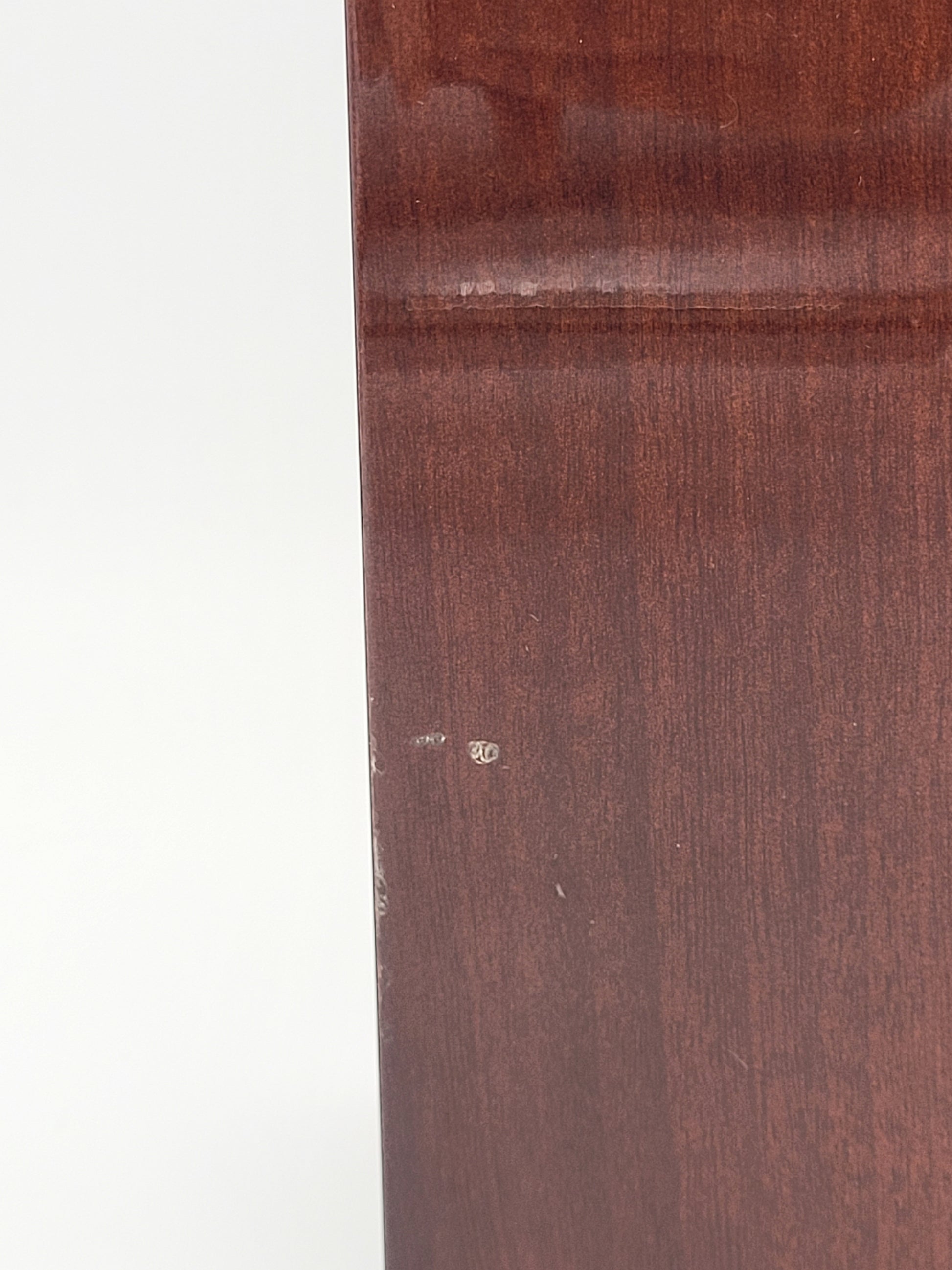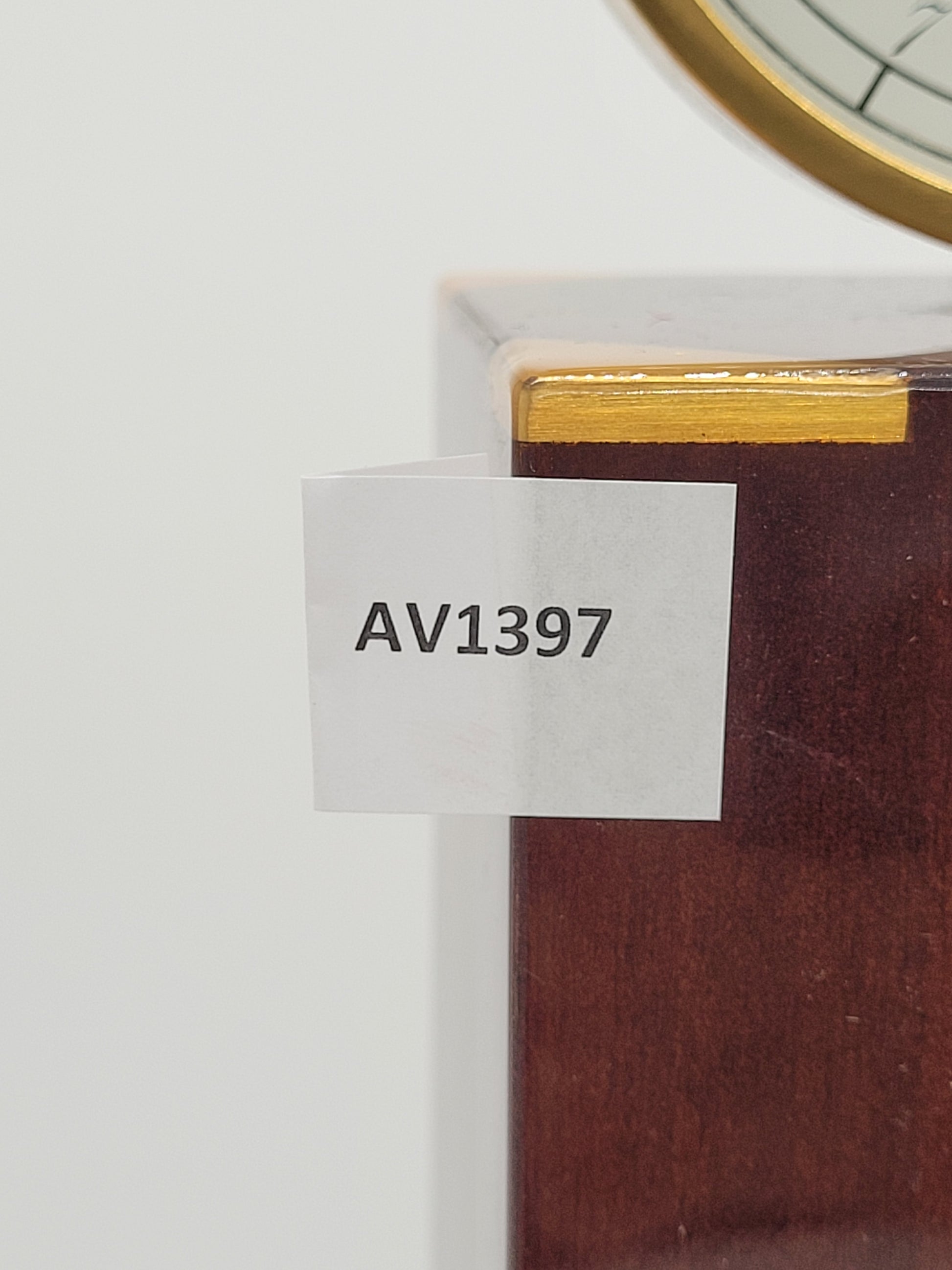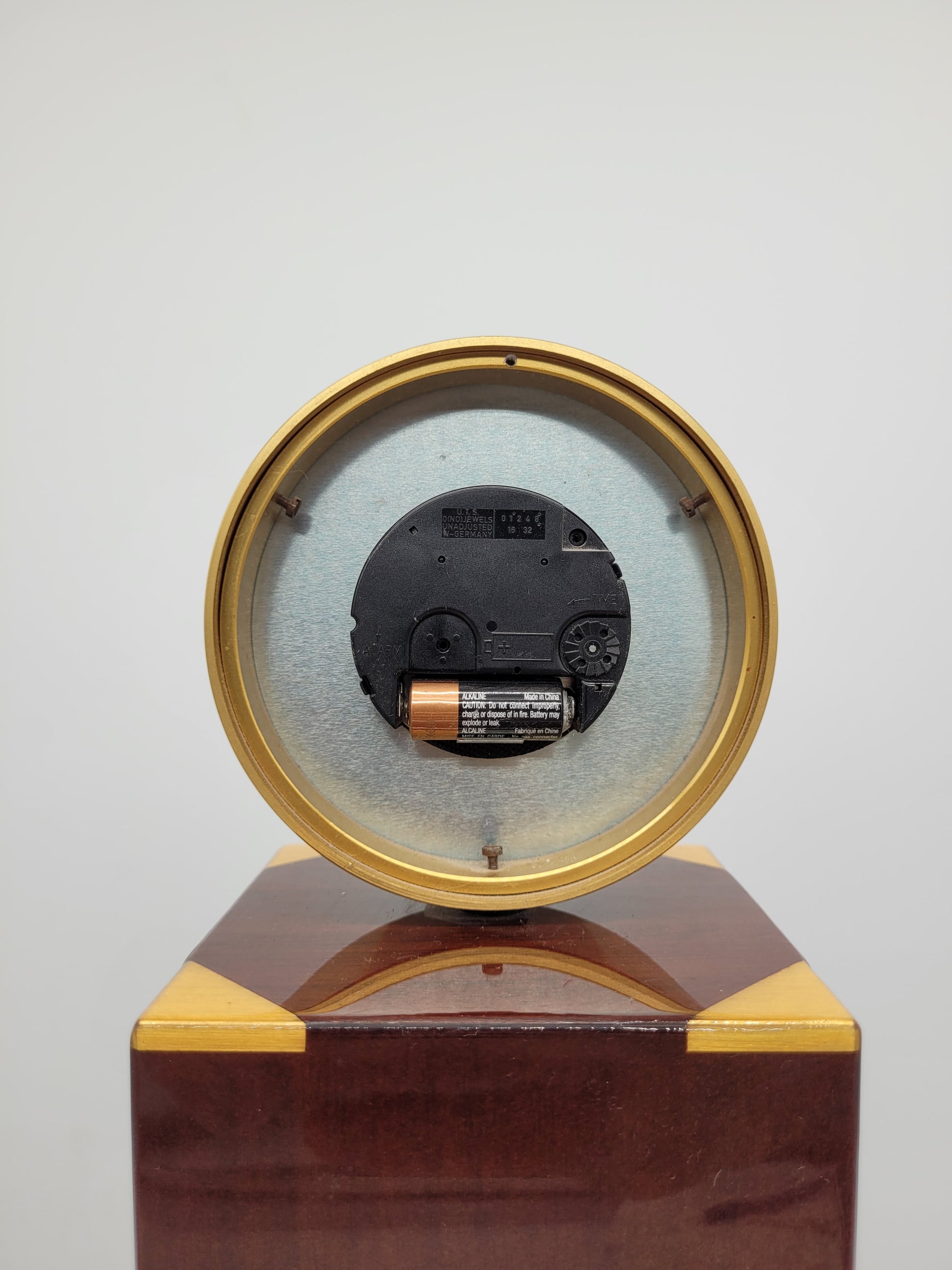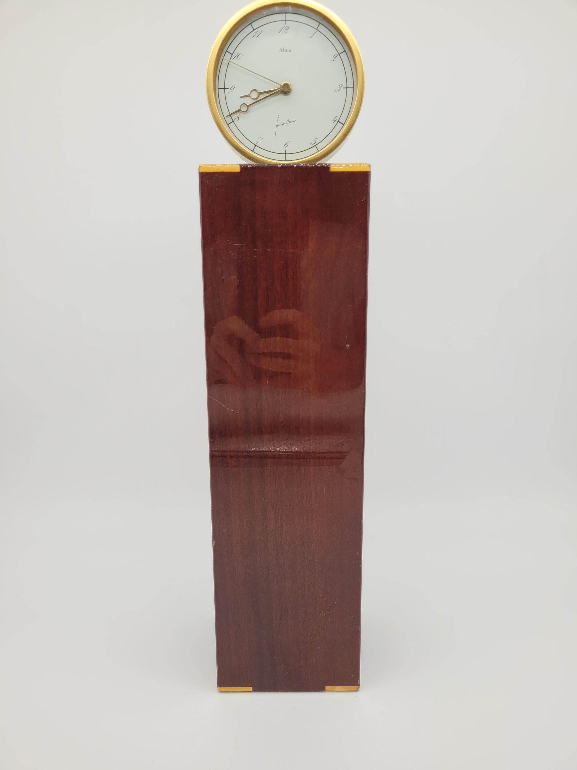 Diese elegante Tischuhr besticht durch ihr minimalistisches und zugleich edles Design. Das Gehäuse ist in Hochglanz-Holzoptik gefertigt, rechteckig und hoch aufragend, mit goldfarbenen Eckdetails. Auf der Oberseite sitzt das runde, goldgerahmte Uhrwerk mit weißem Zifferblatt. Die Uhr ist batteriebetrieben und mit feinen, filigranen Zeigern ausgestattet. Mit ihren Maßen von ca. 45 cm Höhe und 10 cm Breite wirkt sie wie ein stilvolles Wohn- und Büroaccessoire im modernen bis klassischen Ambiente. Der Zustand ist gut, mit leichten Gebrauchsspuren.