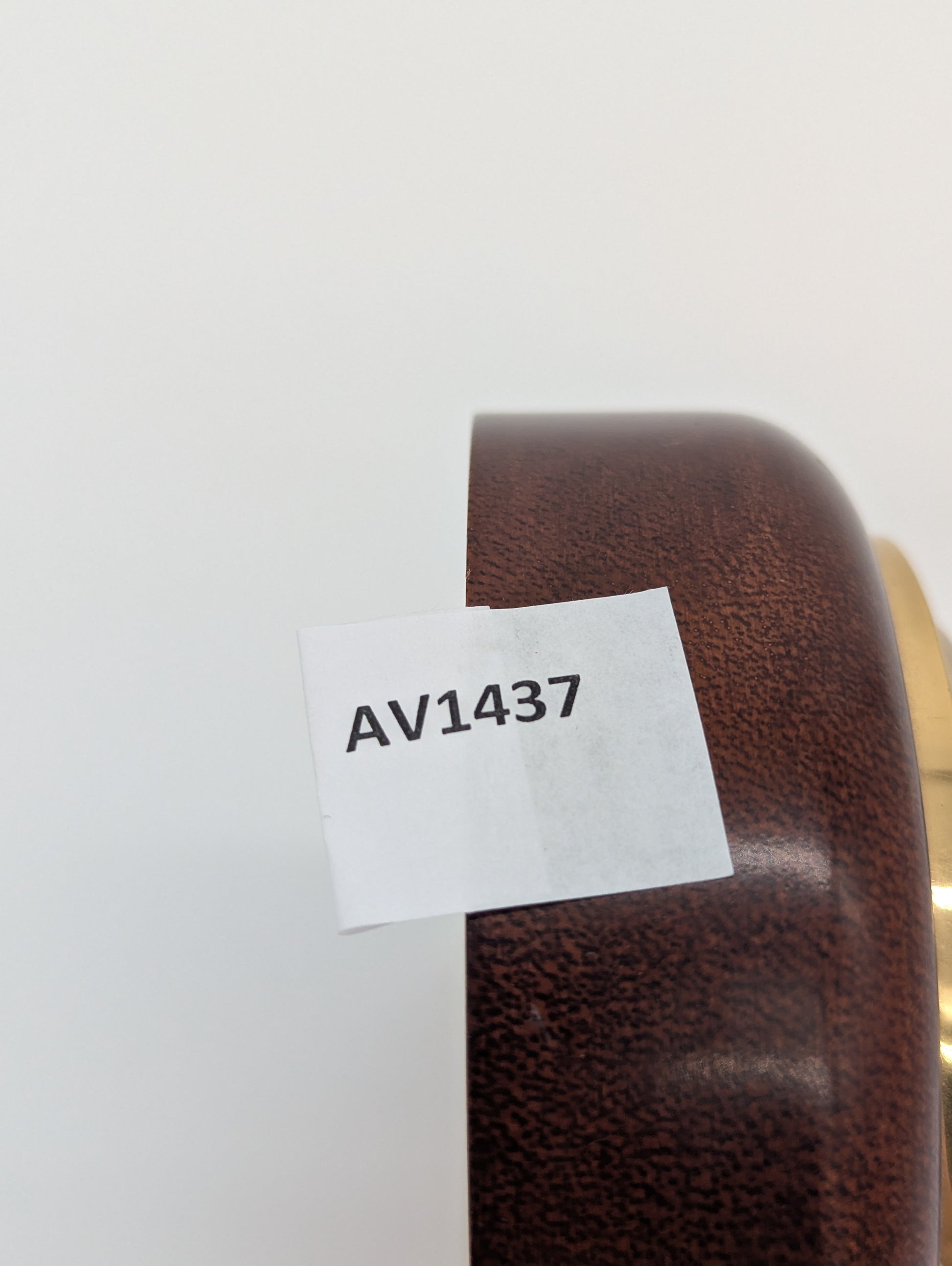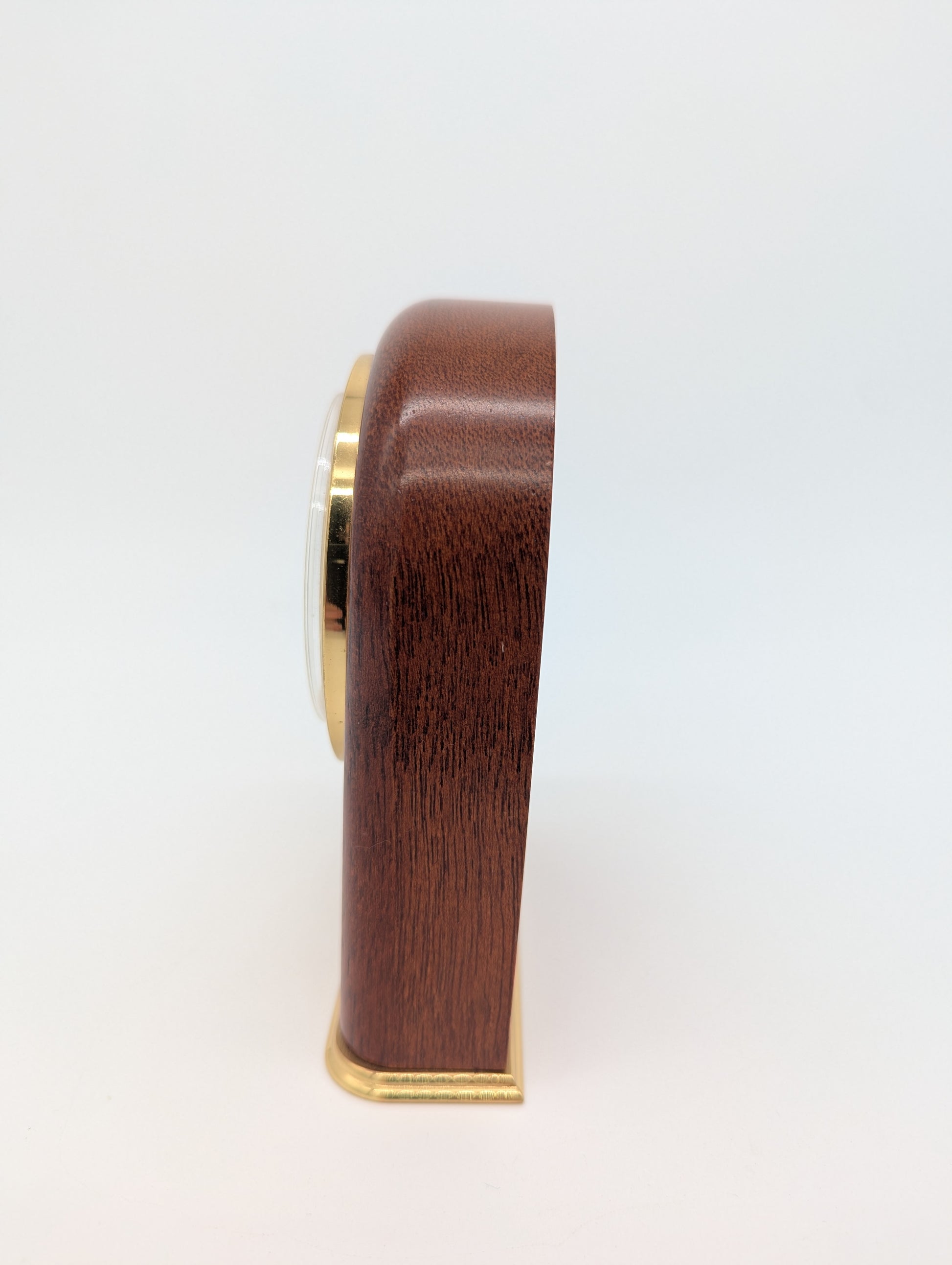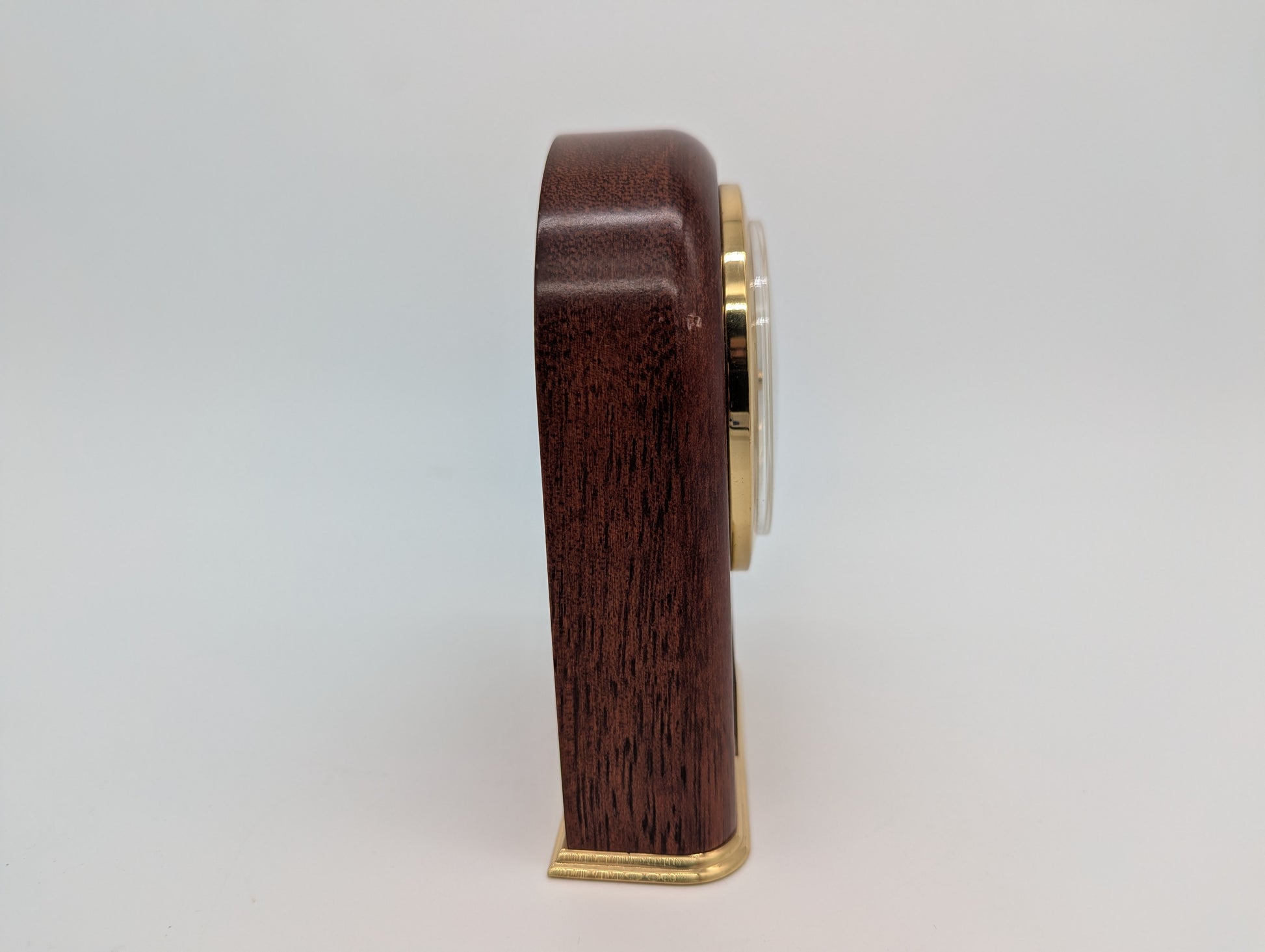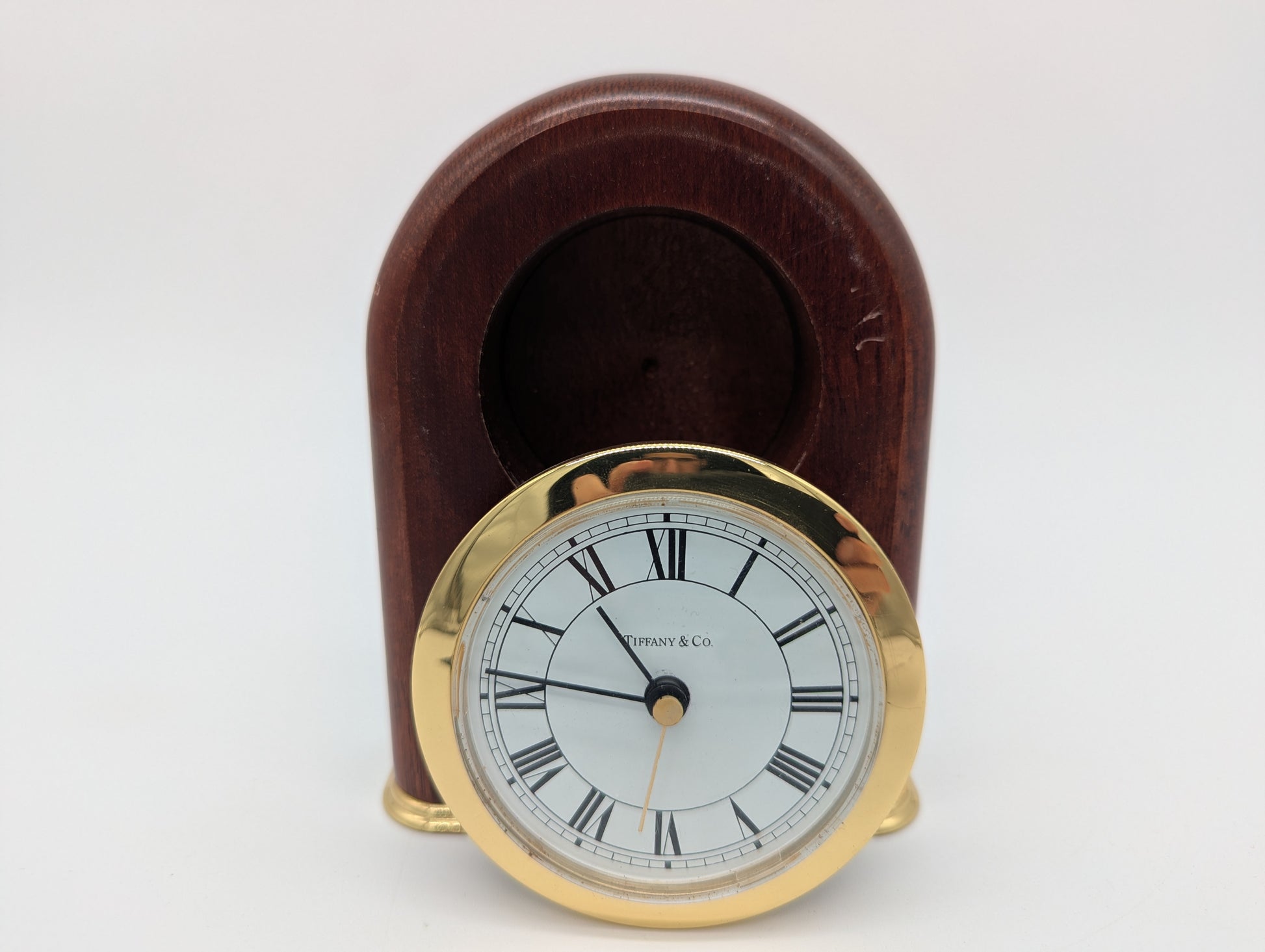 Diese elegante Tischuhr mit Tiffany & Co Aufdruck besticht durch ihr klassisches Design. Das Gehäuse ist in Holzoptik gehalten und wird von einem goldfarbenen Messingrahmen um das Zifferblatt ergänzt. Das weiße Zifferblatt ist mit schwarzen römischen Ziffern sowie einem Sekundenzeiger ausgestattet und sorgt für eine klare Ablesbarkeit.