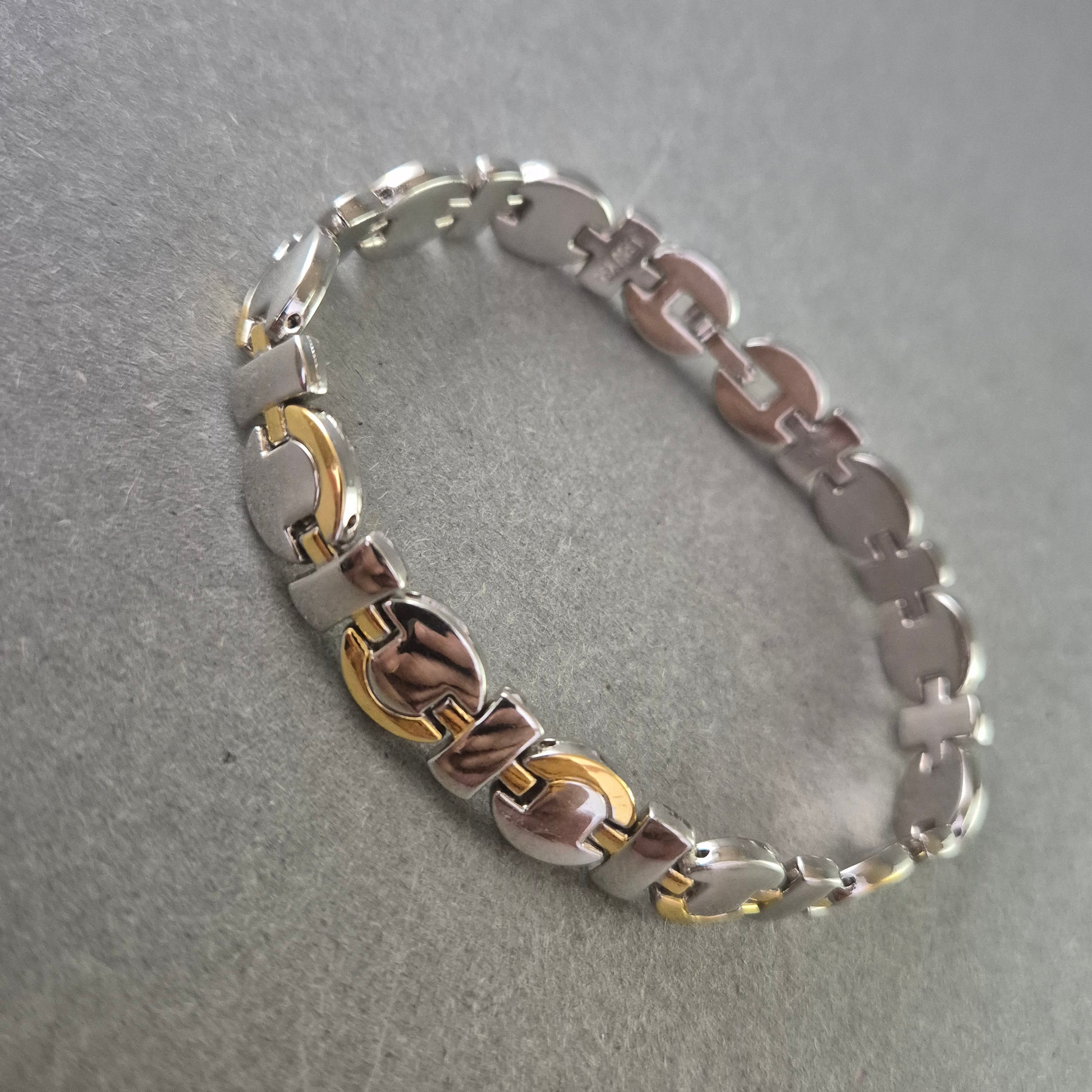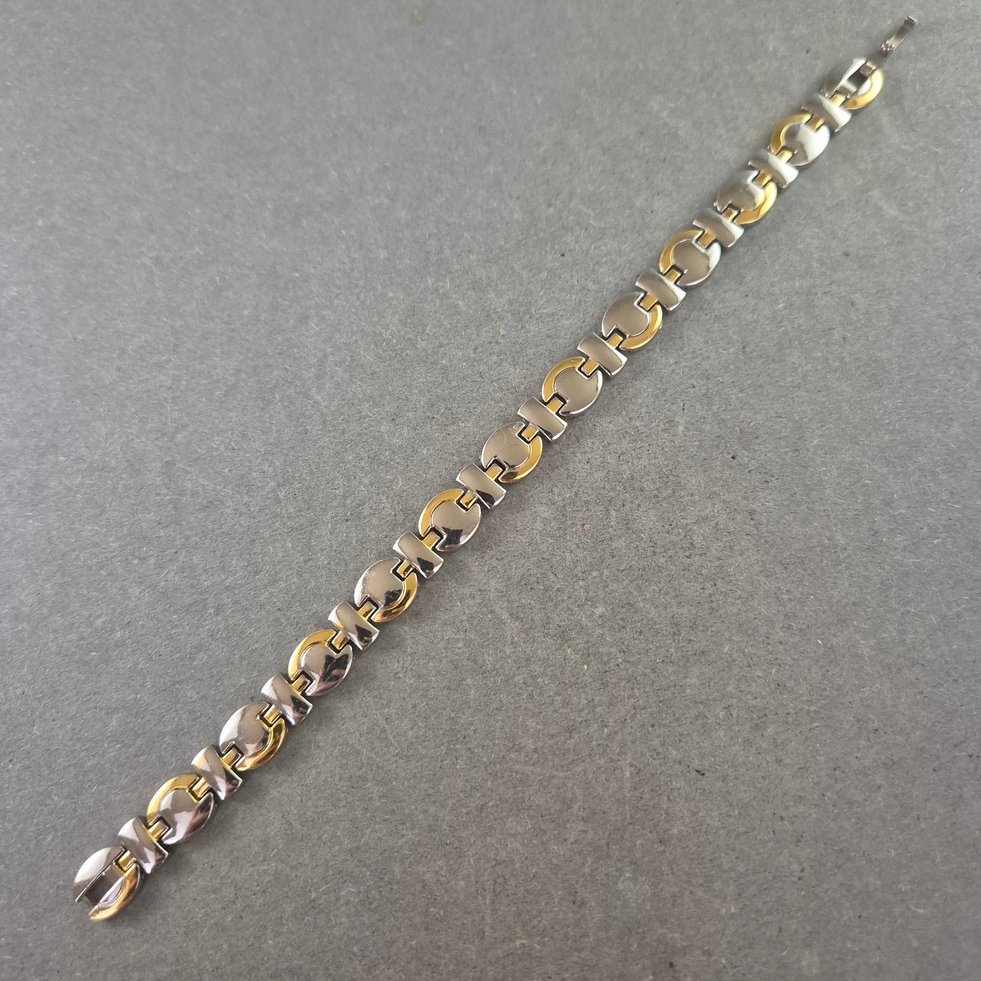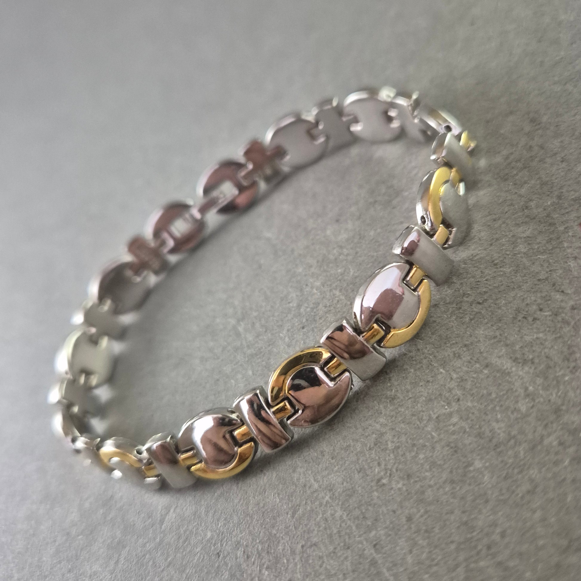 Dieses stilvolle Unisex Armband verbindet silberfarbene Edelstahlglieder mit goldfarbenen Akzenten und einem modernen Gliederdesign. Die polierte Oberfläche sorgt für einen eleganten Glanz, während die stabile Verarbeitung für Langlebigkeit steht. Dank seines zeitlosen Looks ist dieses Armband sowohl für Damen als auch für Herren ein vielseitiges Accessoire – ob im Alltag oder zu besonderen Anlässen.